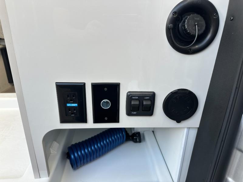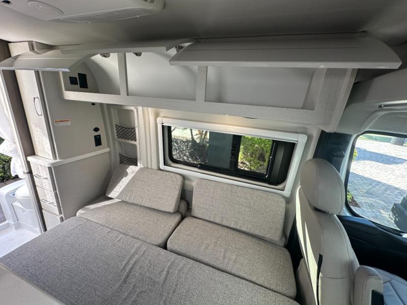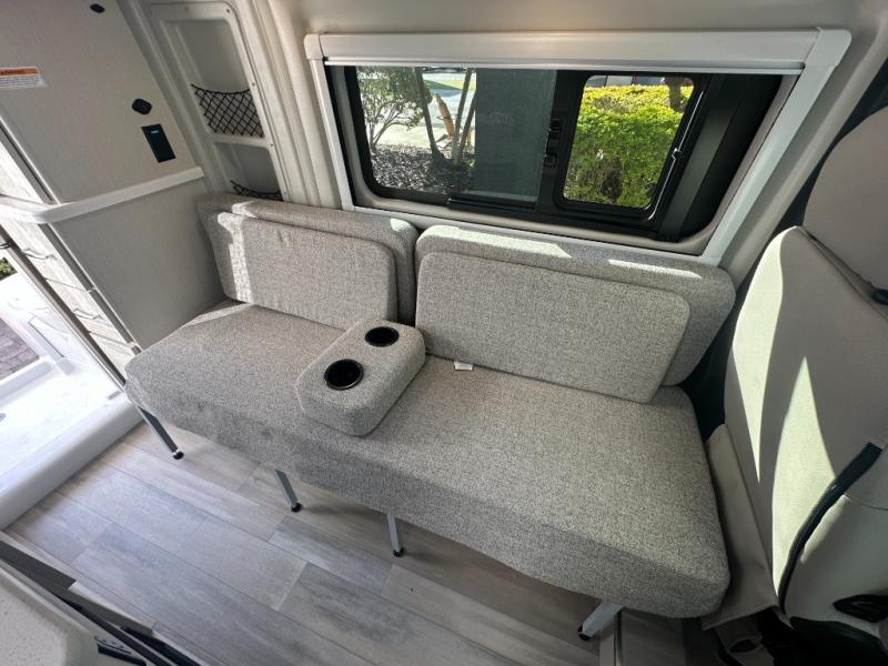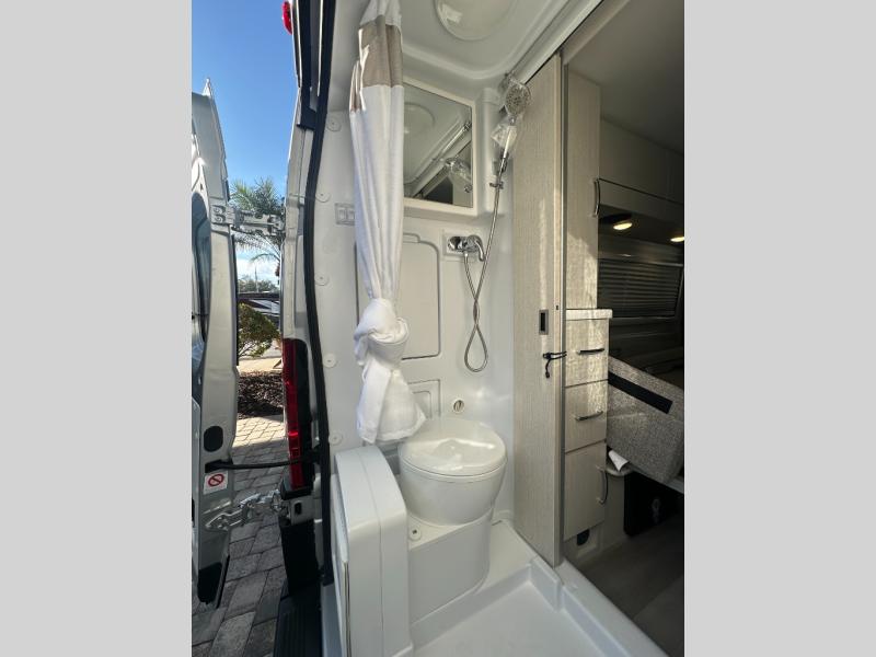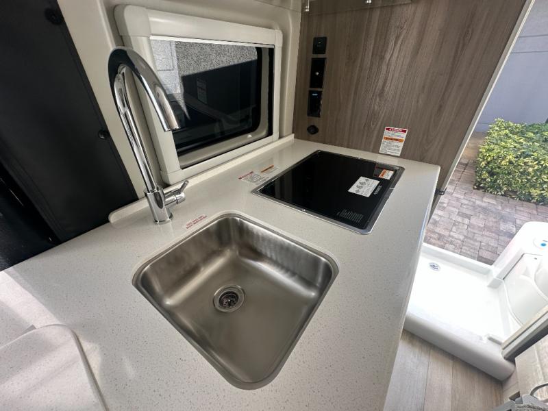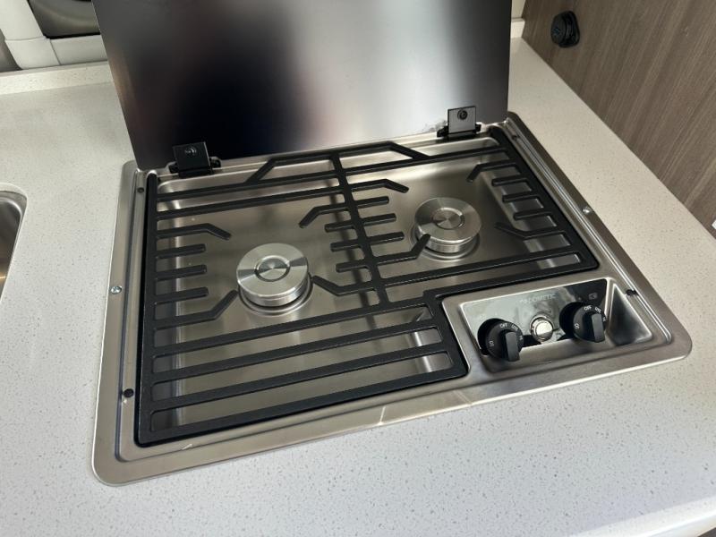 This coach is the perfect home on wheels for all your adventures. You will have everything you need, including a wet bath with a cassette toilet and pocket doors to save space. Once you have prepared breakfast on the two-burner gas cooktop, you can dine on the sofa with a removable table. This area can then be your sleeping space at night since the sofa converts into a 72" x 47" pull-out bed. Whether you're enjoying the fresh air let in by the large opening side windows, or you're sipping on a cold drink under the electric awning, you will love everything about this coach!