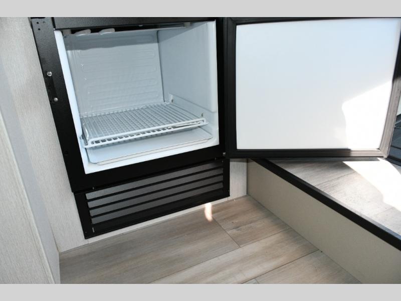 The galley is equipped with a portable induction cooktop, microwave oven, and a double-door refrigerator, giving you everything needed to prepare meals on the go. The wet bath provides full convenience with a cassette toilet, power vent, and deluxe shower curtain. Multiple opening windows, a screen door, and patio awning prep ensure you can enjoy the outdoors comfortably while staying protected from the elements.