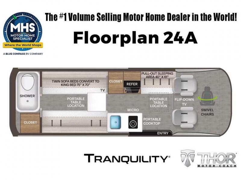 MSRP $239,071. New 2026 Thor Motor Coach Tranquility 24A AWD is built on the Mercedes-Benz ® Sprinter chassis. New features include the digital display with 10-inch monitor, heated remote mirrors and tilt & telescoping steering with dash control. The Tranquility is brought to life by a Mercedes-Benz diesel engine and is approximately 24 feet 4 inches in length. The Tranquility was made for compact and relaxed adventures with leatherette captain’s chairs with swivel and power patio awning with integrated LED lighting. Options include bike rack. This amazing new motor home also includes sliding screen door at entry way, multi-media touchscreen dash radio, back-up monitor, keyless entry system, aluminum wheels, stainless electric refrigerator, premium window shades, WiFi 4G Winegard Connect, solar panel with solar charge controller, lithium battery, 3000W Inverter and so much more. Shop a great selection of Mercedes Sprinter diesel Class B RVs all at 1 location! Choose from Midwest Automotive Designs Patriot – Patriot Cruiser – Forest River OGV V RV – V Cruise – Thor Motor Coach Tranquility – Entegra Coach Launch and more. We also buy and sell quality pre-owned models such as Airstream Interstate – Atlas – Jayco Terrain – Tiffin GH1 – Winnebago Revel – Adventure Wagon – Pleasure Way Plateau – Ascent – Roadtrek – Leisure Travel Wonder – Unity - Coachmen Galleria – Thor Sanctuary and much more. Visit MHSRV.com for our complete line-up and the sale prices that have made us the #1 volume selling motor home dealership in the world 12 years in a row! For additional details on this unit and our entire inventory including brochures, window sticker, videos, photos, reviews & testimonials as well as additional information about Motor Home Specialist and our manufacturers please visit us at MHSRV.com or call 800-335-6054. All sale prices include a multi-point inspection, interior & exterior wash, detail service and a fully automated high-pressure rain booth test and coach wash that is a standout service unlike that of any other in the industry. You will also receive a thorough coach orientation with an MHSRV technician, a night stay in our delivery park featuring landscaped and covered pads with full hook-ups and much more! Read Thousands upon Thousands of 5-Star Reviews at MHSRV.com and see what they had to say about their experience at Motor Home Specialist. MHSRV.com or 800-335-6054 - Why Pay More? Why Settle for Less?