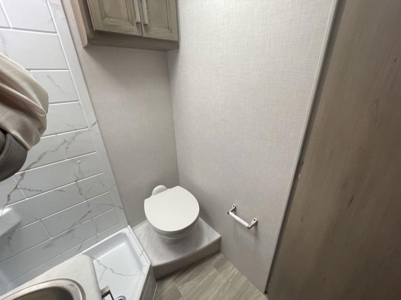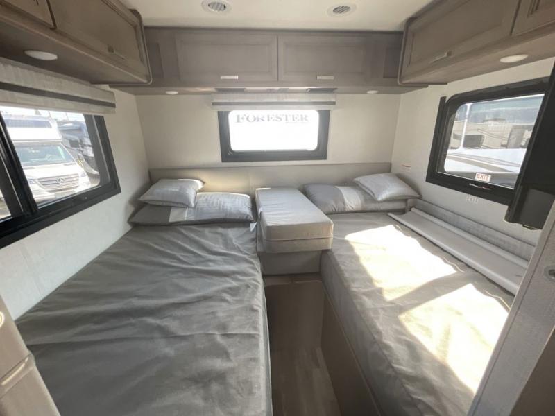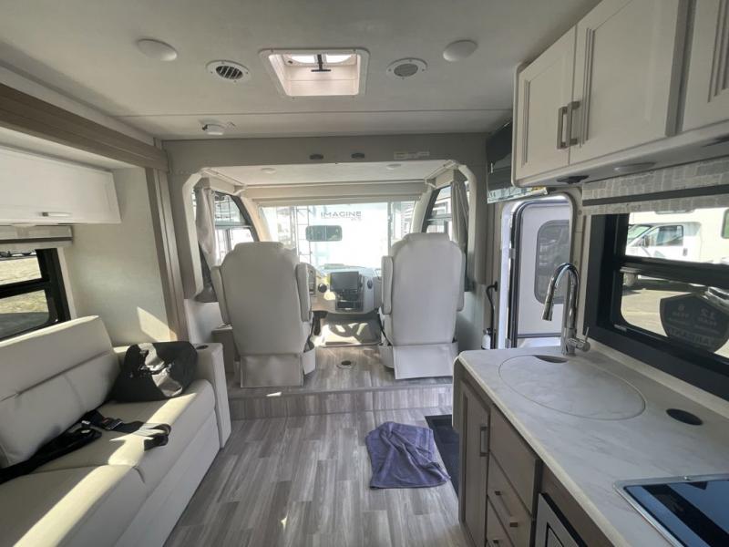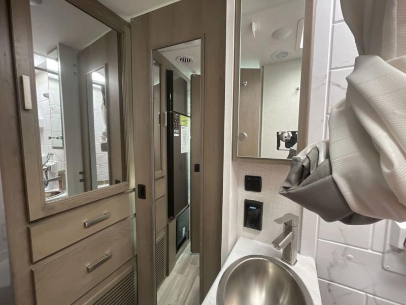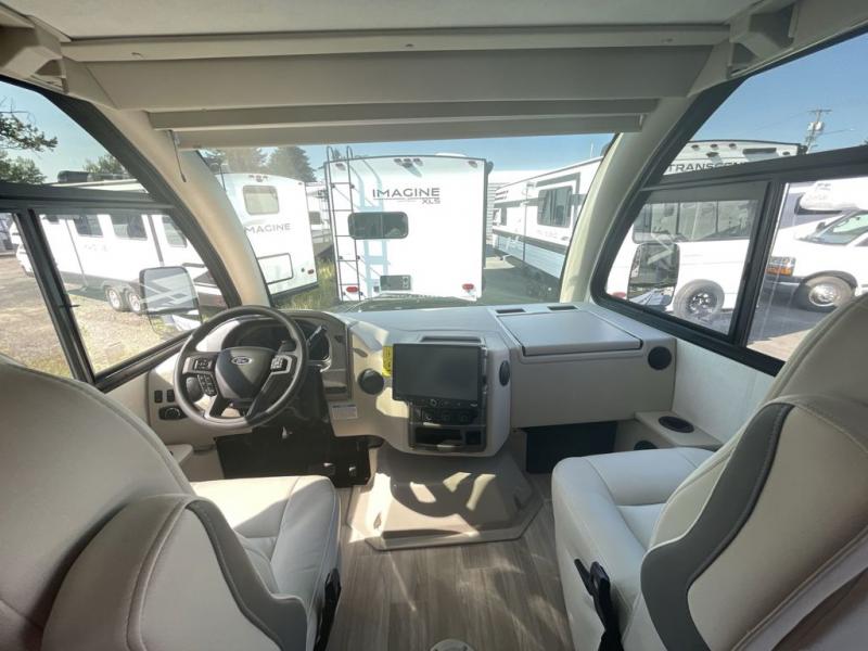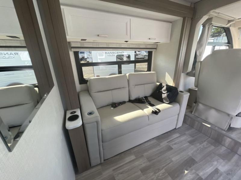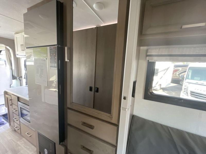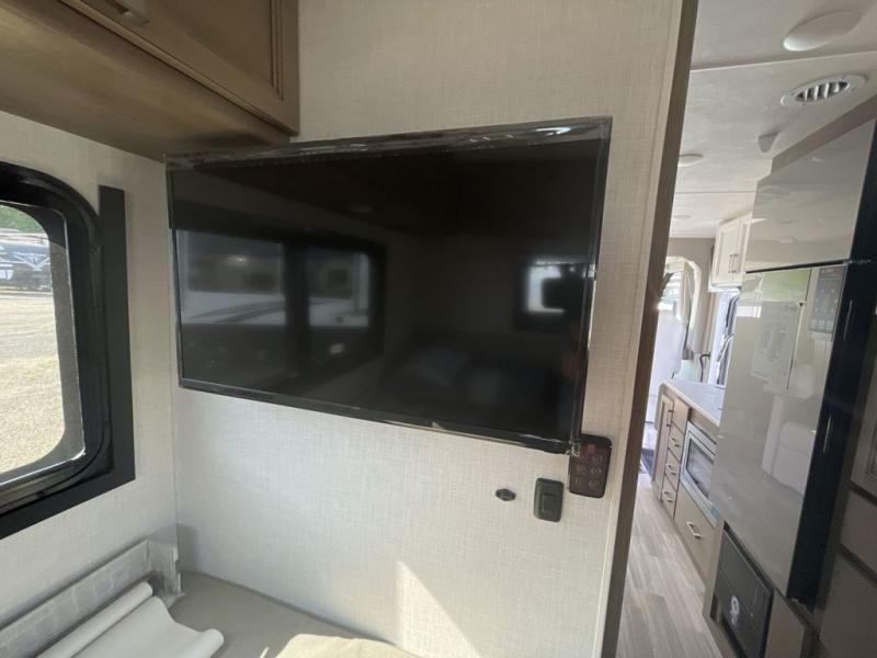 The front cab of this Vegas Class A gas motorhome is excellently appointed with a stow-away coffee table, reclining/swivel leatherette captain's chairs, and a 14" touchscreen dash radio with Bluetooth, Android Auto, and Apple CarPlay! A single slide holds the 68" sofa bed so that it isn't in your way as you walk back to the semi-private bedroom. The kitchen offers you a two burner cooktop to sauté veggies, and there are two Smart TVs to provide you with all the entertainment you could need. Within the full bath you'll find a 27" x 27" radius shower with a skylight, a stainless steel bath sink, and a 12V power bath vent to keep this space fresh.