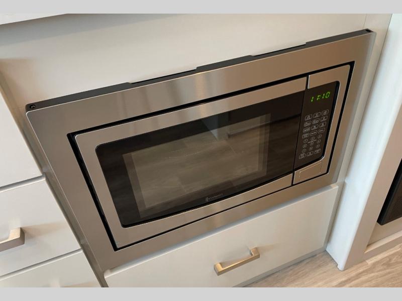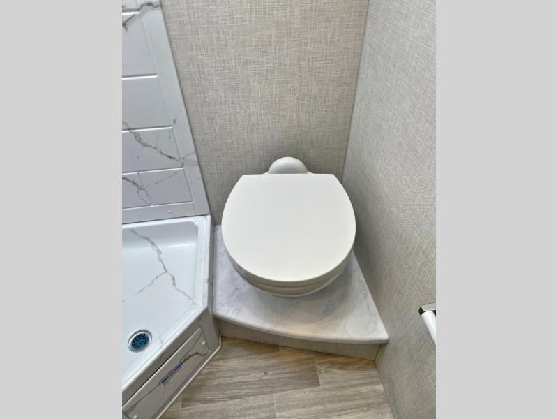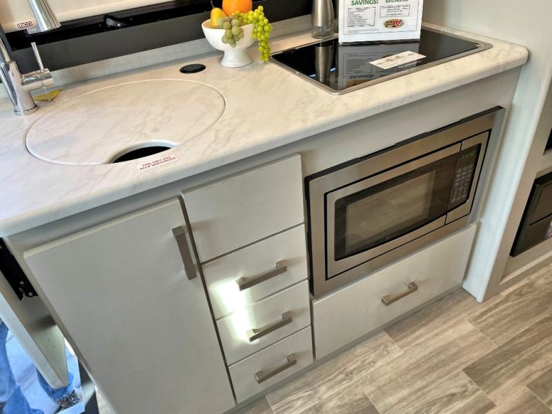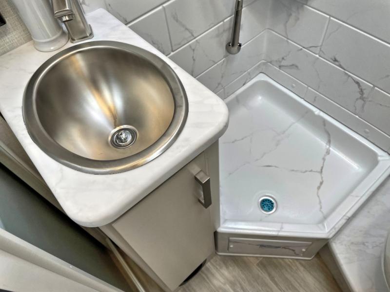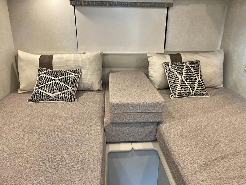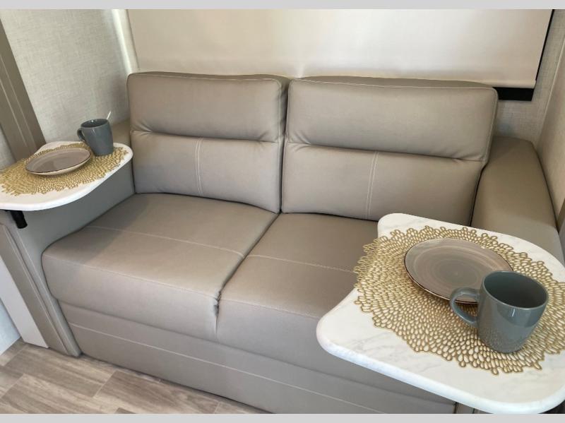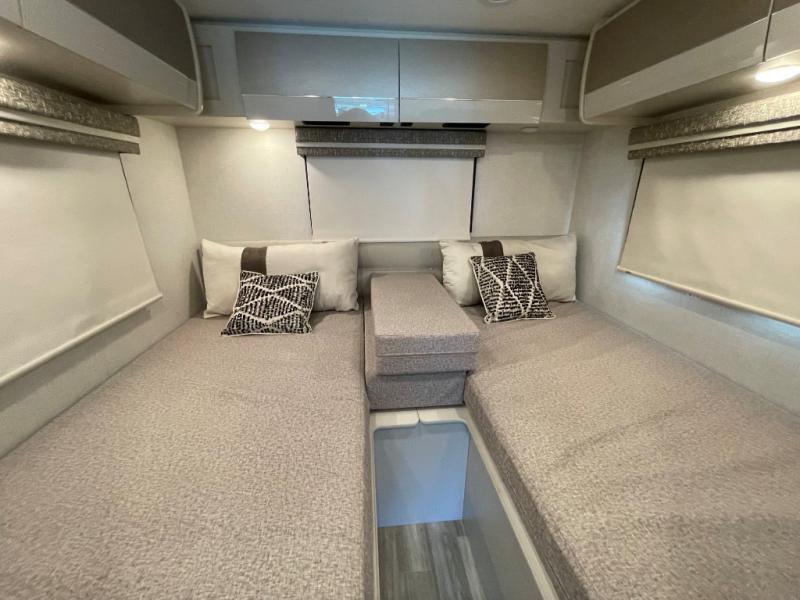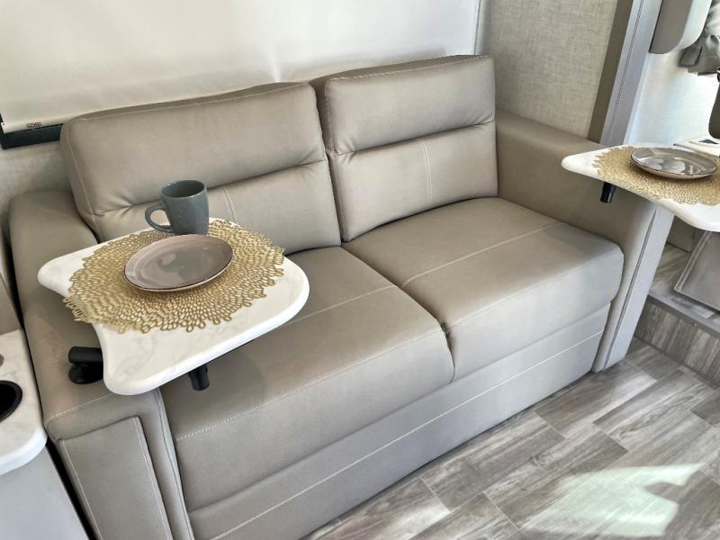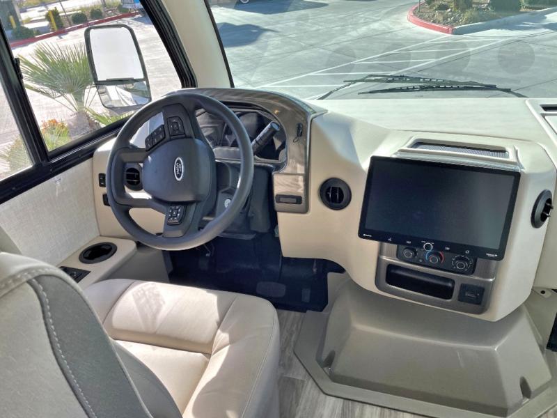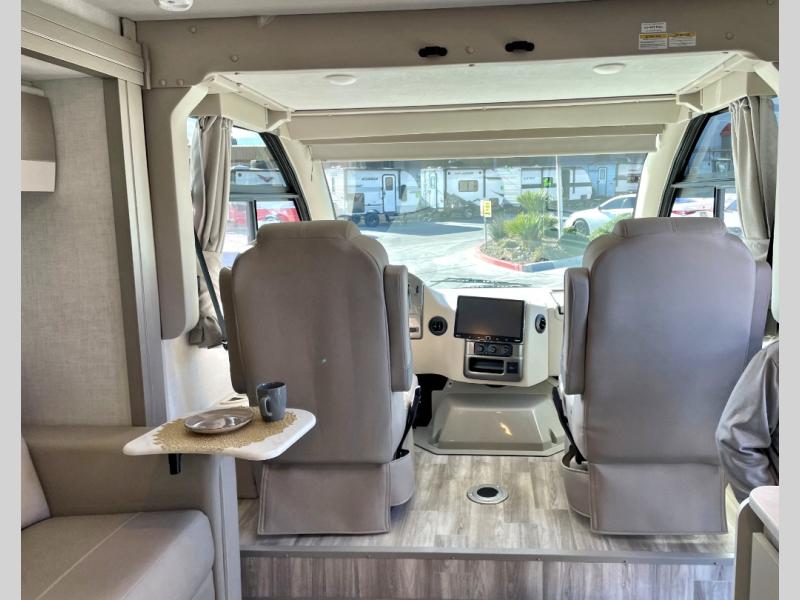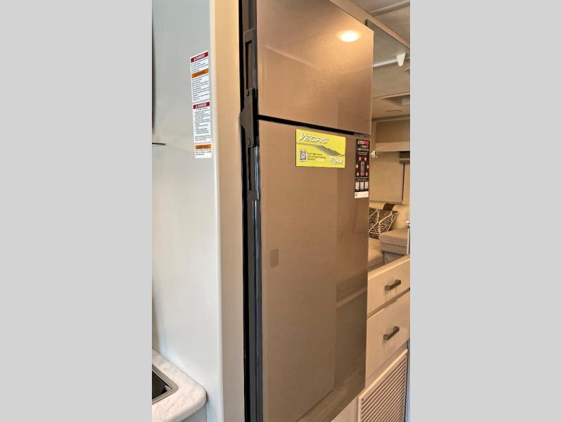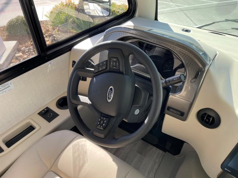 The front cab of this Vegas Class A gas motorhome is excellently appointed with a stow-away coffee table, reclining/swivel leatherette captain's chairs, and a 14" touchscreen dash radio with Bluetooth, Android Auto, and Apple CarPlay! A single slide holds the 68" sofa bed so that it isn't in your way as you walk back to the semi-private bedroom. The kitchen offers you a two burner cooktop to sauté veggies, and there are two Smart TVs to provide you with all the entertainment you could need. Within the full bath you'll find a 27" x 27" radius shower with a skylight, a stainless steel bath sink, and a 12V power bath vent to keep this space fresh.