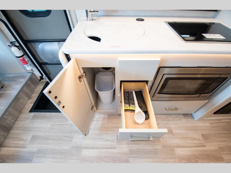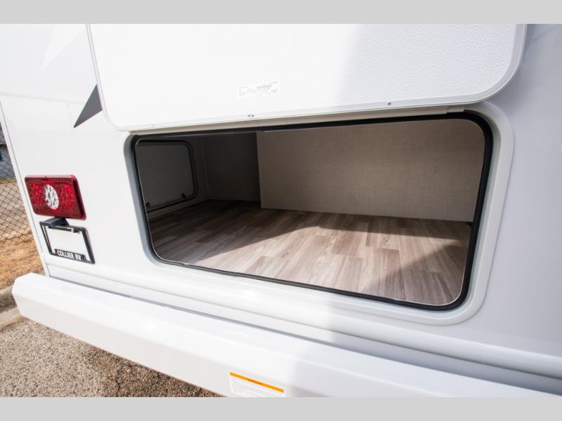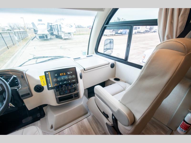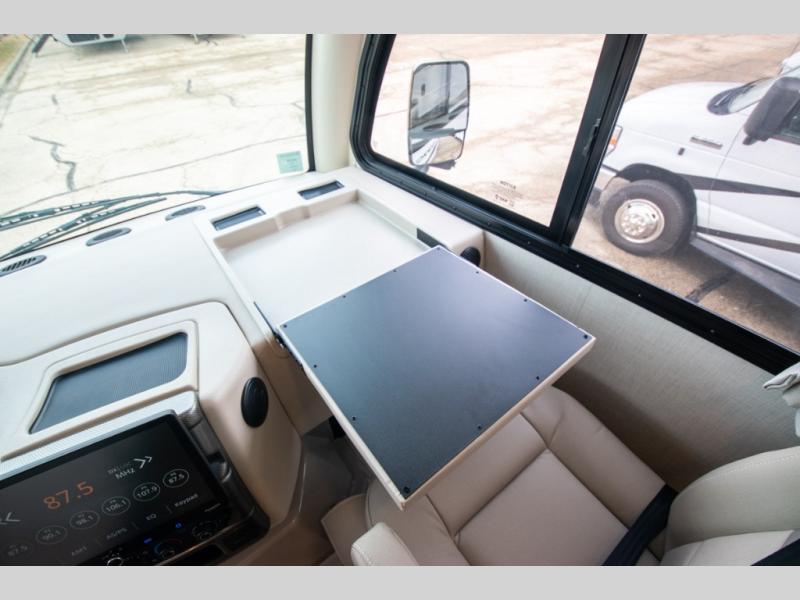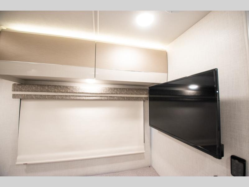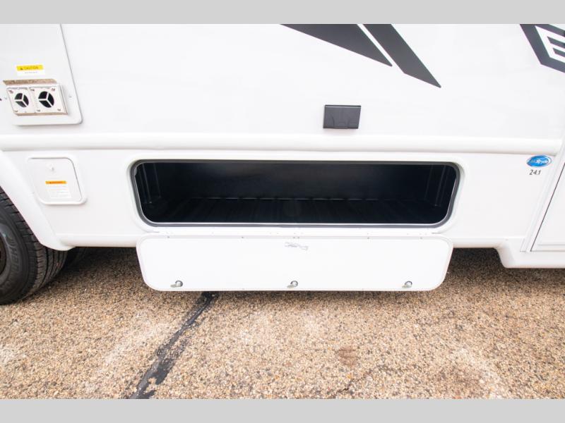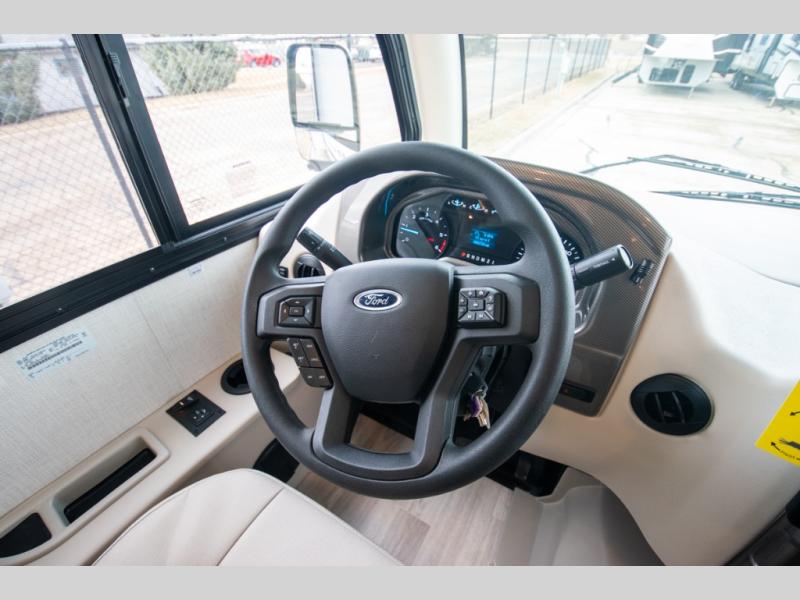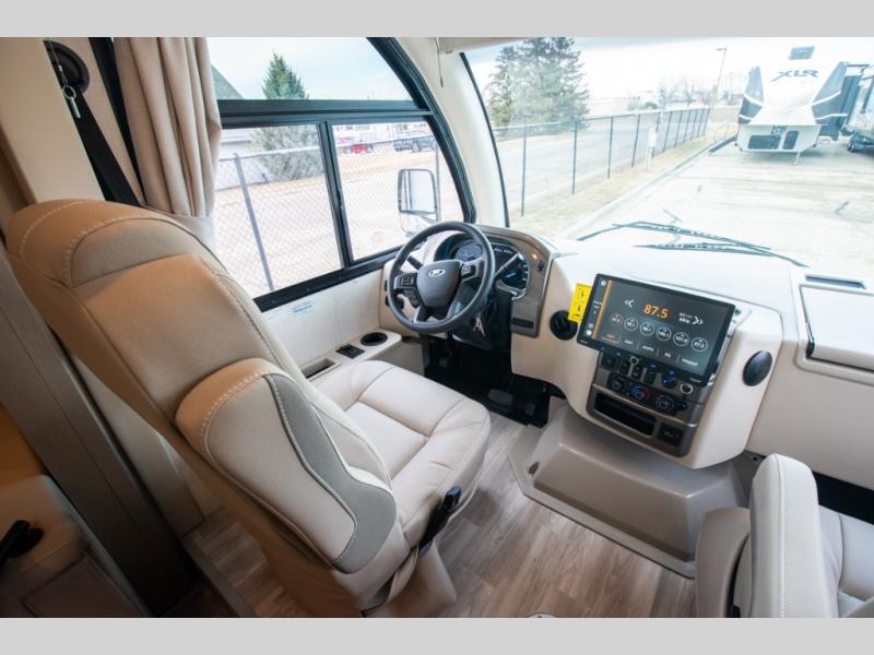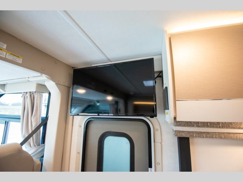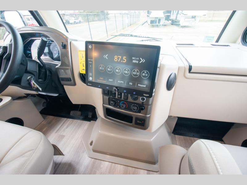 The front cab of this Vegas Class A gas motorhome is excellently appointed with a stow-away coffee table, reclining/swivel leatherette captain's chairs, and a 14" touchscreen dash radio with Bluetooth, Android Auto, and Apple CarPlay! A single slide holds the 68" sofa bed so that it isn't in your way as you walk back to the semi-private bedroom. The kitchen offers you a two burner cooktop to sauté veggies, and there are two Smart TVs to provide you with all the entertainment you could need. Within the full bath you'll find a 27" x 27" radius shower with a skylight, a stainless steel bath sink, and a 12V power bath vent to keep this space fresh.