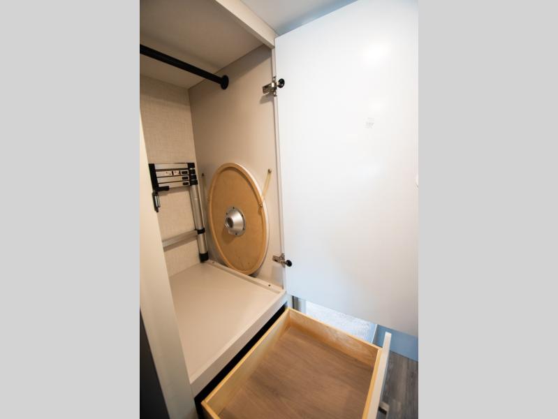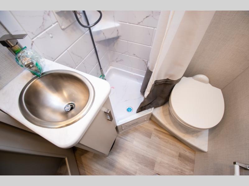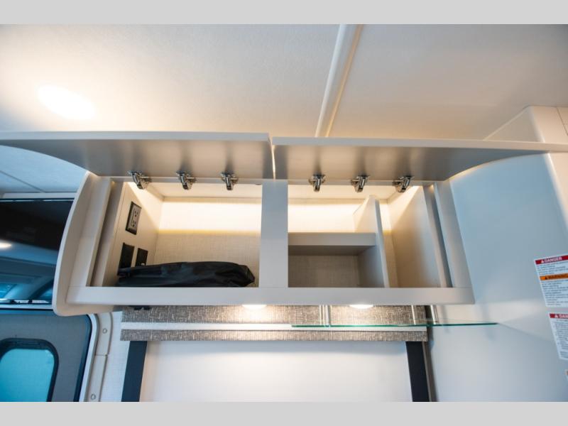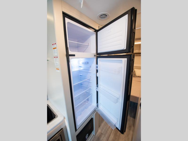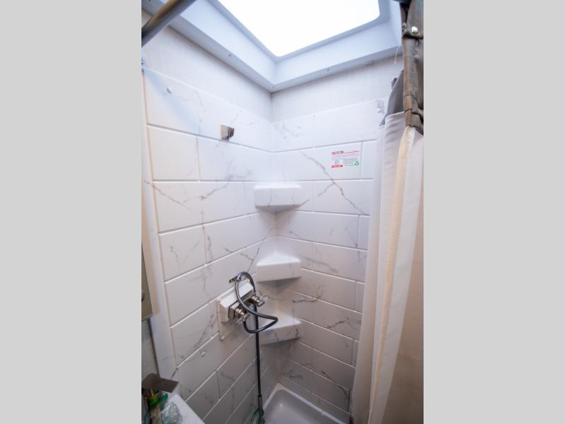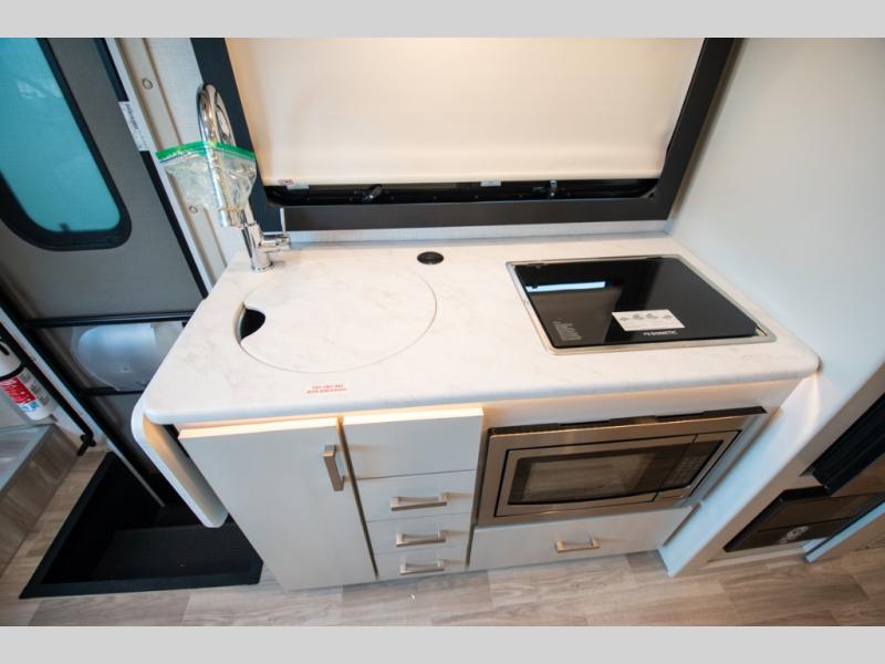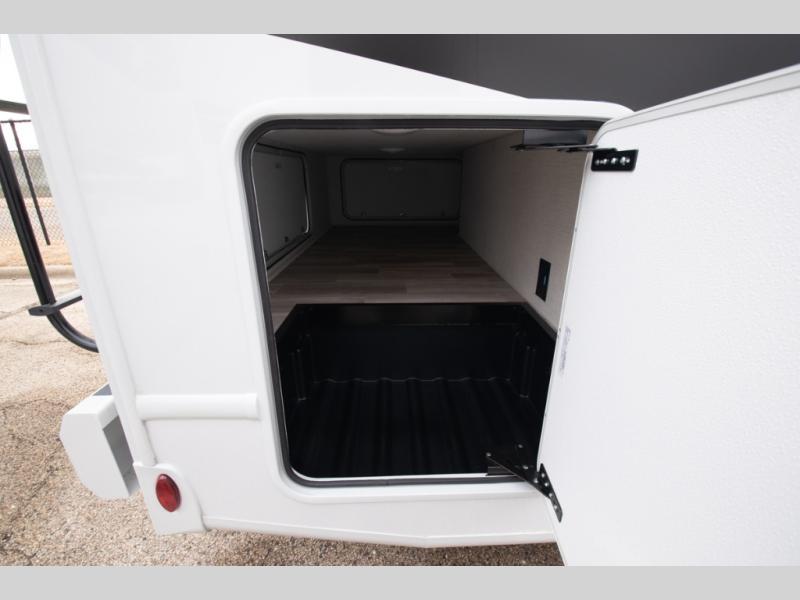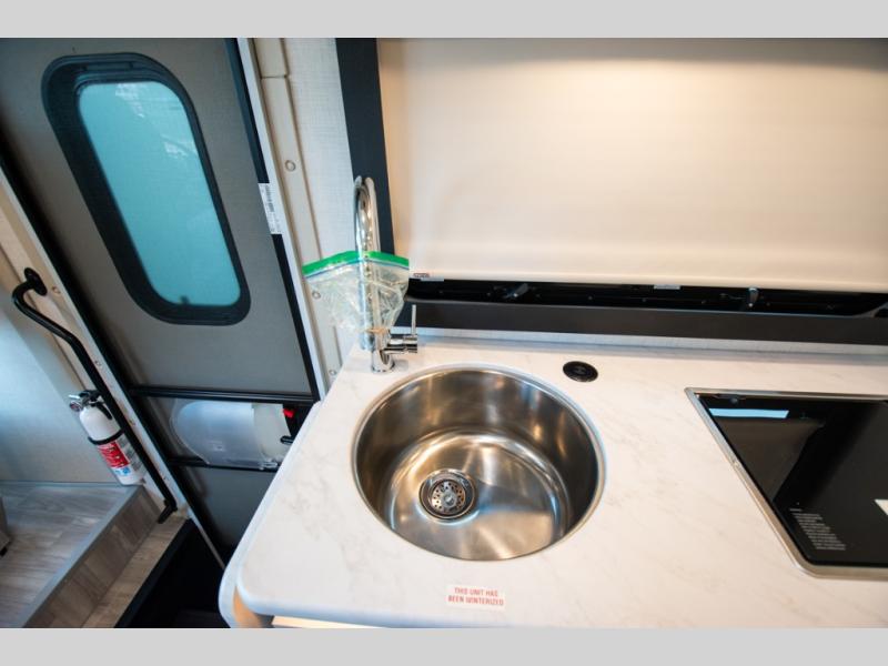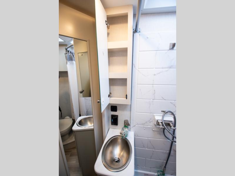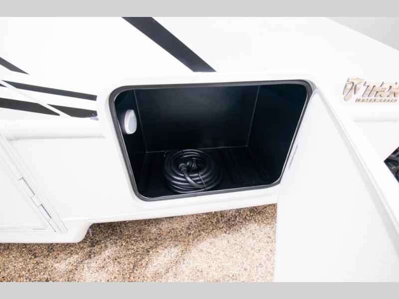 The front cab of this Vegas Class A gas motorhome is excellently appointed with a stow-away coffee table, reclining/swivel leatherette captain's chairs, and a 14" touchscreen dash radio with Bluetooth, Android Auto, and Apple CarPlay! A single slide holds the 68" sofa bed so that it isn't in your way as you walk back to the semi-private bedroom. The kitchen offers you a two burner cooktop to sauté veggies, and there are two Smart TVs to provide you with all the entertainment you could need. Within the full bath you'll find a 27" x 27" radius shower with a skylight, a stainless steel bath sink, and a 12V power bath vent to keep this space fresh.