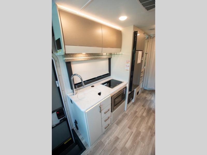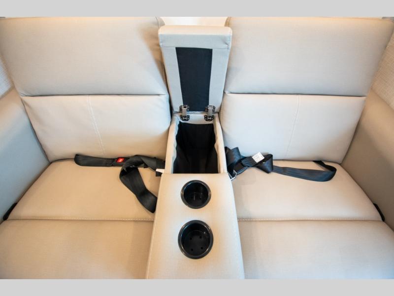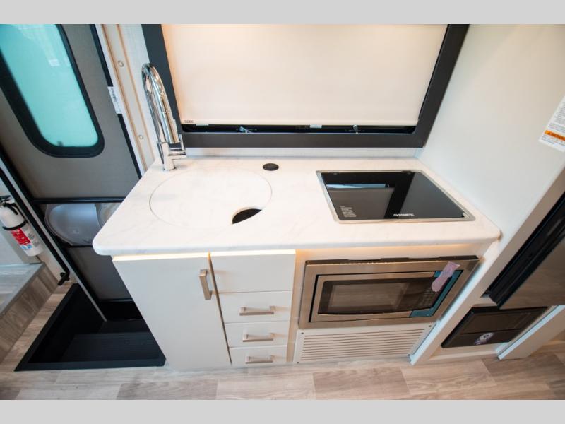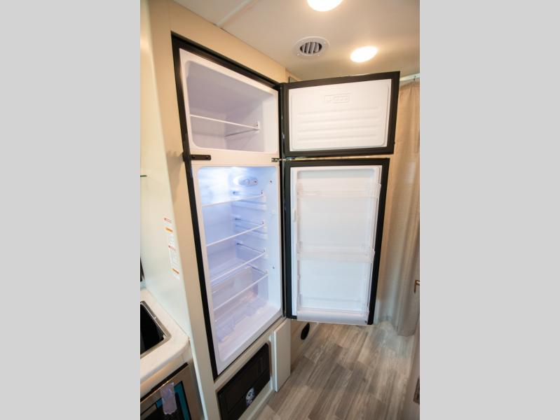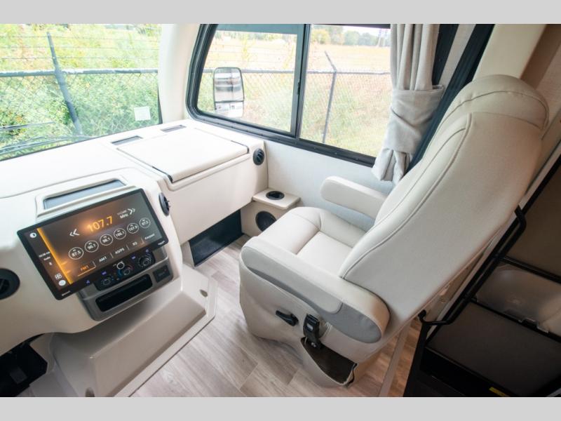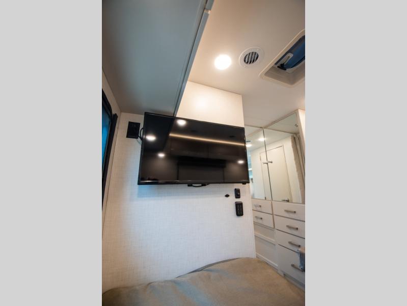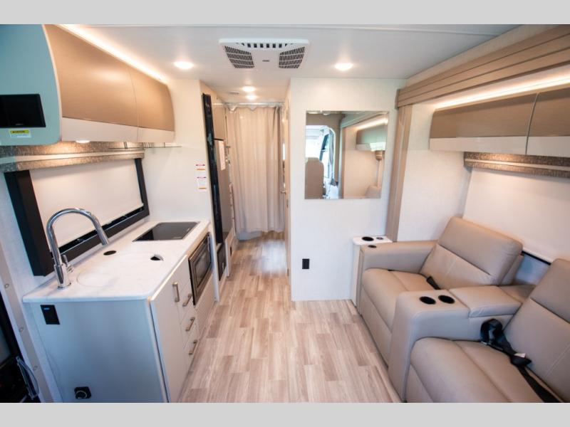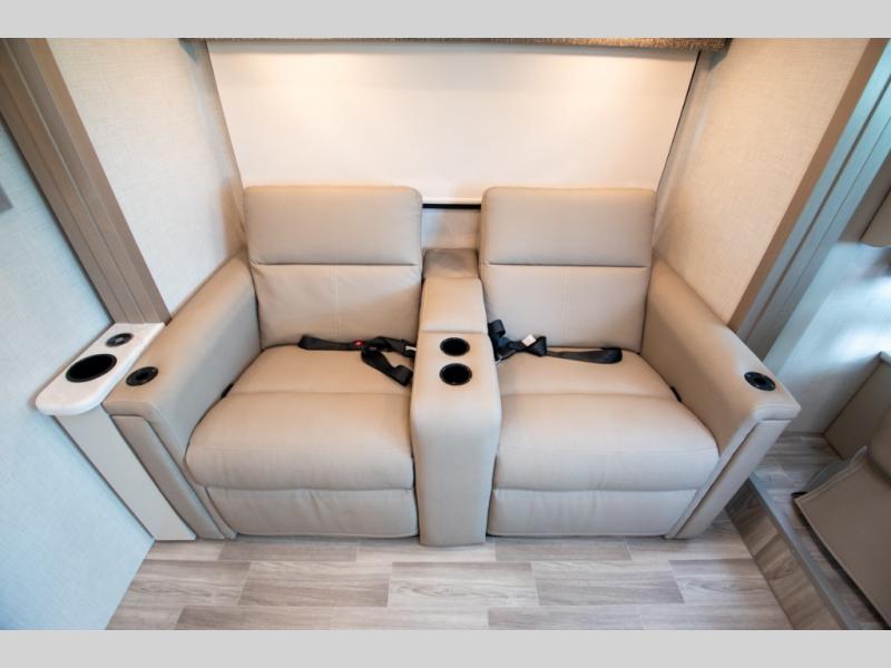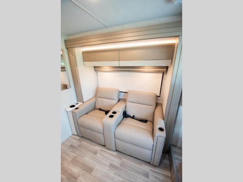 This coach has a similar layout to 24.1, but you'll enjoy theater seating in this model, two closets instead of one, and a larger exterior length for more space! The twin beds with king conversion make it possible to travel as friends or a couple, and there is even a bedroom TV so you can watch movies in bed. In the morning, you can make breakfast on the two burner gas cooktop or in the convection microwave with an air fryer. There is a 12V double door refrigerator to keep your perishables fresh, and you can dine at the theater seating.