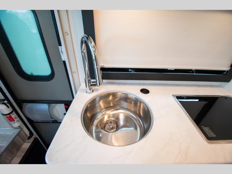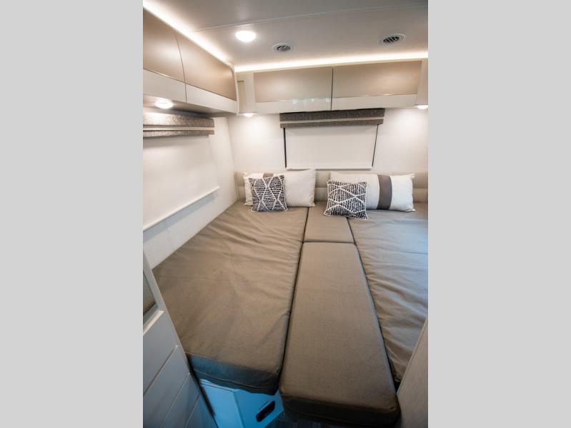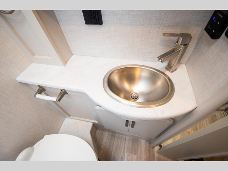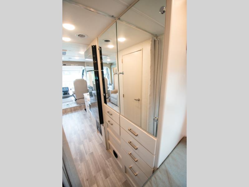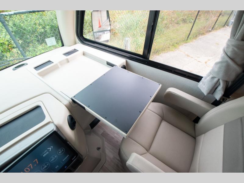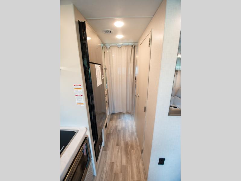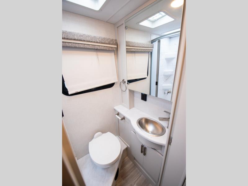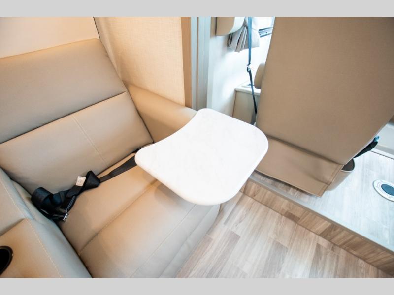This coach has a similar layout to 24.1, but you'll enjoy theater seating in this model, two closets instead of one, and a larger exterior length for more space! The twin beds with king conversion make it possible to travel as friends or a couple, and there is even a bedroom TV so you can watch movies in bed. In the morning, you can make breakfast on the two burner gas cooktop or in the convection microwave with an air fryer. There is a 12V double door refrigerator to keep your perishables fresh, and you can dine at the theater seating.