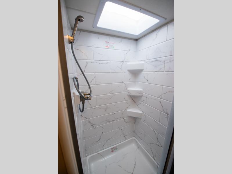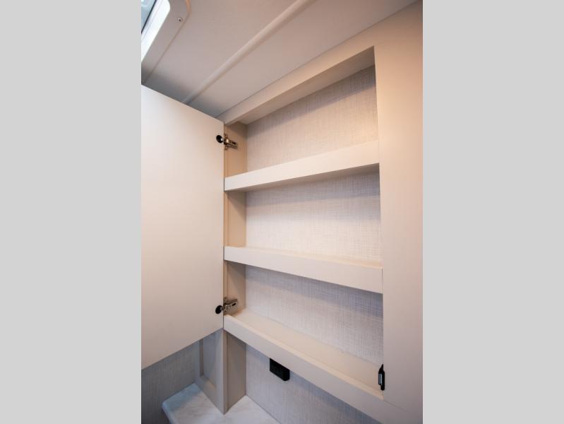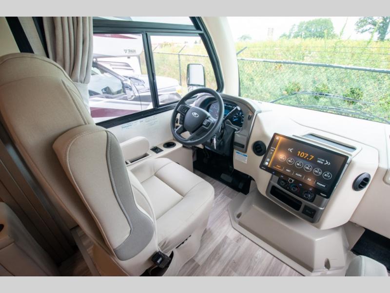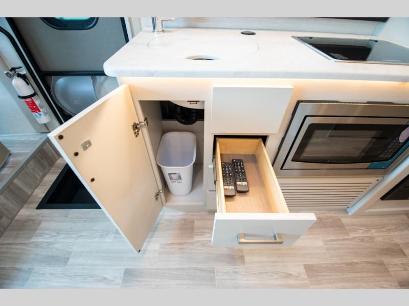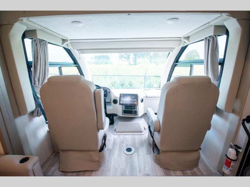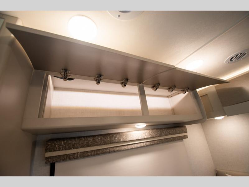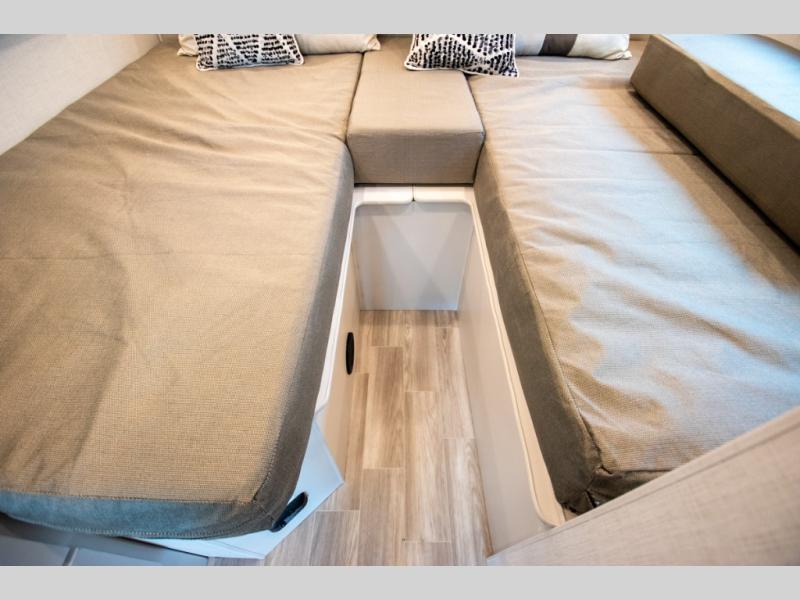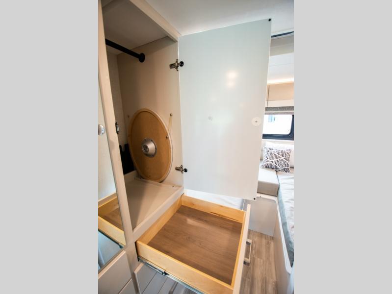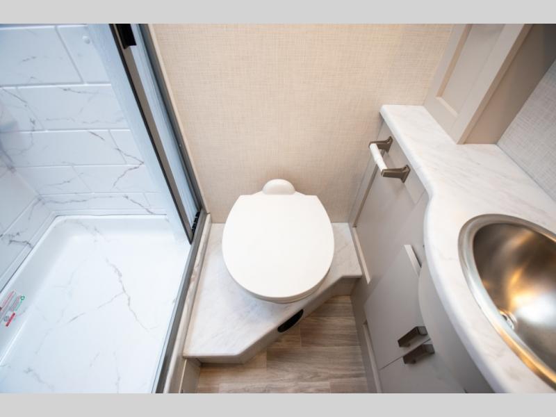 This coach has a similar layout to 24.1, but you'll enjoy theater seating in this model, two closets instead of one, and a larger exterior length for more space! The twin beds with king conversion make it possible to travel as friends or a couple, and there is even a bedroom TV so you can watch movies in bed. In the morning, you can make breakfast on the two burner gas cooktop or in the convection microwave with an air fryer. There is a 12V double door refrigerator to keep your perishables fresh, and you can dine at the theater seating.