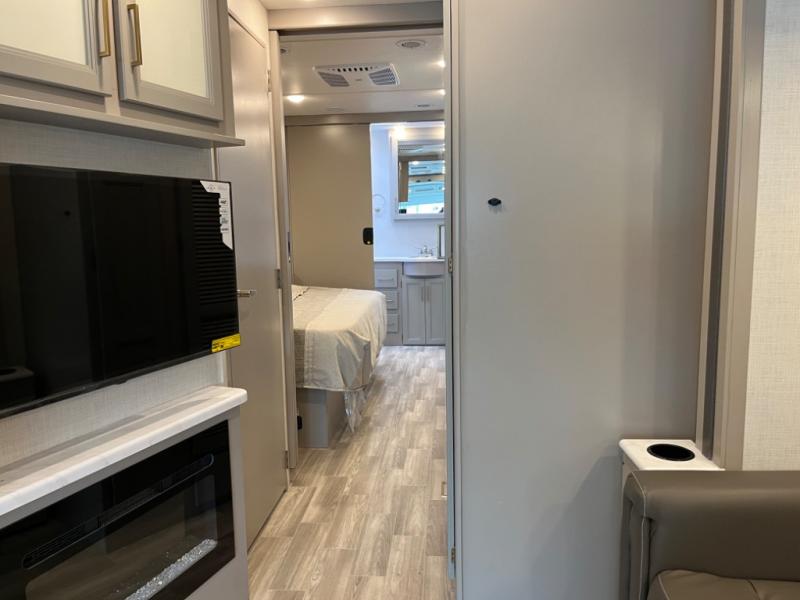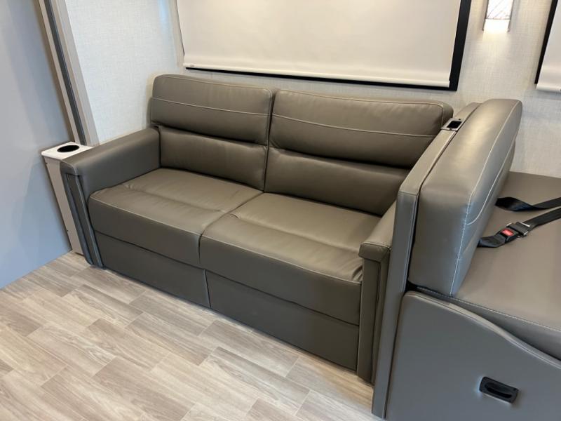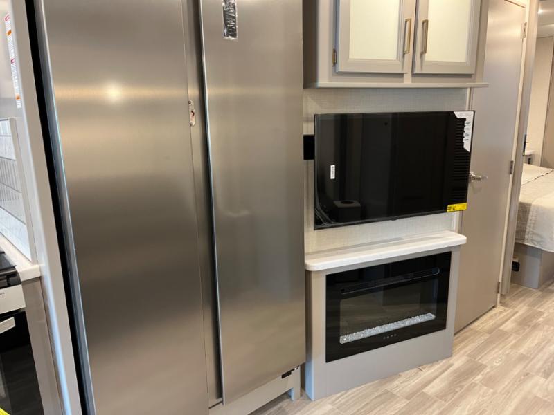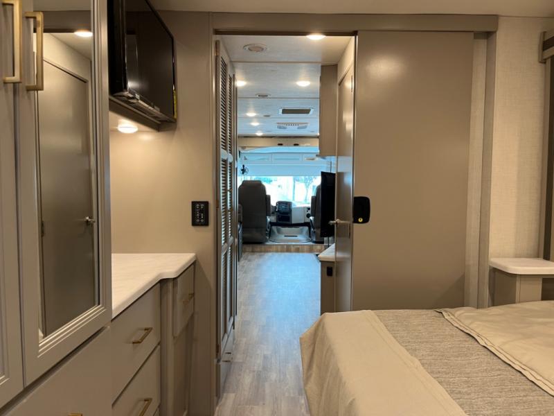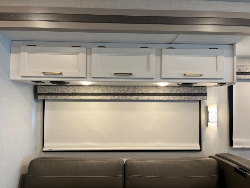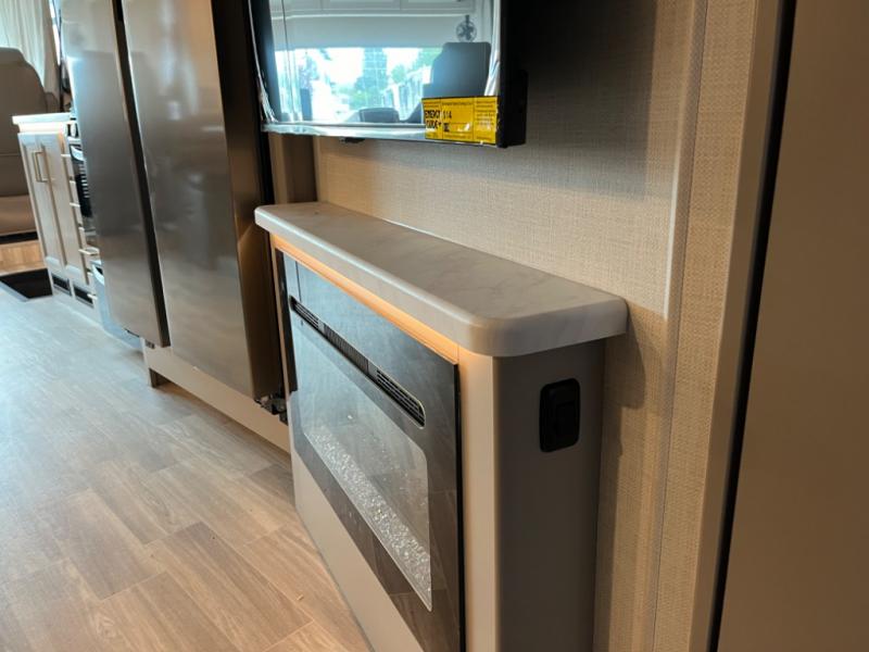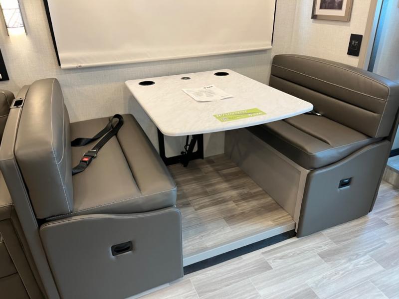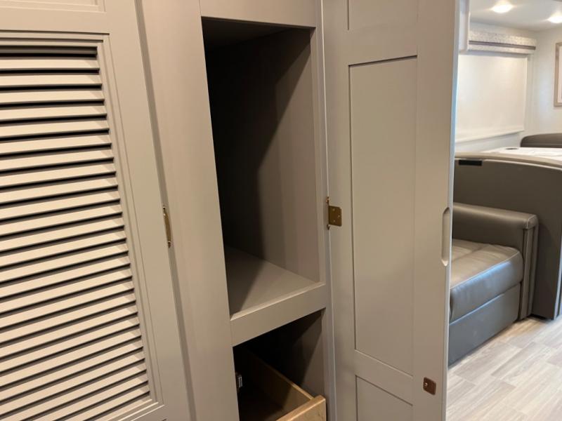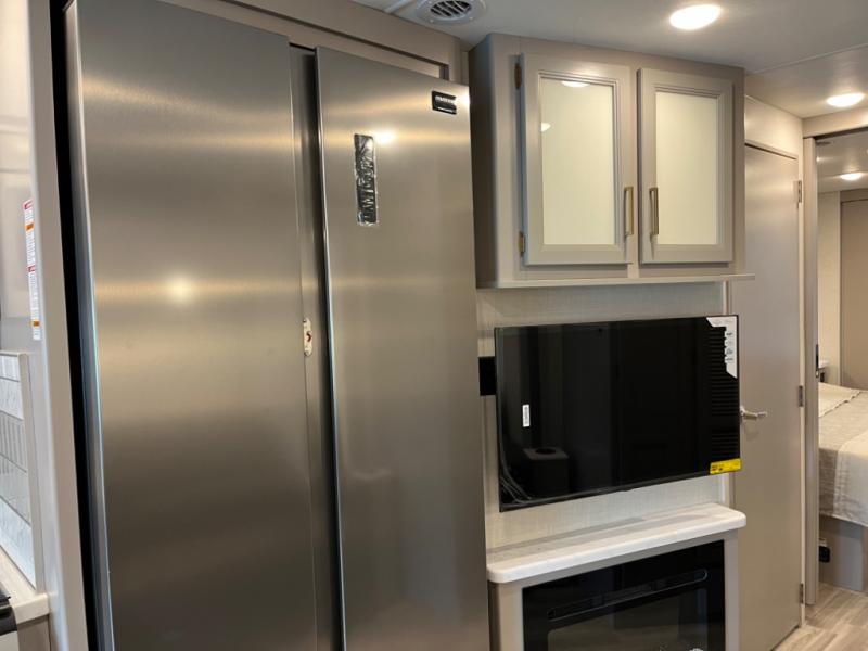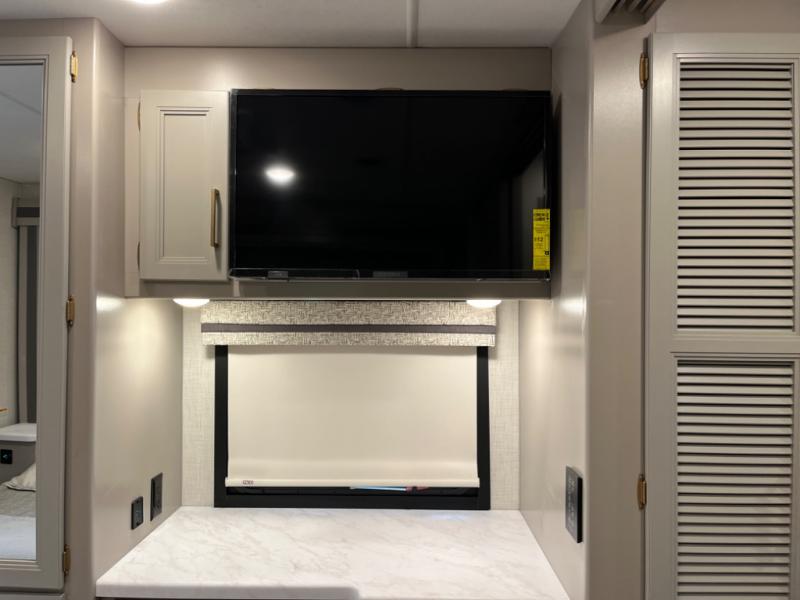 Get ready to take your travels to new heights with our incredible Class A motorhome! The full rear bathroom is spacious and convenient, complete with a generous 30” x 36” shower. The private bedroom is a haven of relaxation, featuring a king bed, closet, dresser, and 32” LED smart TV for relaxing. The living room/kitchen area is the center of the home, equipped with a closet, stackable washer, and dryer prep, half bathroom, linen closet, pantry, 68” sofa bed, dream dinette to share a meal with family, 40” LED smart TV to have an entertaining time with your family and friends, plus a fridge, microwave, and 3-burner cooktop, that will make your cooking experience enjoyable. But that's not all - this motorhome also features a drop-down overhead bunk sleeping area, perfect for kids or guests. This unit is also the best choice if you are seeking comfort time outside thanks to its massive 18’ awning ideal for enjoying the fresh air and a 32” TV for outdoor entertainment.