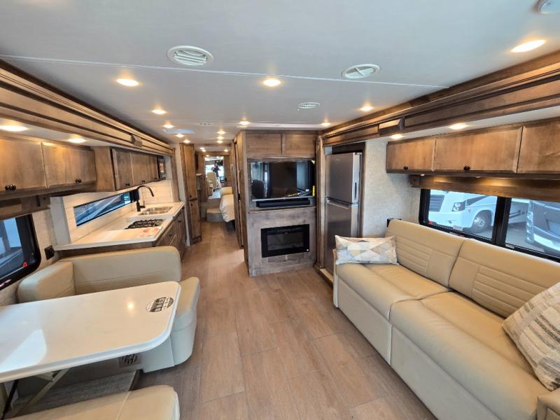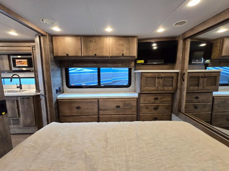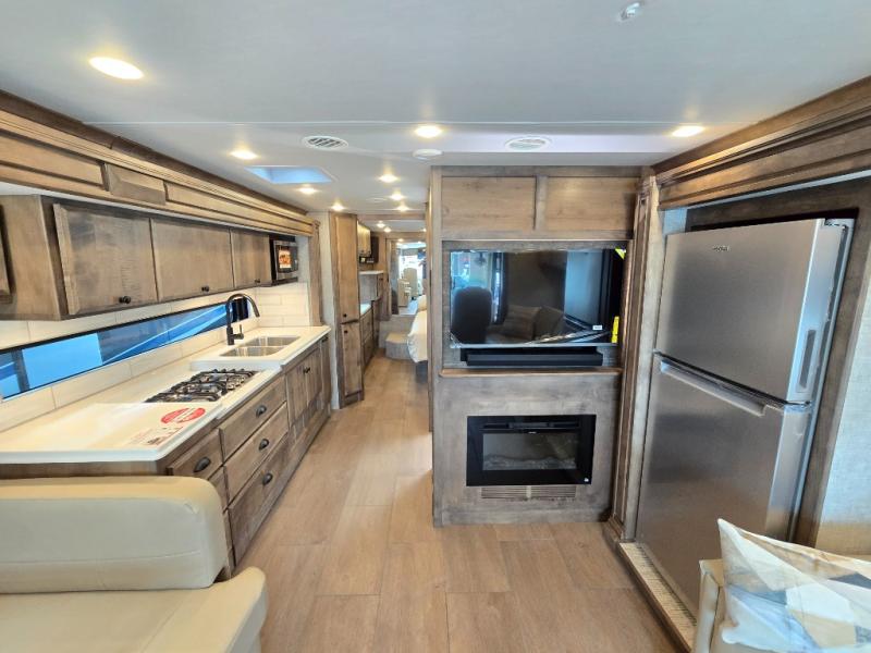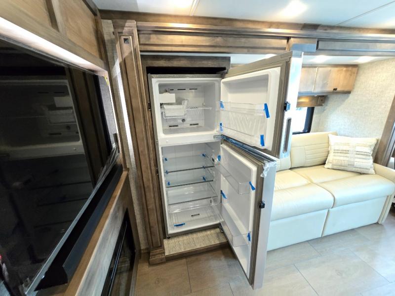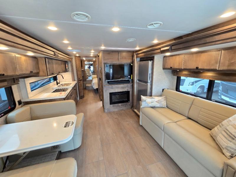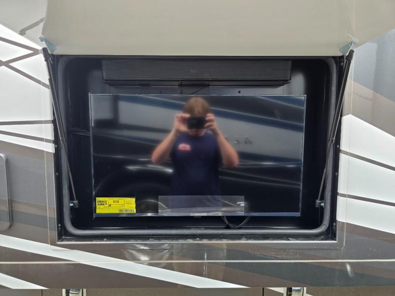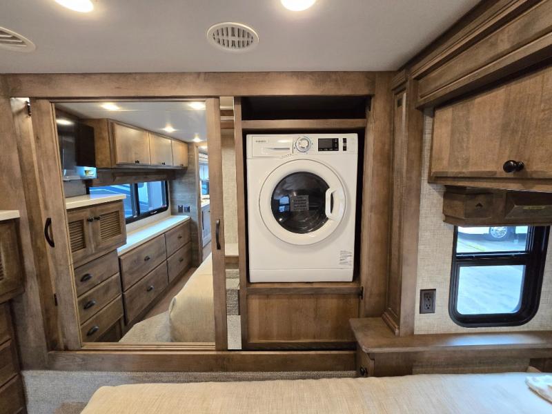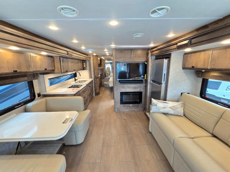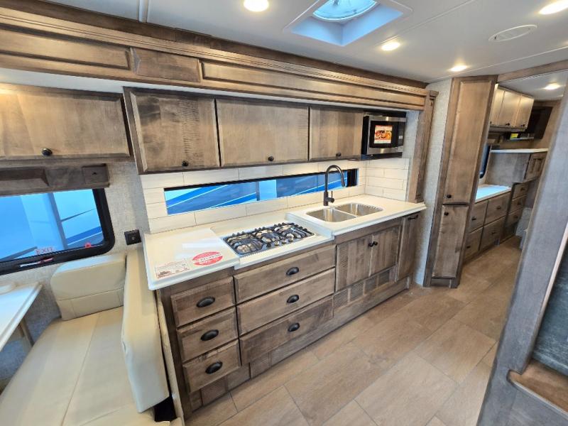 Pack your bags and load up into this motorhome for a luxurious adventure! The rear private bedroom has a king bed slide that can be switched for an optional queen bed, a bank of drawers next to a TV, a large closet, and a wardrobe that is prepped to add an optional washer and dryer so you can have clean clothes throughout your entire trip. The full bathroom has a shower skylight, gravity flush toilet, solid surface countertop, and a handheld shower head with a slide bar for added convenience. When you're ready to eat, just whip up a meal on the three burner propane cooktop or use the convection microwave. You can dine at the booth dinette, or maybe switch out the dinette for an optional dinette computer workstation with a lift TV! You can spend your evenings with a movie since there is a living area TV with an optional fireplace, or you can head outdoor to enjoy the exterior TV and Girard power awning with LED lights!