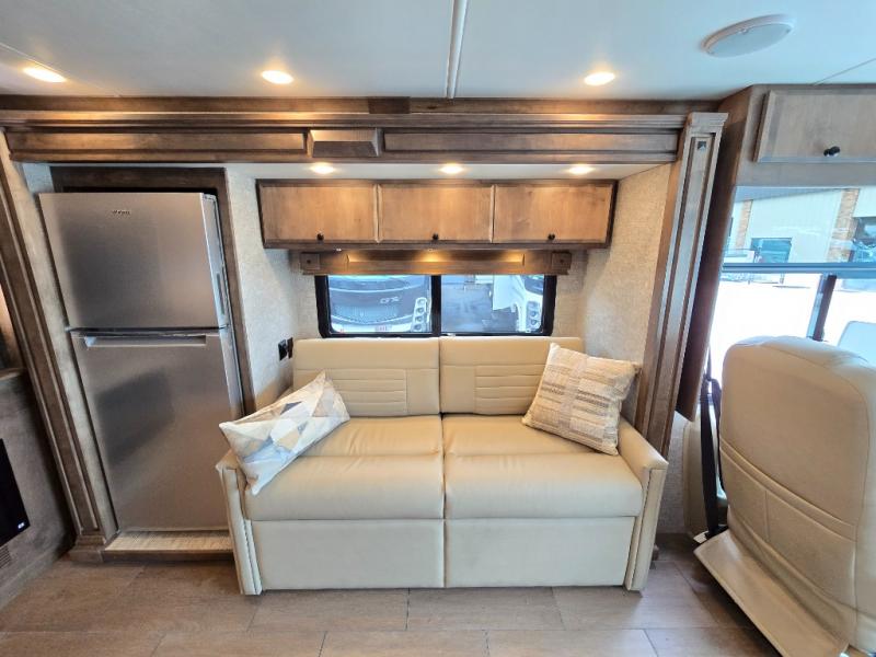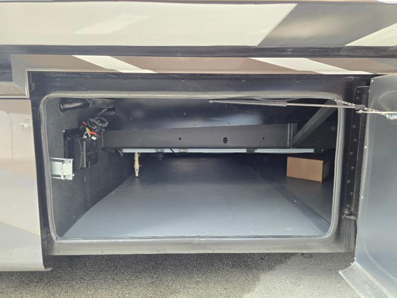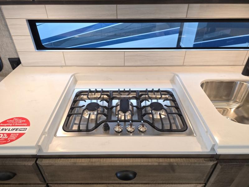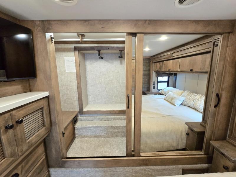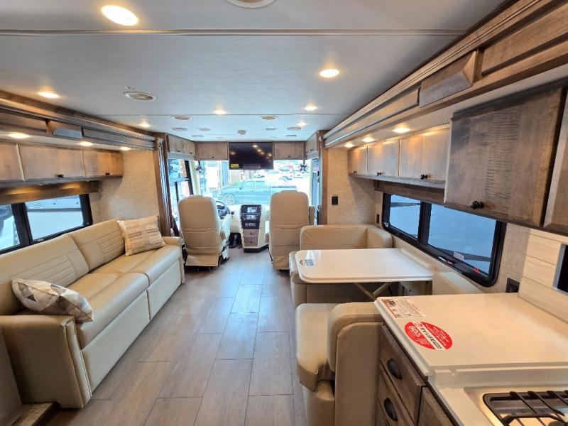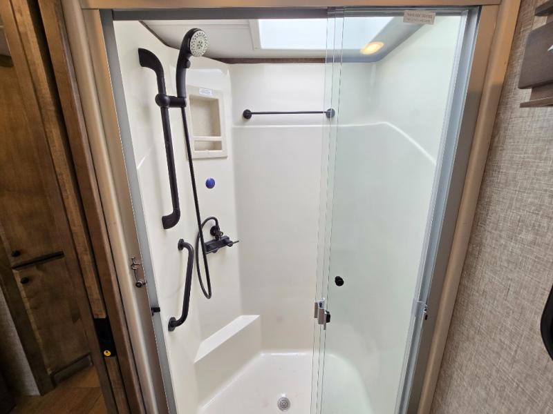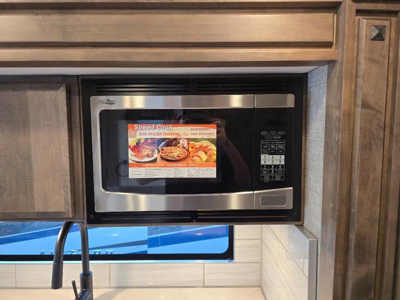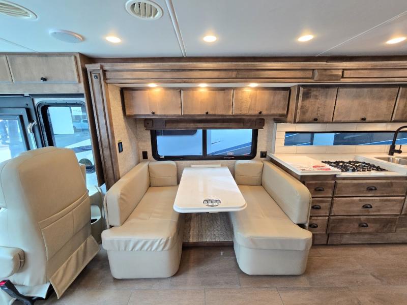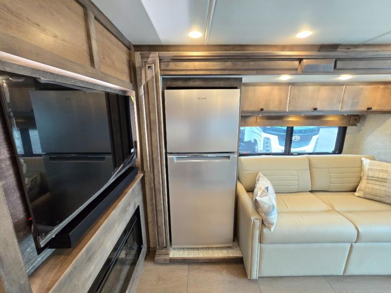 Pack your bags and load up into this motorhome for a luxurious adventure! The rear private bedroom has a king bed slide that can be switched for an optional queen bed, a bank of drawers next to a TV, a large closet, and a wardrobe that is prepped to add an optional washer and dryer so you can have clean clothes throughout your entire trip. The full bathroom has a shower skylight, gravity flush toilet, solid surface countertop, and a handheld shower head with a slide bar for added convenience. When you're ready to eat, just whip up a meal on the three burner propane cooktop or use the convection microwave. You can dine at the booth dinette, or maybe switch out the dinette for an optional dinette computer workstation with a lift TV! You can spend your evenings with a movie since there is a living area TV with an optional fireplace, or you can head outdoor to enjoy the exterior TV and Girard power awning with LED lights!