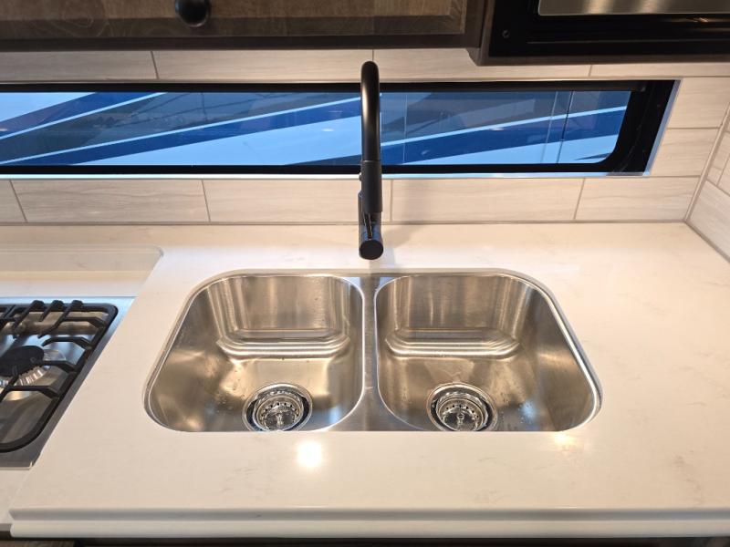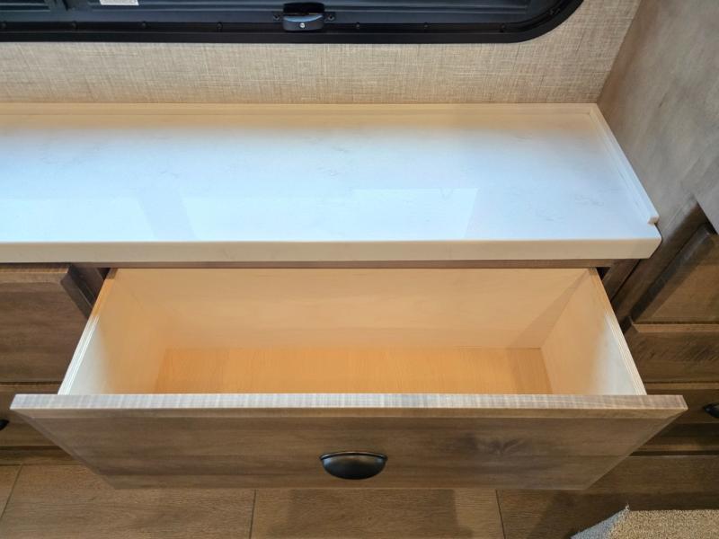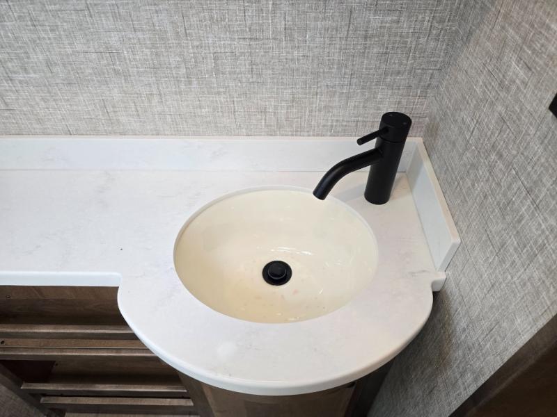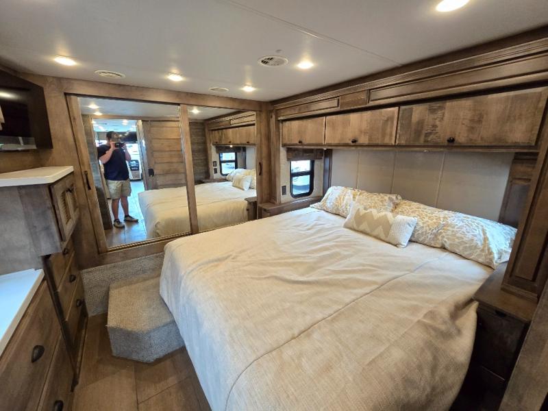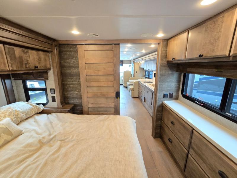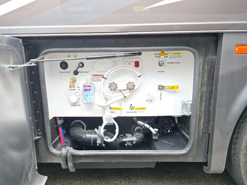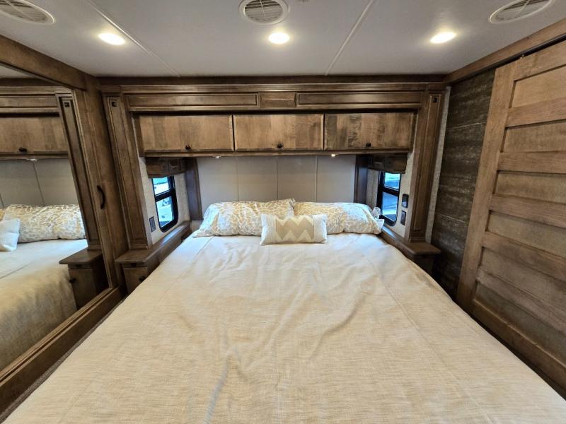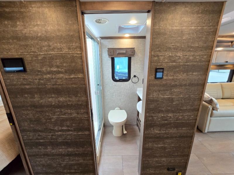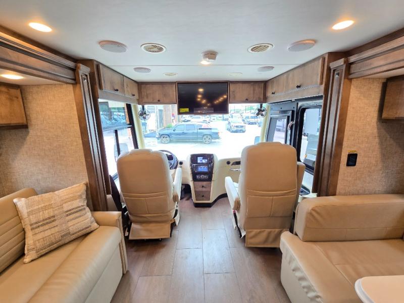Pack your bags and load up into this motorhome for a luxurious adventure! The rear private bedroom has a king bed slide that can be switched for an optional queen bed, a bank of drawers next to a TV, a large closet, and a wardrobe that is prepped to add an optional washer and dryer so you can have clean clothes throughout your entire trip. The full bathroom has a shower skylight, gravity flush toilet, solid surface countertop, and a handheld shower head with a slide bar for added convenience. When you're ready to eat, just whip up a meal on the three burner propane cooktop or use the convection microwave. You can dine at the booth dinette, or maybe switch out the dinette for an optional dinette computer workstation with a lift TV! You can spend your evenings with a movie since there is a living area TV with an optional fireplace, or you can head outdoor to enjoy the exterior TV and Girard power awning with LED lights!