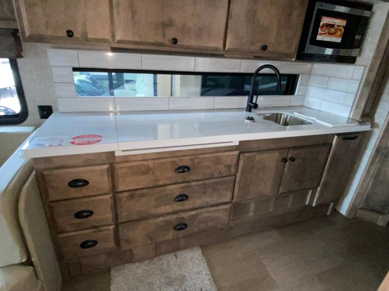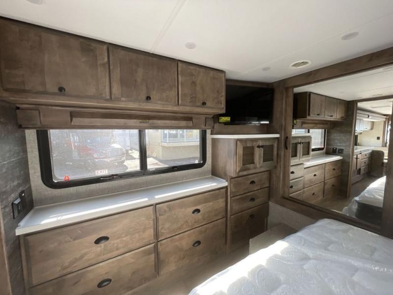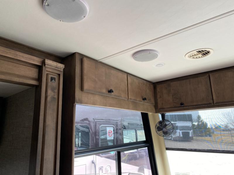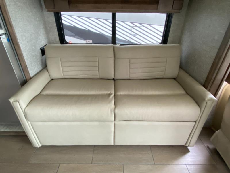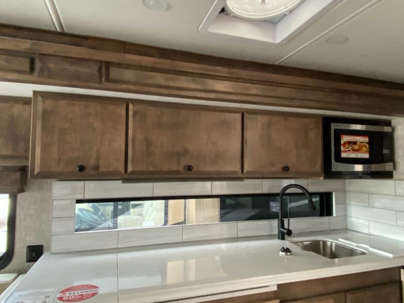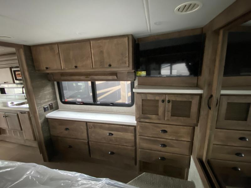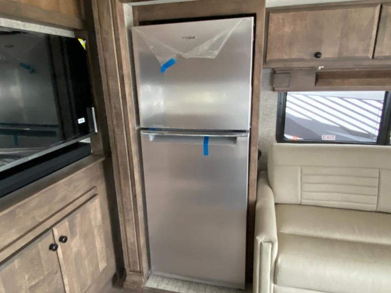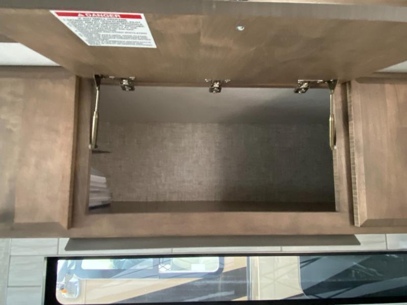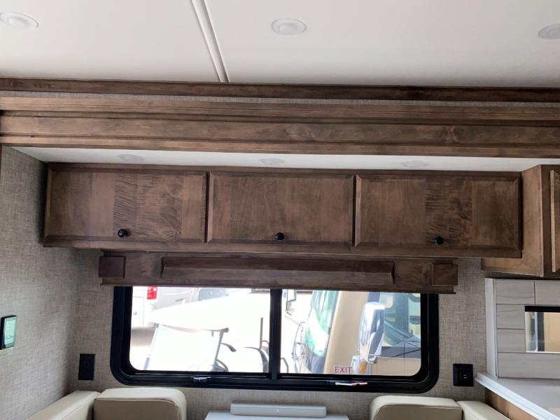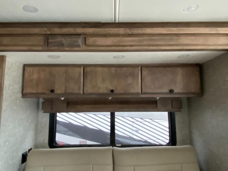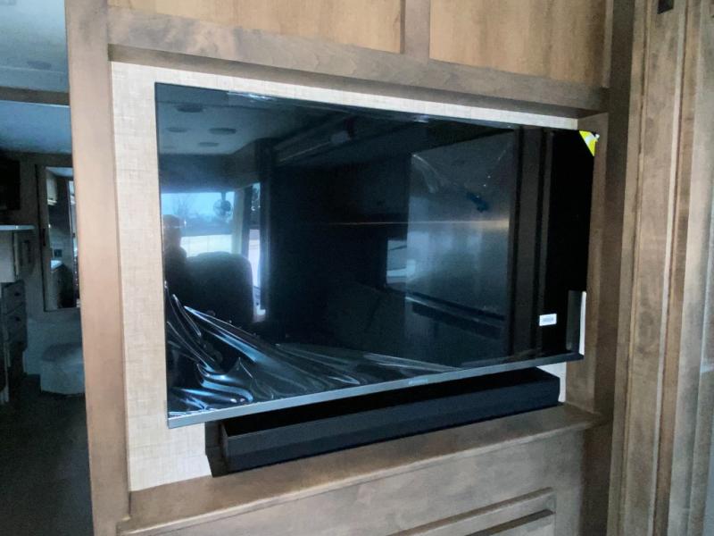 Pack your bags and load up into this motorhome for a luxurious adventure! The rear private bedroom has a king bed slide that can be switched for an optional queen bed, a bank of drawers next to a TV, a large closet, and a wardrobe that is prepped to add an optional washer and dryer so you can have clean clothes throughout your entire trip. The full bathroom has a shower skylight, gravity flush toilet, solid surface countertop, and a handheld shower head with a slide bar for added convenience. When you're ready to eat, just whip up a meal on the three burner propane cooktop or use the convection microwave. You can dine at the booth dinette, or maybe switch out the dinette for an optional dinette computer workstation with a lift TV! You can spend your evenings with a movie since there is a living area TV with an optional fireplace, or you can head outdoor to enjoy the exterior TV and Girard power awning with LED lights!