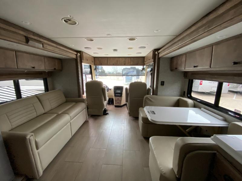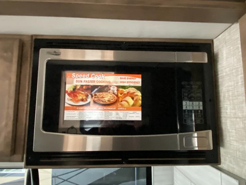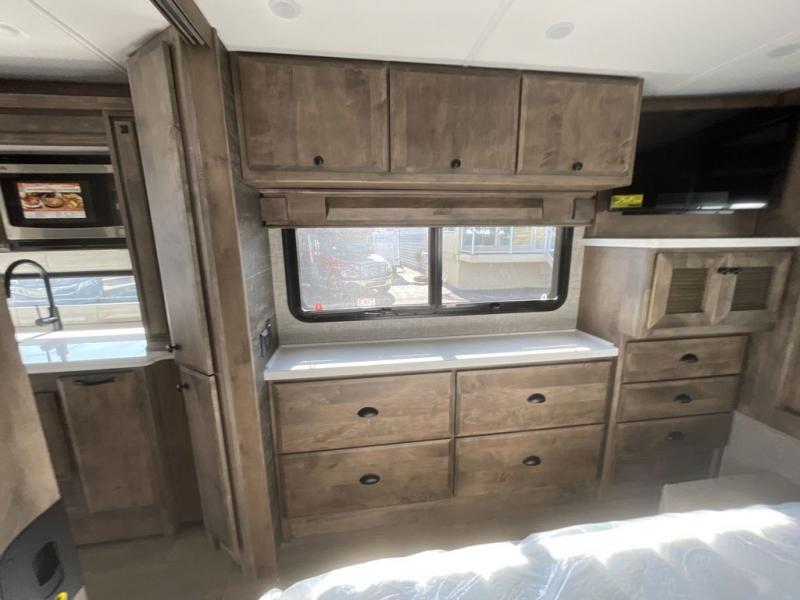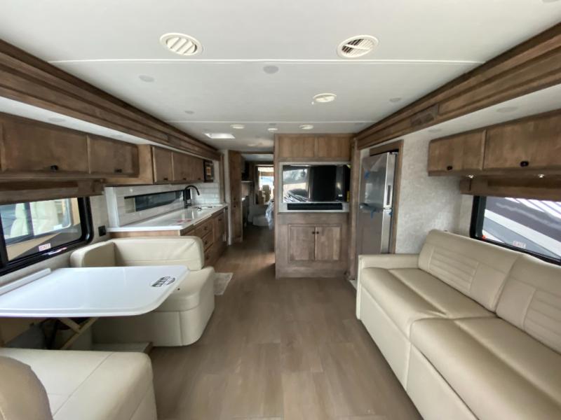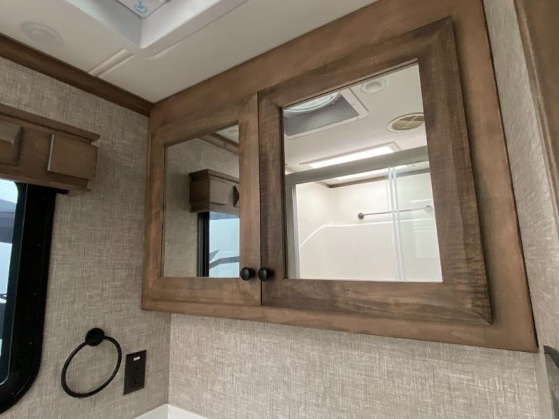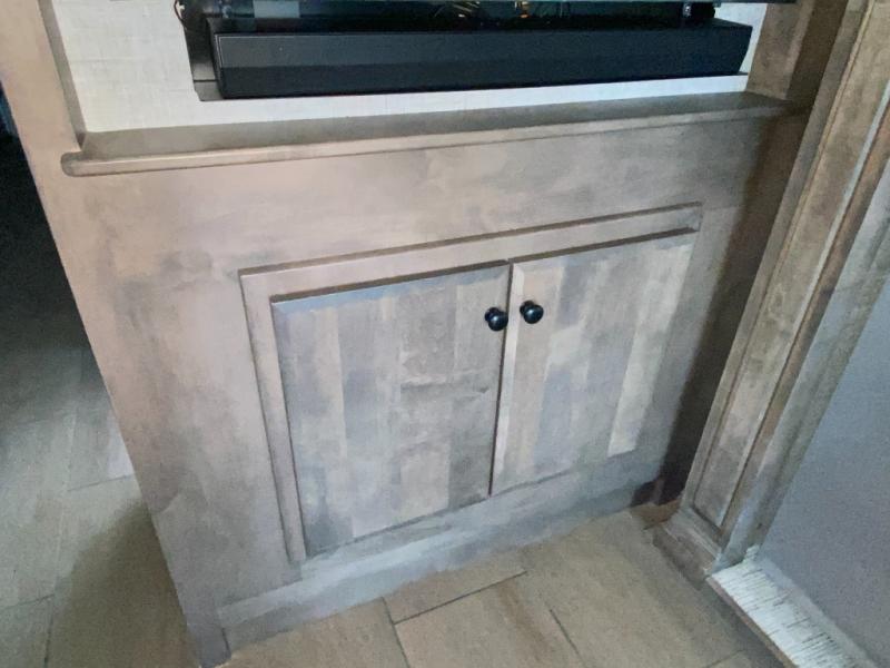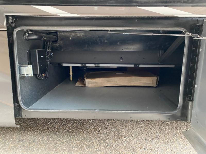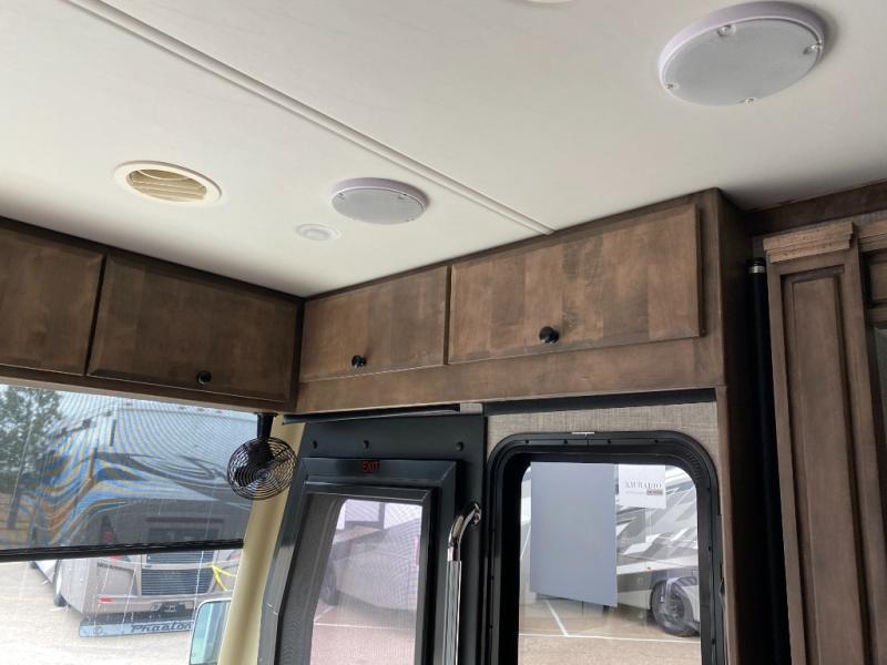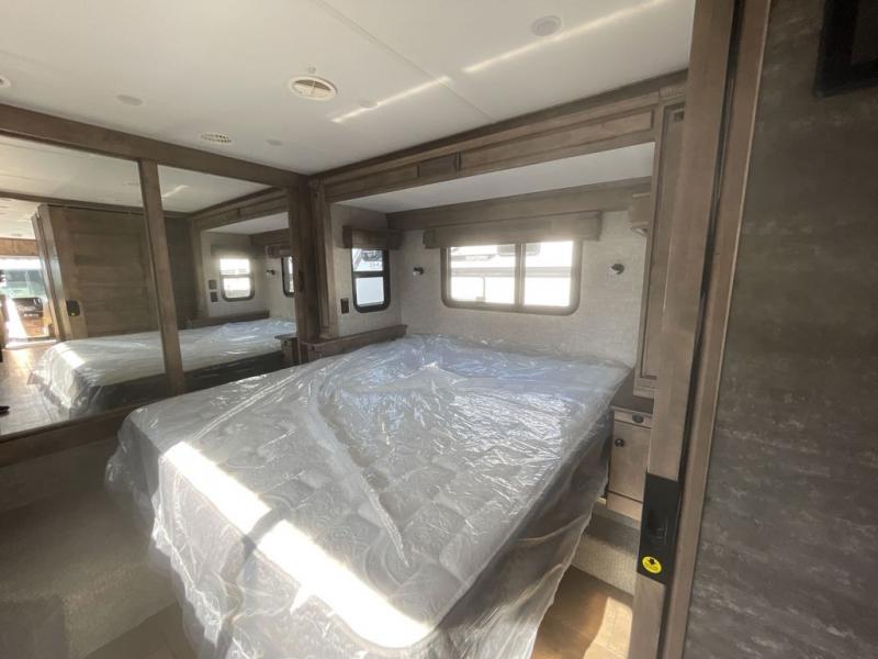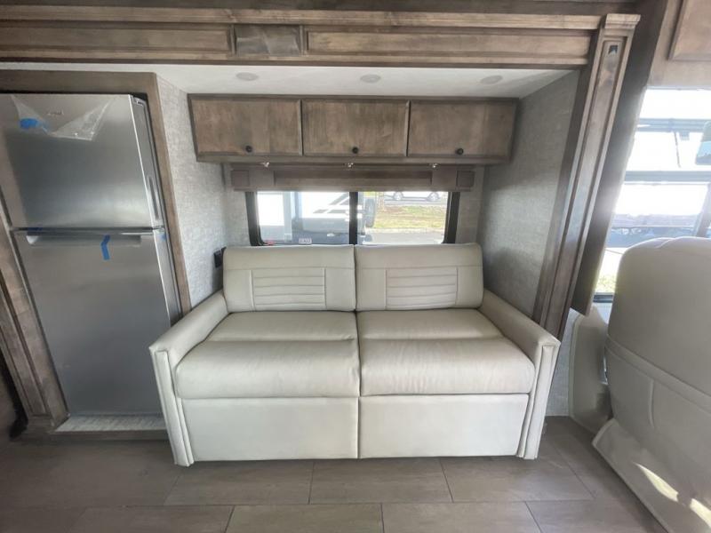 Pack your bags and load up into this motorhome for a luxurious adventure! The rear private bedroom has a king bed slide that can be switched for an optional queen bed, a bank of drawers next to a TV, a large closet, and a wardrobe that is prepped to add an optional washer and dryer so you can have clean clothes throughout your entire trip. The full bathroom has a shower skylight, gravity flush toilet, solid surface countertop, and a handheld shower head with a slide bar for added convenience. When you're ready to eat, just whip up a meal on the three burner propane cooktop or use the convection microwave. You can dine at the booth dinette, or maybe switch out the dinette for an optional dinette computer workstation with a lift TV! You can spend your evenings with a movie since there is a living area TV with an optional fireplace, or you can head outdoor to enjoy the exterior TV and Girard power awning with LED lights!