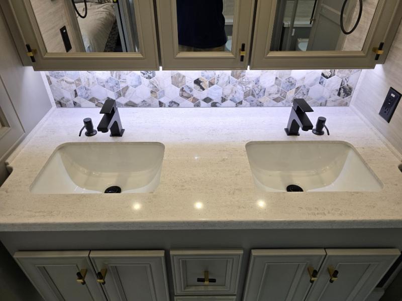 Now you can travel with more friends and family in this coach that includes a bath and a half, and additional sleeping space thanks to the two sofa beds. The master bedroom includes a king bed, 50" TV, plus dual nightstands for your belongings. Dual bath sinks in the full rear bath allow two people to freshen up at once, and a stacked washer and dryer to make wash day a breeze. And check out the kitchen with its residential refrigerator, pantry, stainless steel convection microwave, and drawer-type dishwasher! You will also appreciate the countertop extension for more prep space when it's time for dinner. The dinette with chairs provides a place to dine or get some work done, and one of the sofas includes an ottoman so you can kick your feet up.