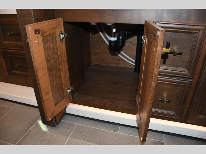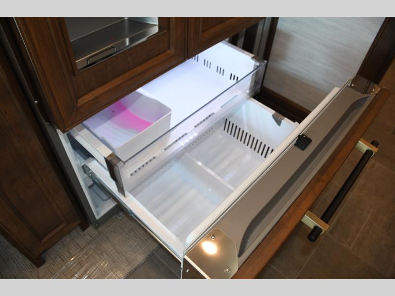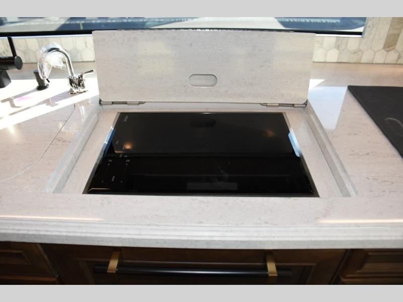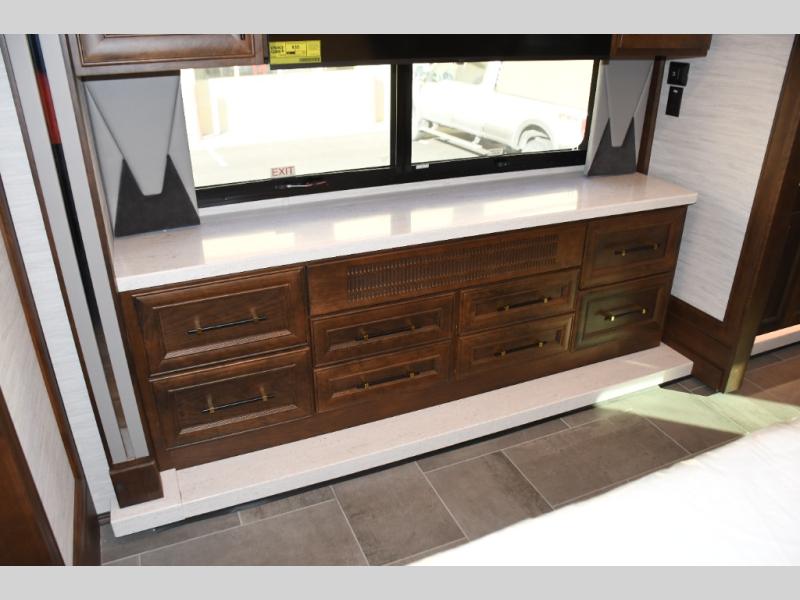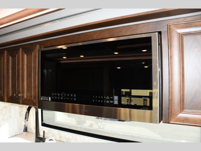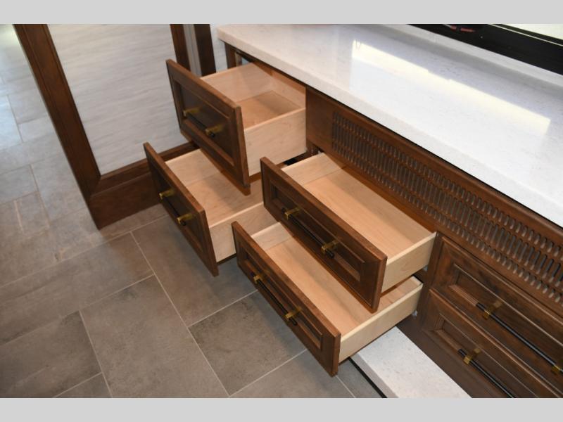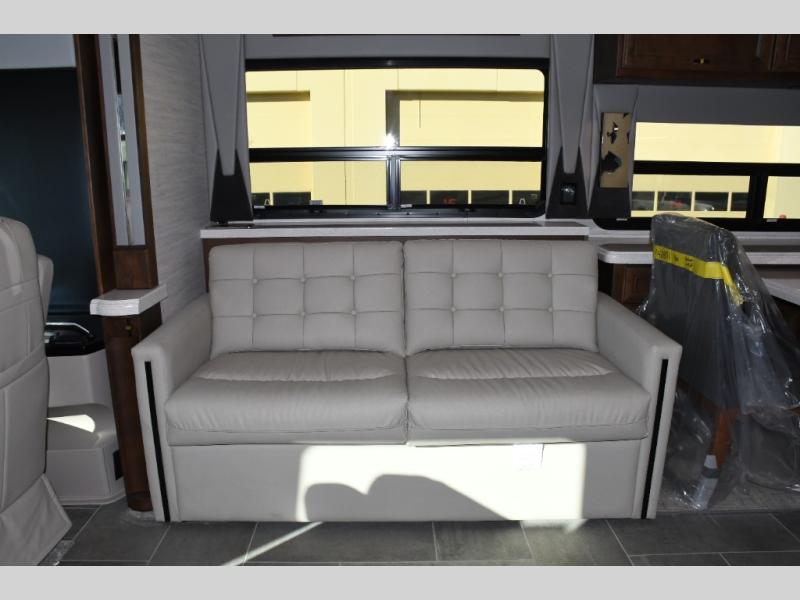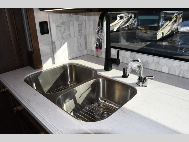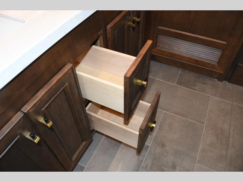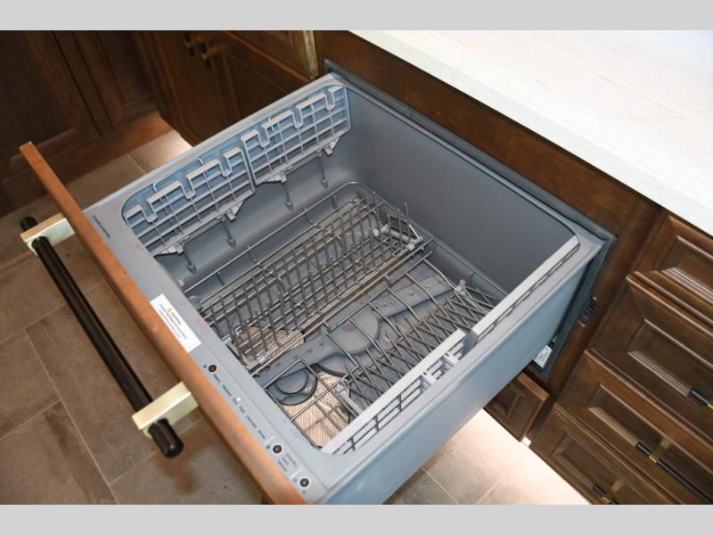 Now you can travel with more friends and family in this coach that includes a bath and a half, and additional sleeping space thanks to the two sofa beds. The master bedroom includes a king bed, 50" TV, plus dual nightstands for your belongings. Dual bath sinks in the full rear bath allow two people to freshen up at once, and a stacked washer and dryer to make wash day a breeze. And check out the kitchen with its residential refrigerator, pantry, stainless steel convection microwave, and drawer-type dishwasher! You will also appreciate the countertop extension for more prep space when it's time for dinner. The dinette with chairs provides a place to dine or get some work done, and one of the sofas includes an ottoman so you can kick your feet up.