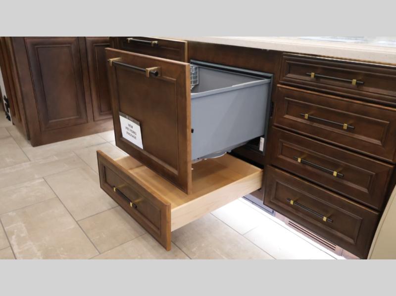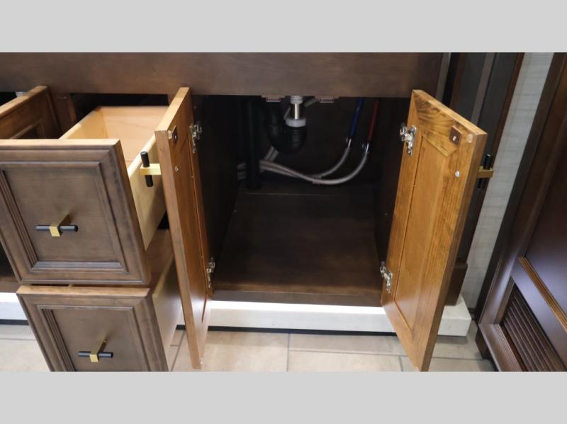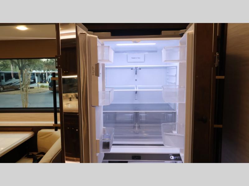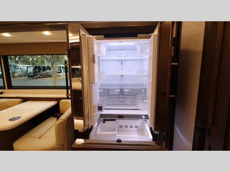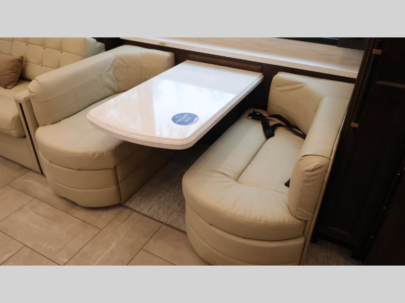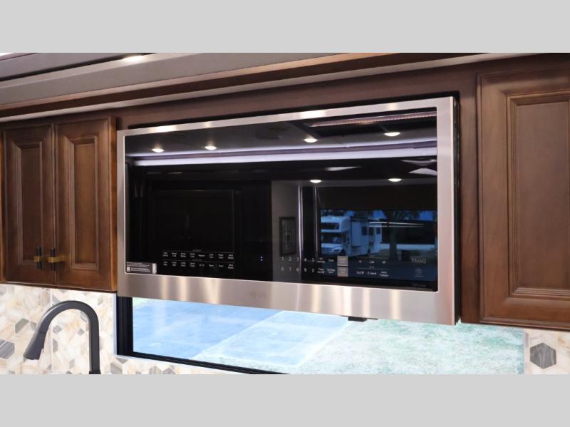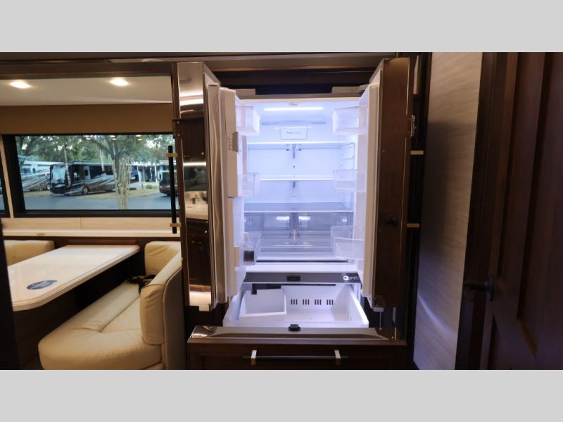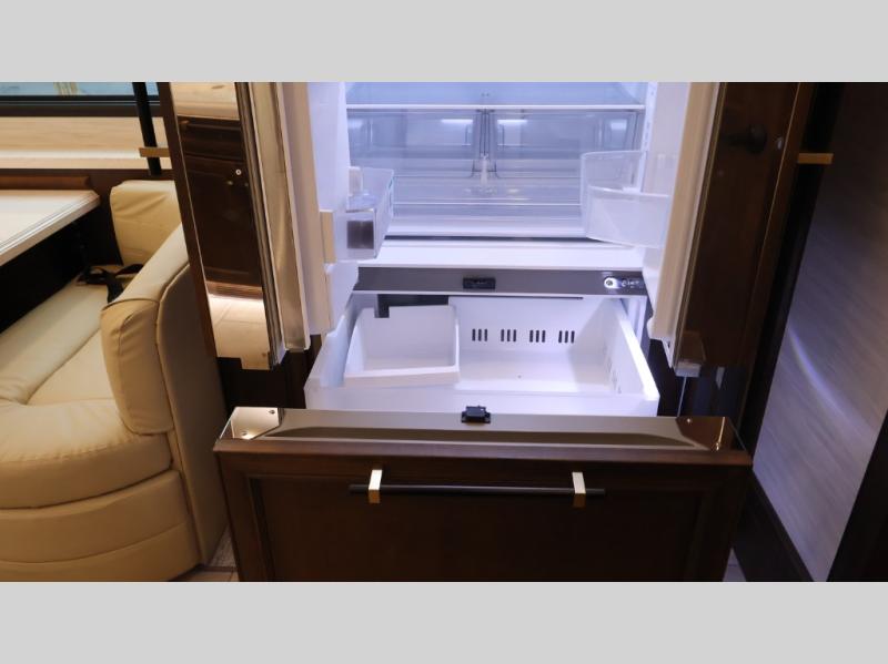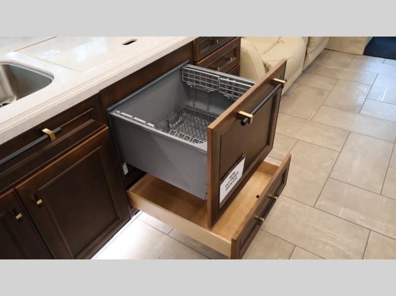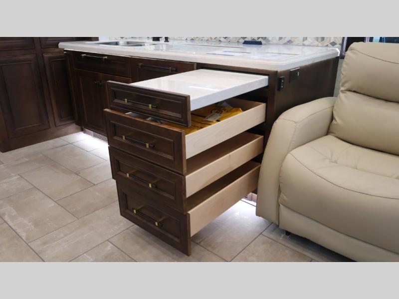 Now you can travel with more friends and family in this coach that includes a bath and a half, and additional sleeping space thanks to the two sofa beds. The master bedroom includes a king bed, 50" TV, plus dual nightstands for your belongings. Dual bath sinks in the full rear bath allow two people to freshen up at once, and a stacked washer and dryer to make wash day a breeze. And check out the kitchen with its residential refrigerator, pantry, stainless steel convection microwave, and drawer-type dishwasher! You will also appreciate the countertop extension for more prep space when it's time for dinner. The dinette with chairs provides a place to dine or get some work done, and one of the sofas includes an ottoman so you can kick your feet up.
