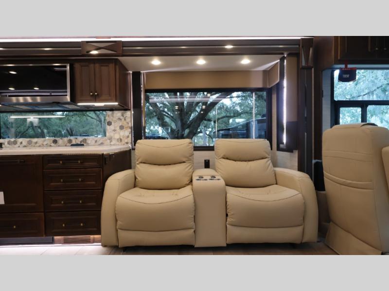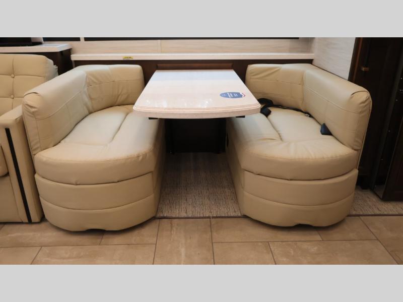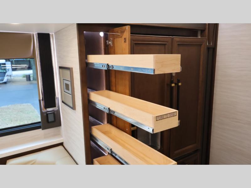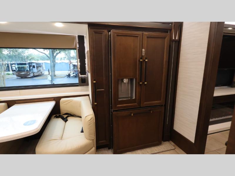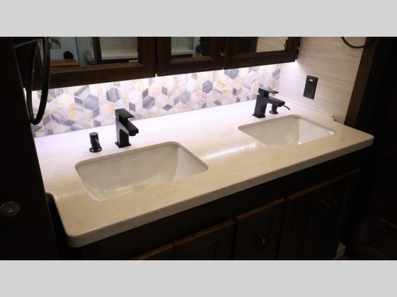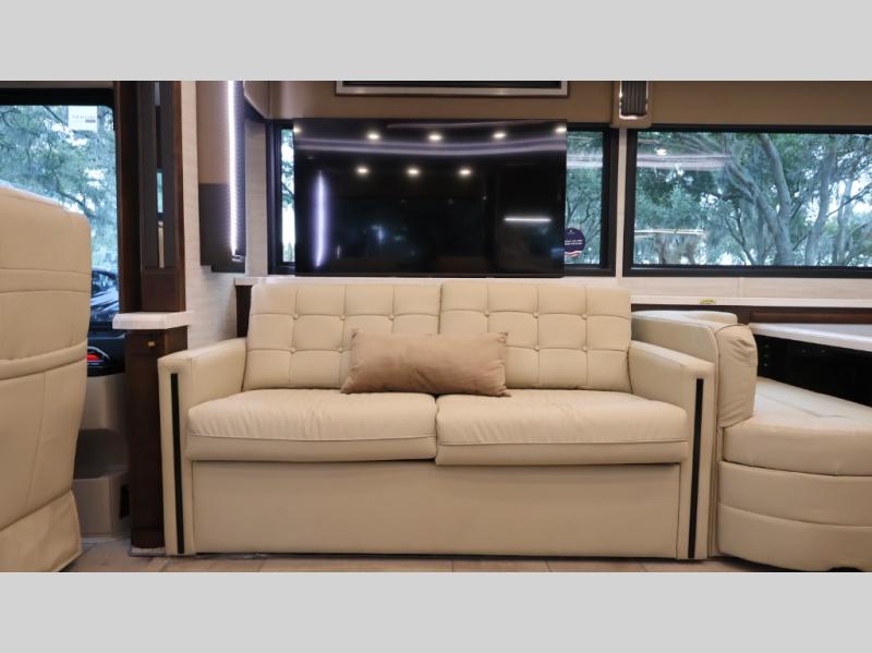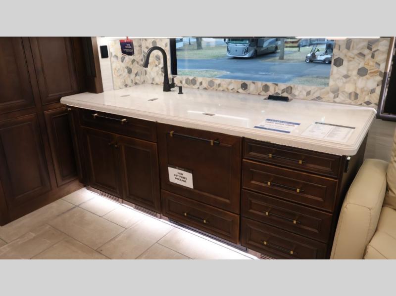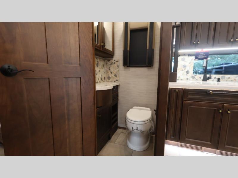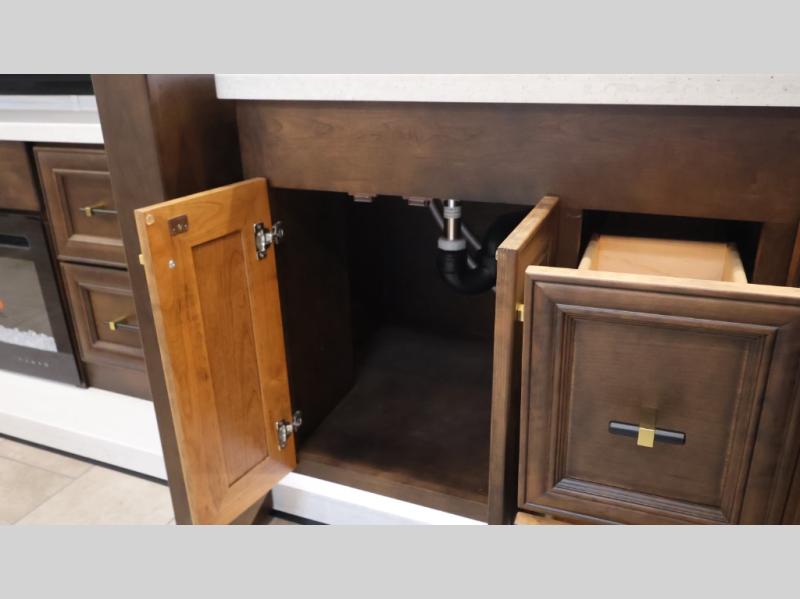 Now you can travel with more friends and family in this coach that includes a bath and a half, and additional sleeping space thanks to the two sofa beds. The master bedroom includes a king bed, 50" TV, plus dual nightstands for your belongings. Dual bath sinks in the full rear bath allow two people to freshen up at once, and a stacked washer and dryer to make wash day a breeze. And check out the kitchen with its residential refrigerator, pantry, stainless steel convection microwave, and drawer-type dishwasher! You will also appreciate the countertop extension for more prep space when it's time for dinner. The dinette with chairs provides a place to dine or get some work done, and one of the sofas includes an ottoman so you can kick your feet up.