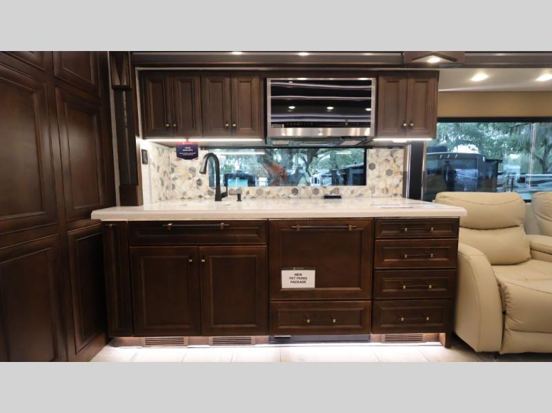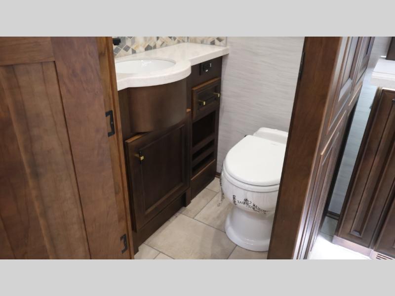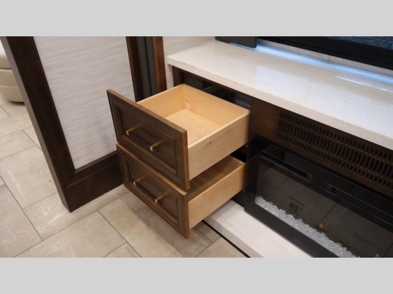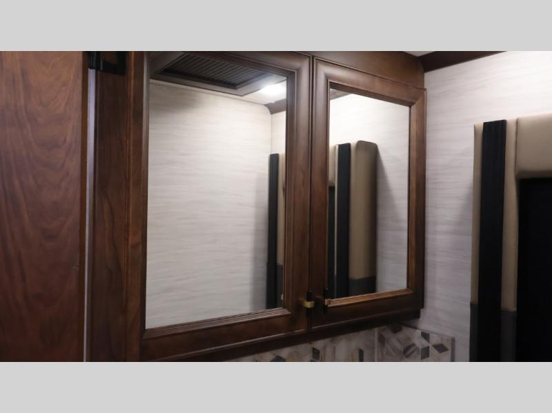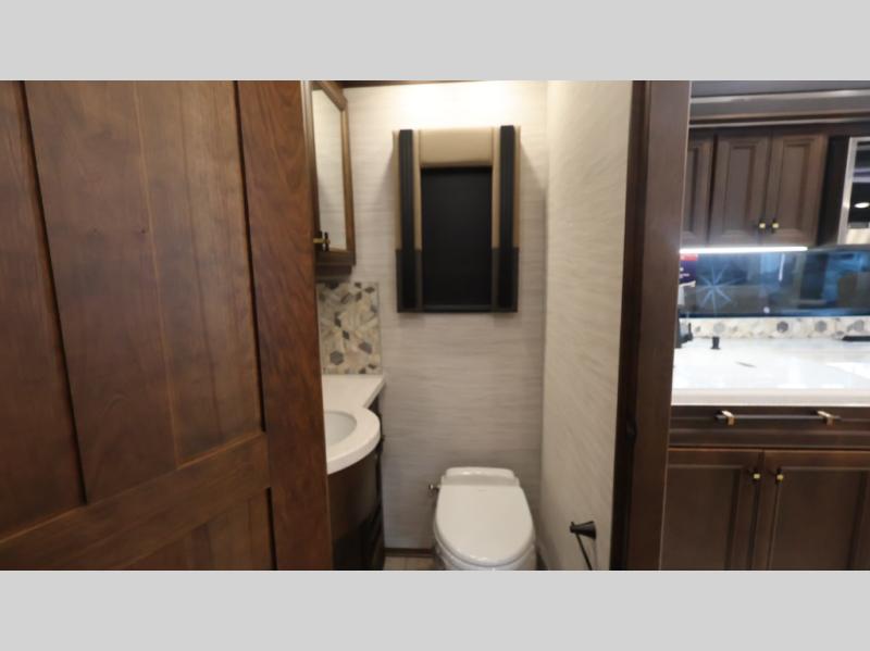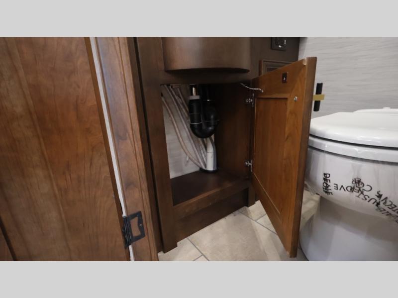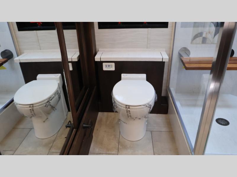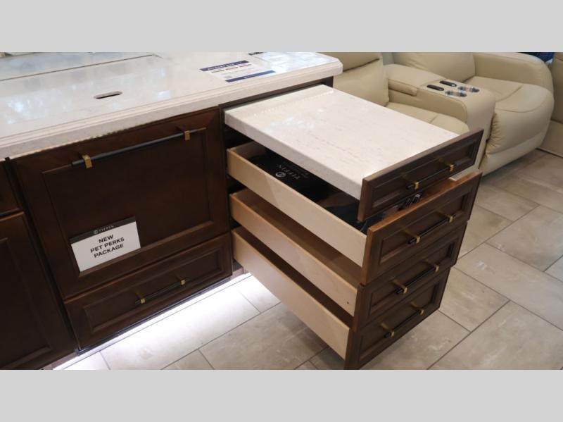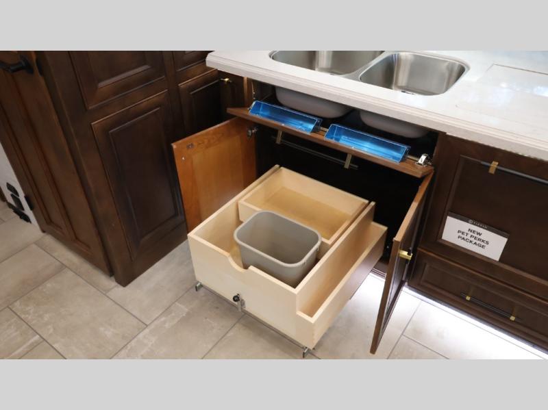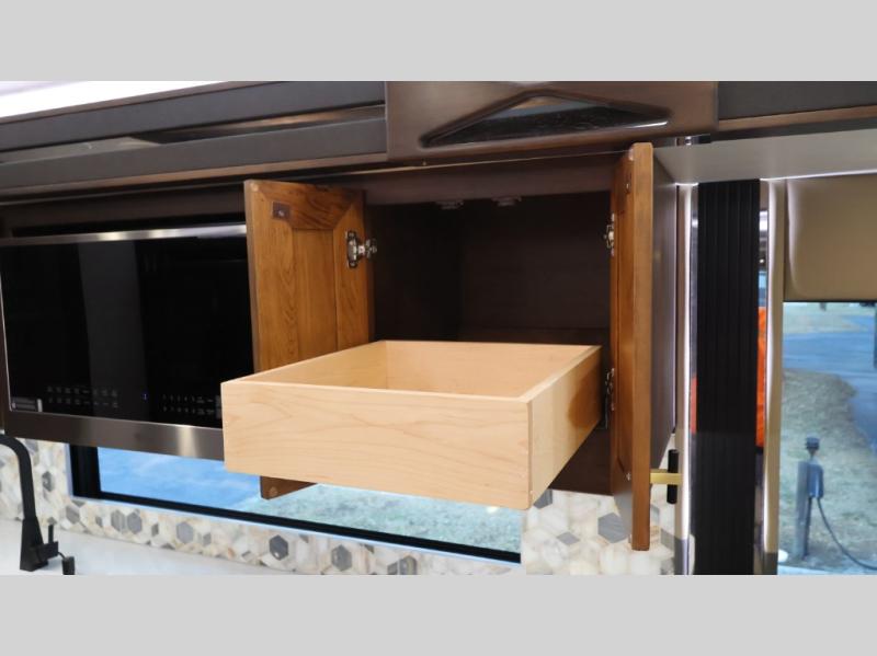Now you can travel with more friends and family in this coach that includes a bath and a half, and additional sleeping space thanks to the two sofa beds. The master bedroom includes a king bed, 50" TV, plus dual nightstands for your belongings. Dual bath sinks in the full rear bath allow two people to freshen up at once, and a stacked washer and dryer to make wash day a breeze. And check out the kitchen with its residential refrigerator, pantry, stainless steel convection microwave, and drawer-type dishwasher! You will also appreciate the countertop extension for more prep space when it's time for dinner. The dinette with chairs provides a place to dine or get some work done, and one of the sofas includes an ottoman so you can kick your feet up.