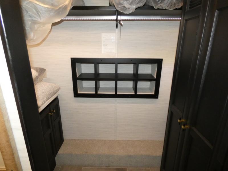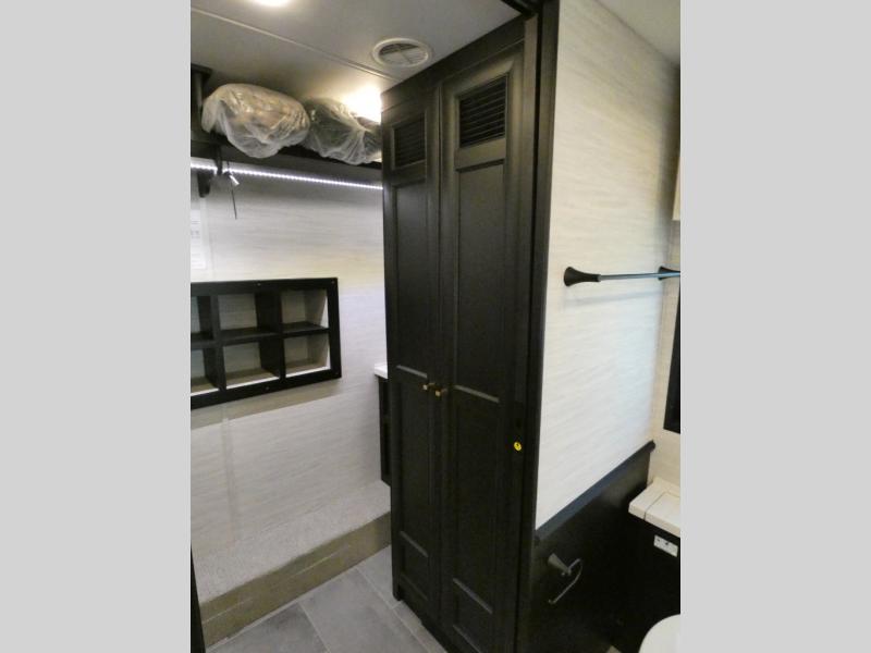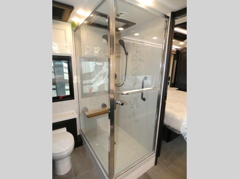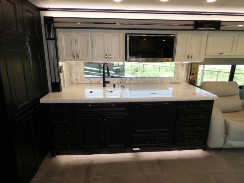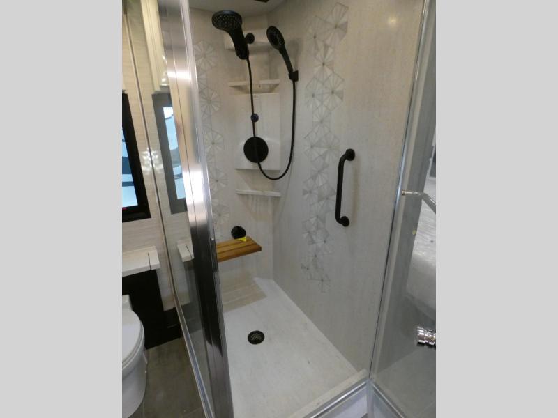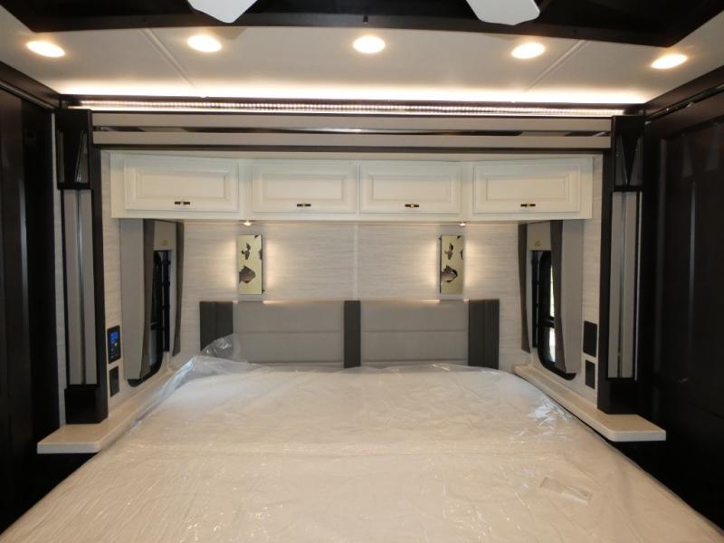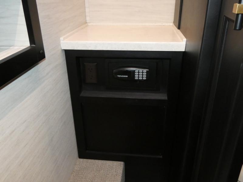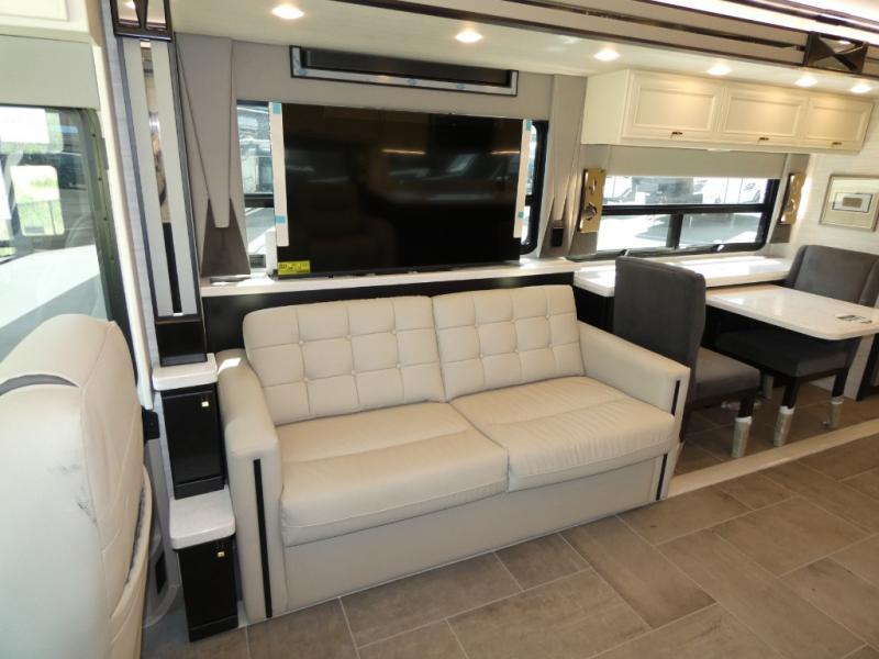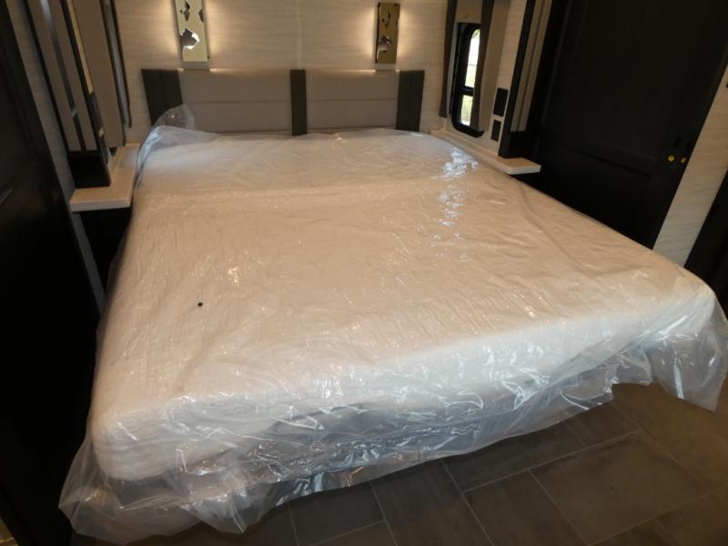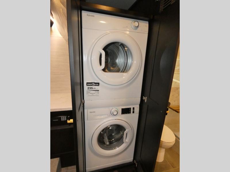 Fours slides, a bath and a half, plus sleeping space for guests make this coach family friendly. There is a sofa bed in the main living area, plus a lift TV for your favorite shows. The chef of your group can cook meals on the two burner induction cooktop or in the stainless steel convection microwave with an air fryer, and there is a drawer-type dishwasher that will make clean up easier than ever. This model also includes a residential refrigerator plus pull-out storage and a stack of drawers for snacks galore. Enjoy a great night's rest on the king bed after traveling all day, and the full rear bath will allow you to clean up in luxury. There is even a floor-to-ceiling closet for maximum storage and a stacked washer and dryer; how convenient!