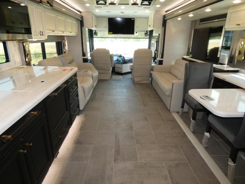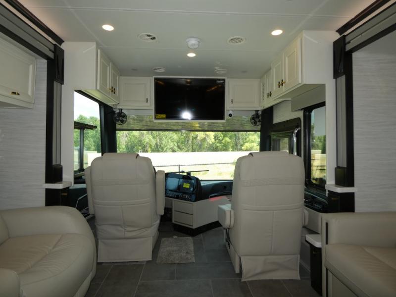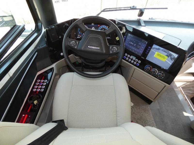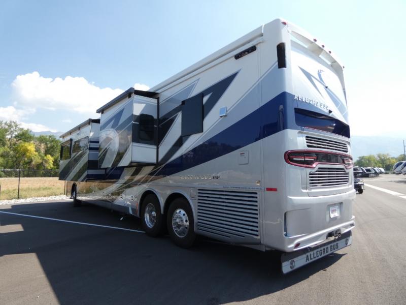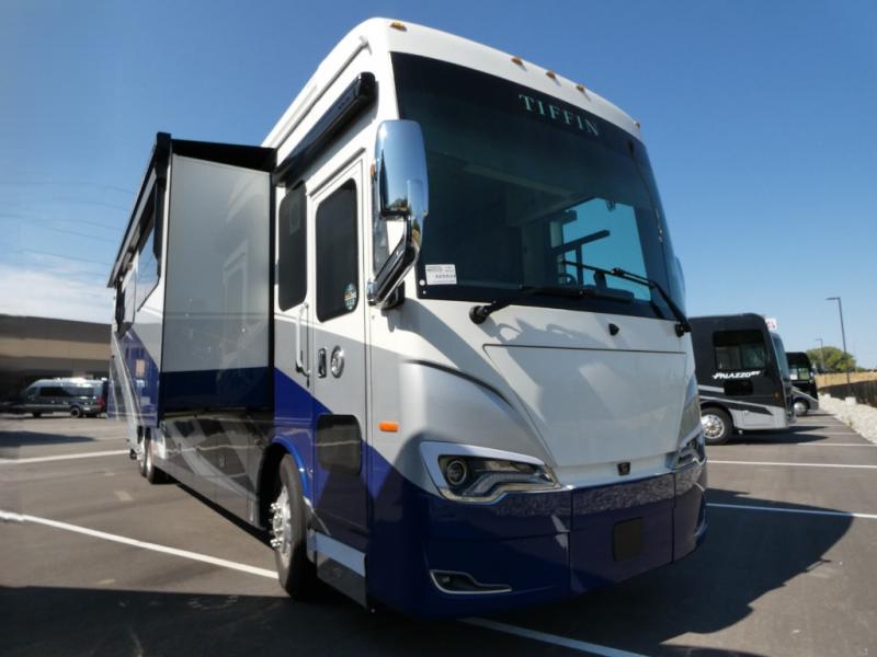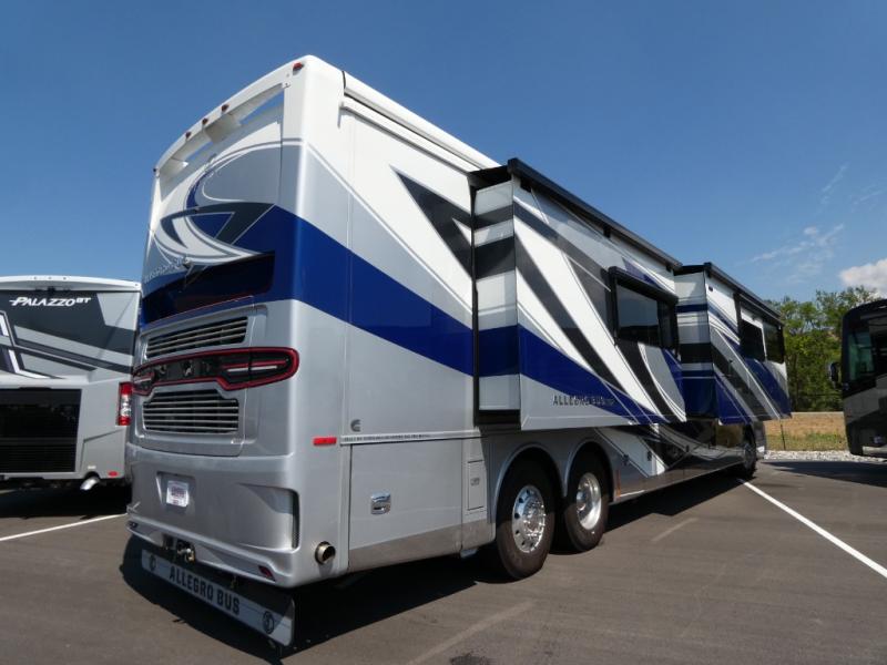 With any Allegro Bus Class A diesel coaches by Tiffin Motorhomes you will experience ultimate luxury, breakthrough technology, and unmatched power thanks to the 450 HP Cummins L9 engine. Each model sits upon a PowerGlide raised rail rear engine diesel chassis for a smooth ride, and you are sure to turn heads with the premium paint system. The captain's job is made easier than ever with the adaptive cruise control, the collision mitigation with forward warning and active braking, and the Valid LCD instrument cluster display with integrated leveling controls. This hydronic heating and electronic appliance-equipped coach features two Girard roof awnings, an Onan 10.0 kW generator, and three 15,000 BTU A/C units to keep you comfortable all year long. New and exciting features include a drawer-style dishwasher on each model, Gold Heat dual zones heated tile floors, a standard exterior ladder, Starlink Pro with a subscription, and more!