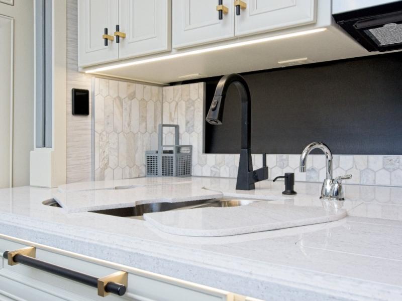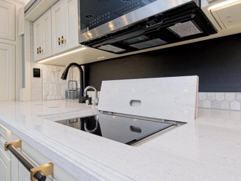 The kitchen is equipped with a two-burner induction cooktop, stainless steel convection microwave with air fryer, and a residential refrigerator. A drawer-style dishwasher makes post-meal cleanup effortless.