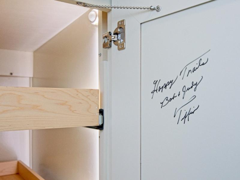 Additional storage includes pull-out pantry drawers and multiple cabinets throughout.