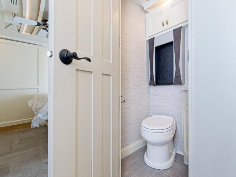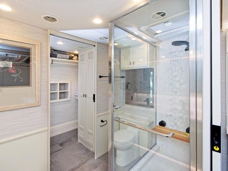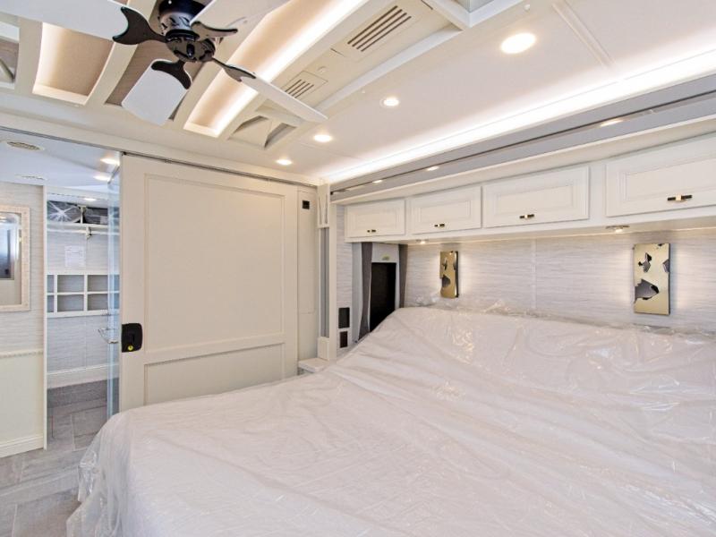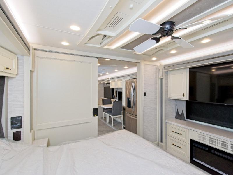 The private rear bedroom features a king-size bed, a full rear bath with a floor-to-ceiling closet, and a stacked washer and dryer—perfect for long-term travel.