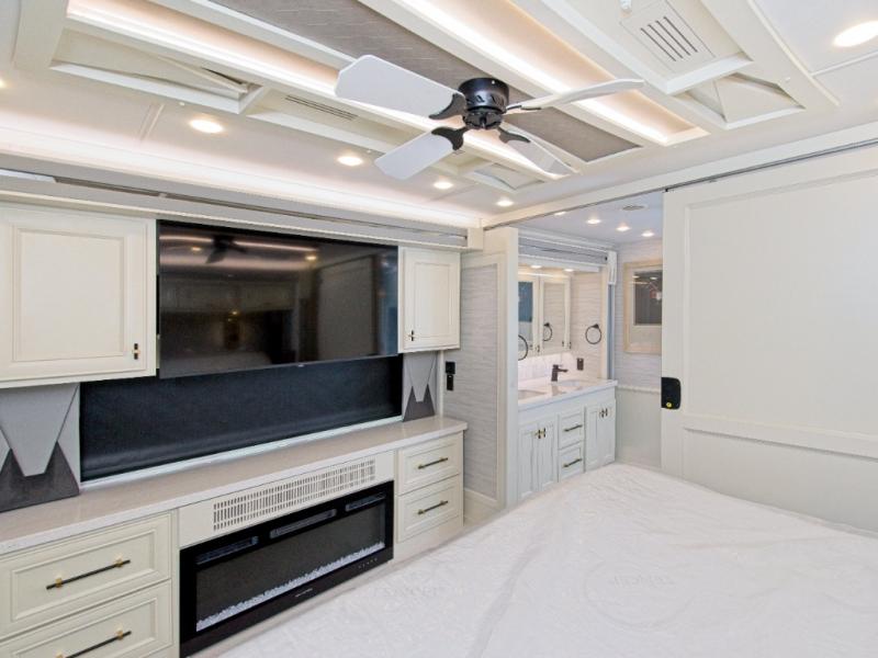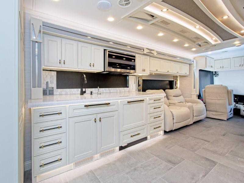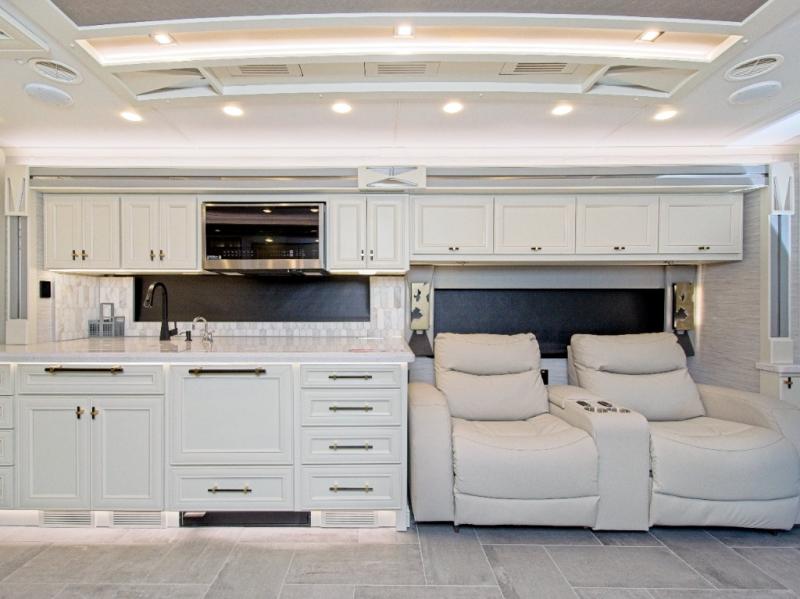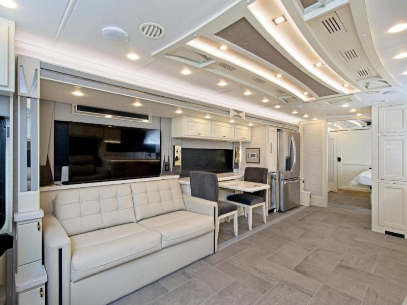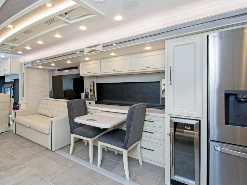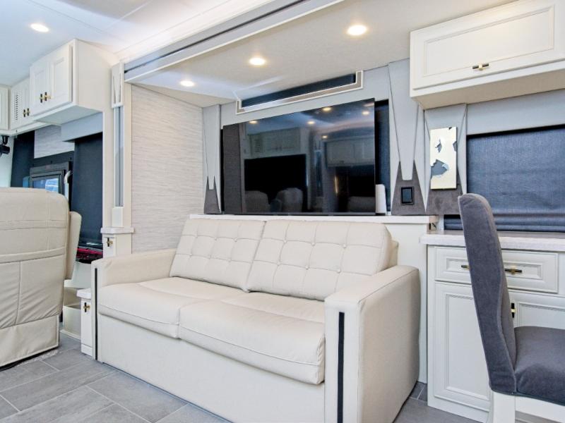 With four slide-outs, the Allegro Bus 45 OPP offers a roomy interior that comfortably sleeps up to six. The main living area includes two sofa beds and a lift TV that tucks away when not in use.
