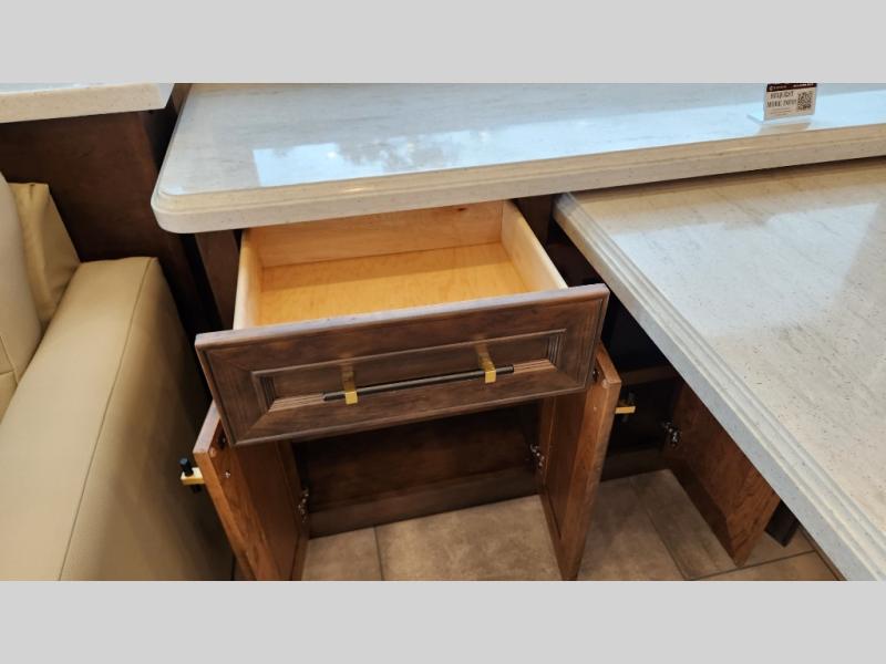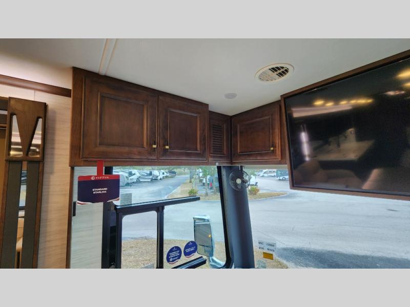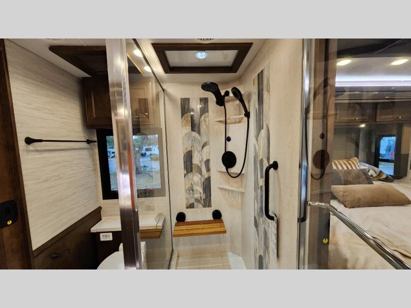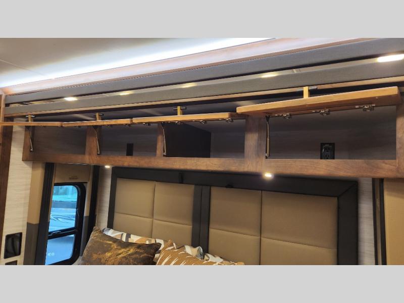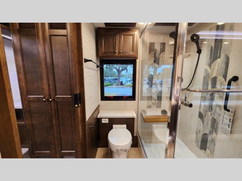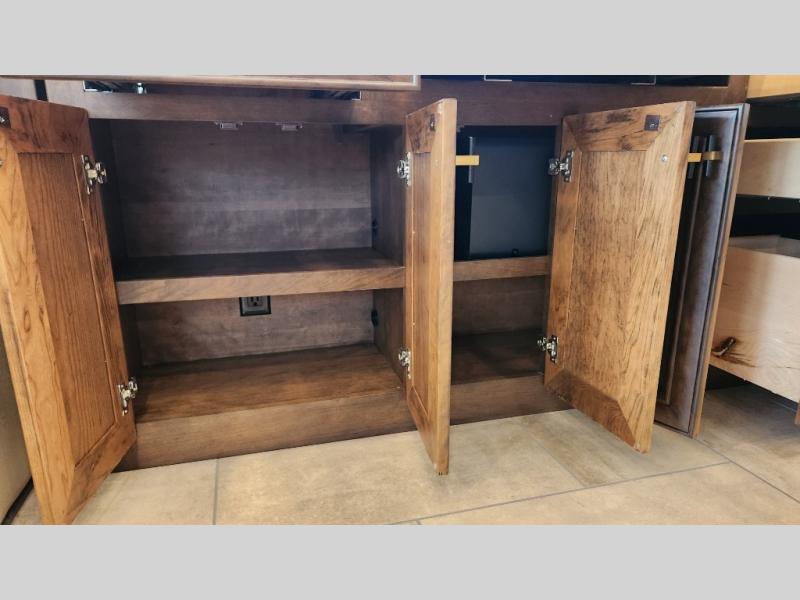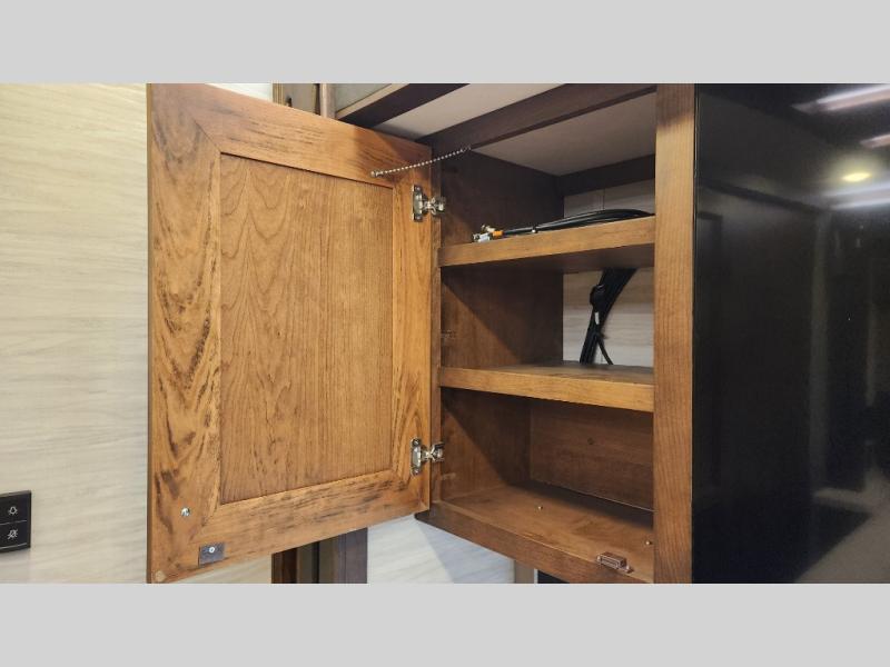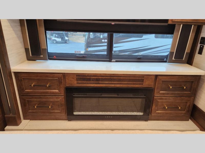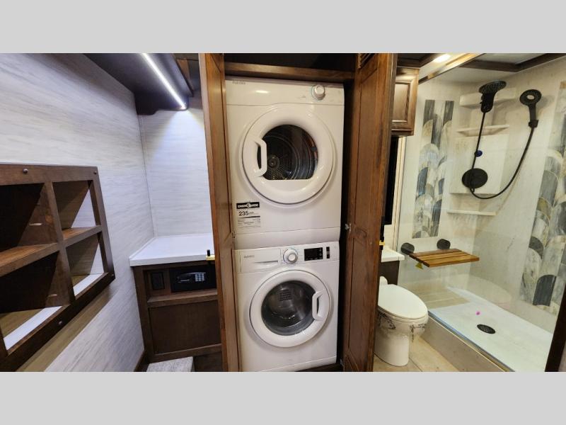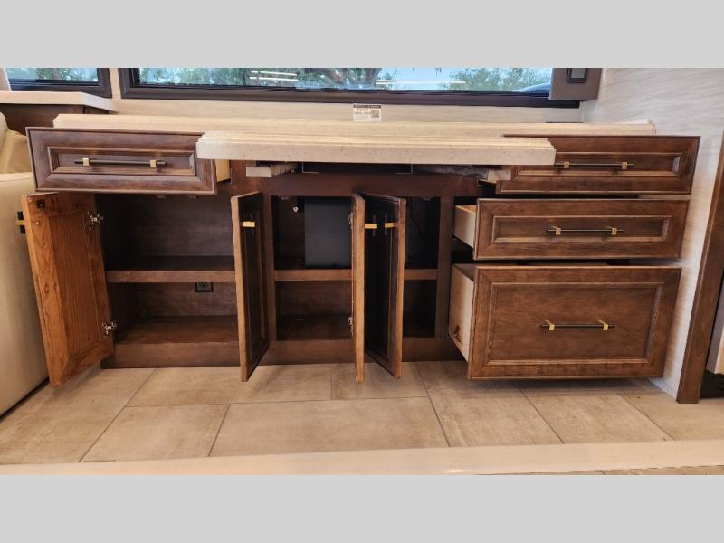 The drive is just as impressive thanks to the FCCC XCS 340HP 252WB chassis with TPM, delivering dependable power, stability, and peace of mind on long hauls. Support systems like electronic stability/traction control, hydraulic jacks, tire pressure sensing, and power driver/passenger seats with footrest keep every journey comfortable and confident. Tech features including WiFi booster, satellite prep, satellite internet prep, in-dash navigation, solar panel prep, and the convenience of a telescoping ladder and exterior TV expand your experience on and off the road. A power drop-down bunk adds flexible sleeping space, and the 8.0 generator with 2000-watt inverter ensures reliable power wherever the adventure takes you.