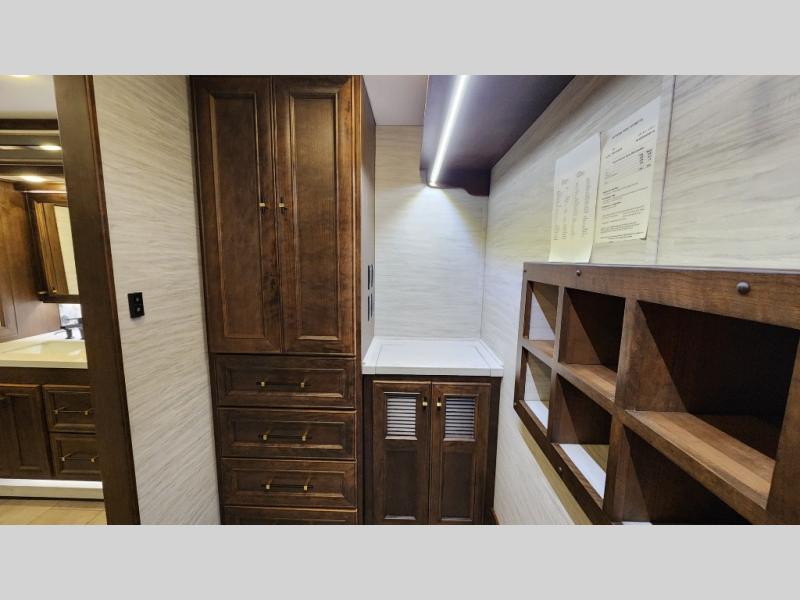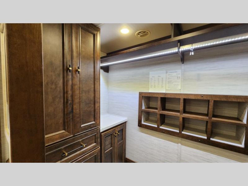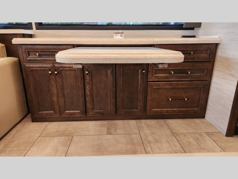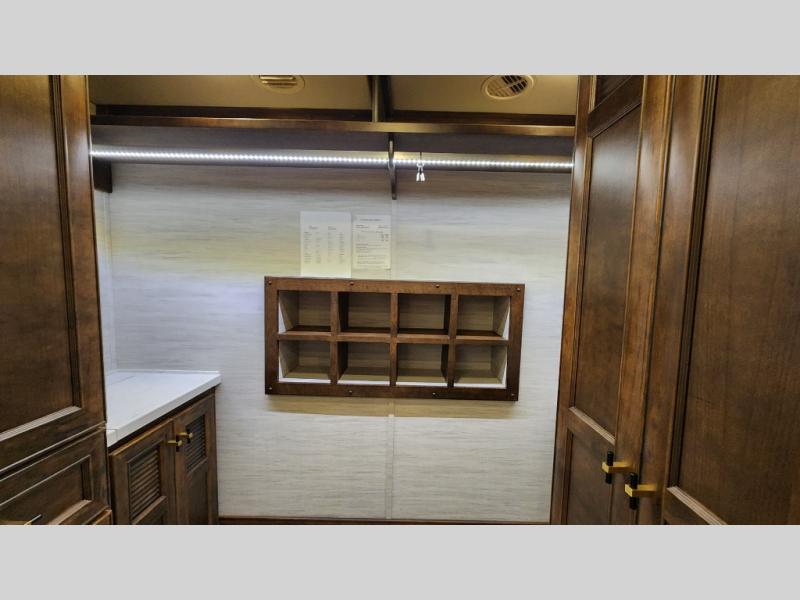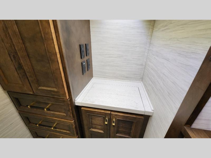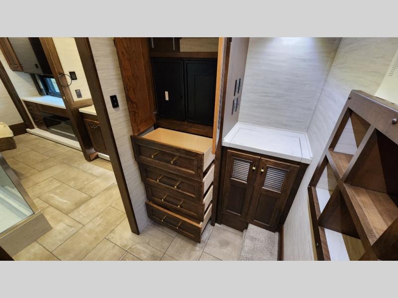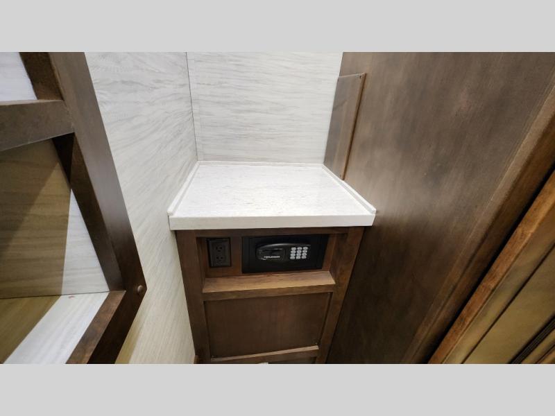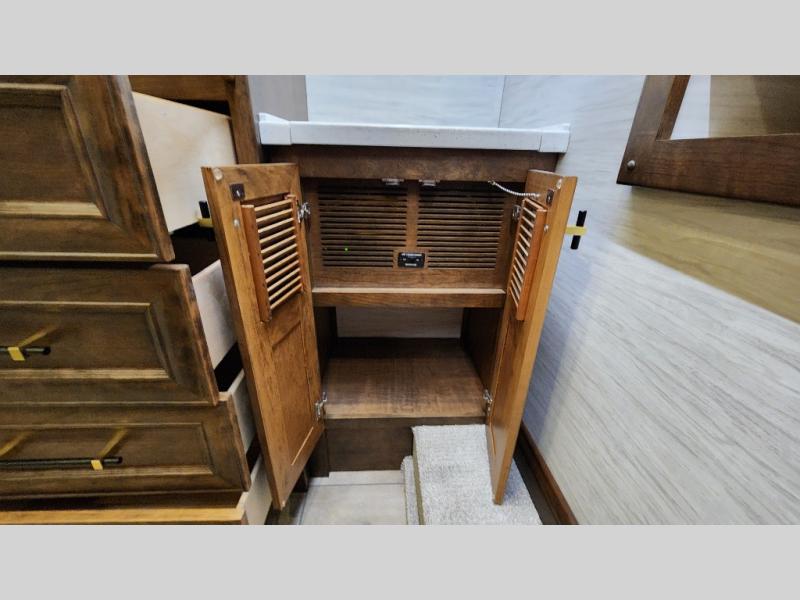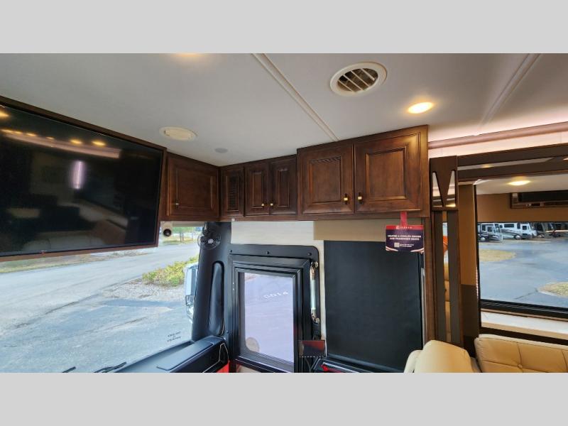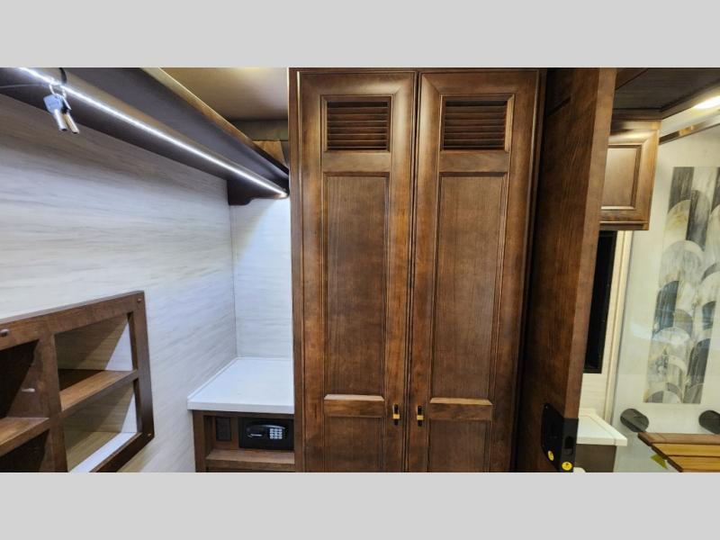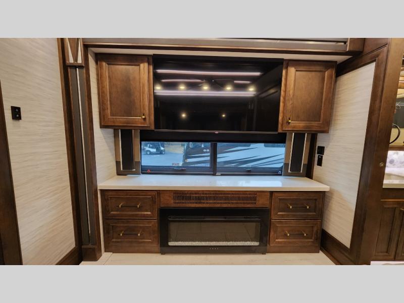 The drive is just as impressive thanks to the FCCC XCS 340HP 252WB chassis with TPM, delivering dependable power, stability, and peace of mind on long hauls. Support systems like electronic stability/traction control, hydraulic jacks, tire pressure sensing, and power driver/passenger seats with footrest keep every journey comfortable and confident. Tech features including WiFi booster, satellite prep, satellite internet prep, in-dash navigation, solar panel prep, and the convenience of a telescoping ladder and exterior TV expand your experience on and off the road. A power drop-down bunk adds flexible sleeping space, and the 8.0 generator with 2000-watt inverter ensures reliable power wherever the adventure takes you.