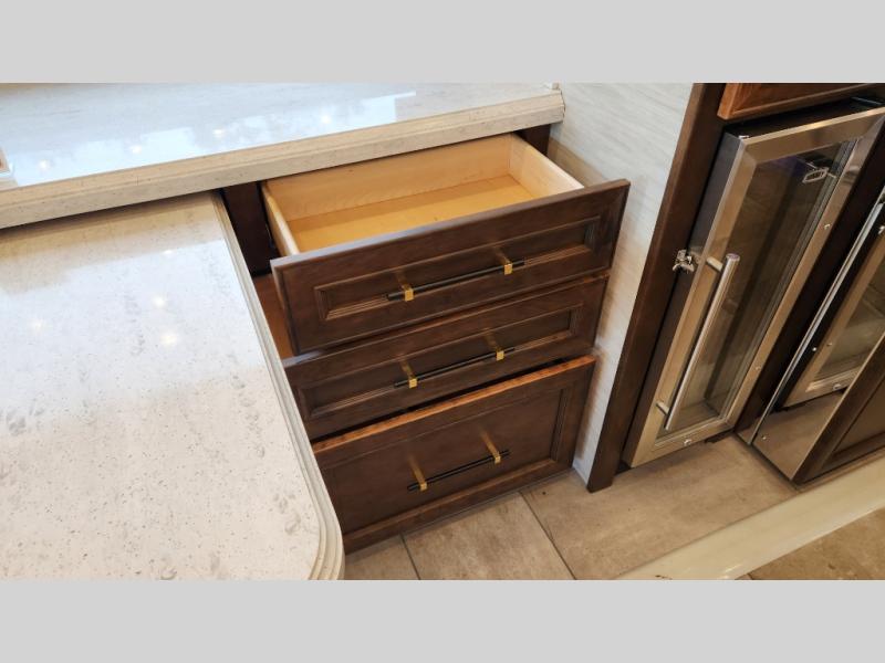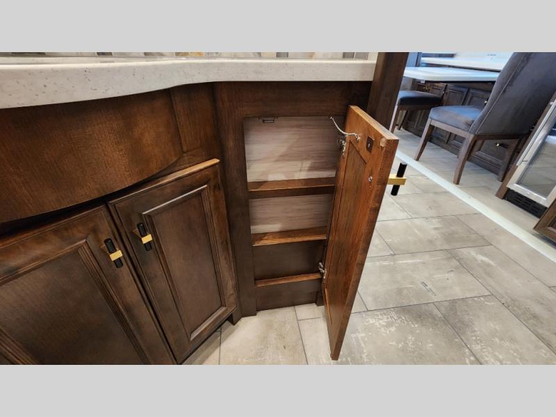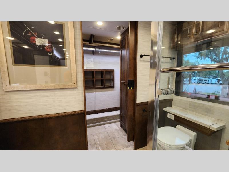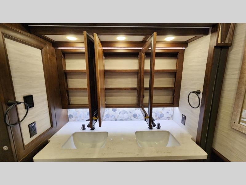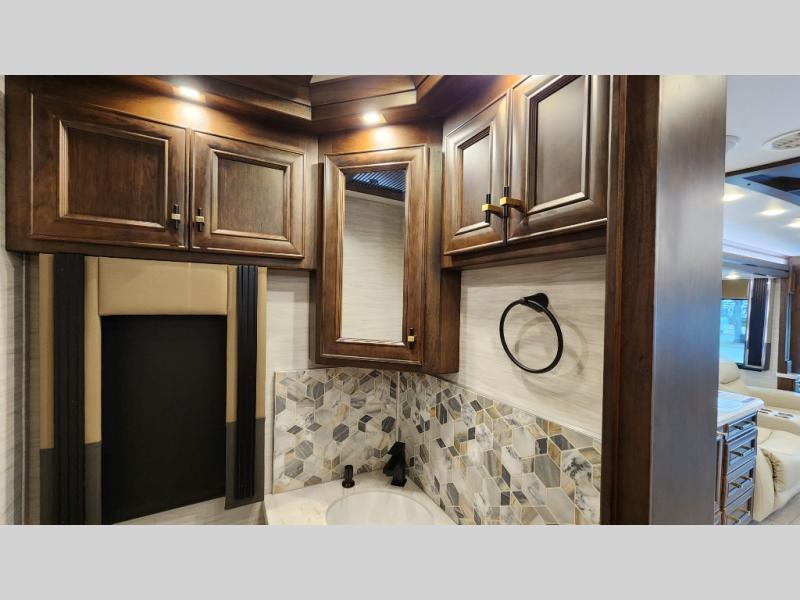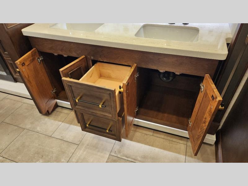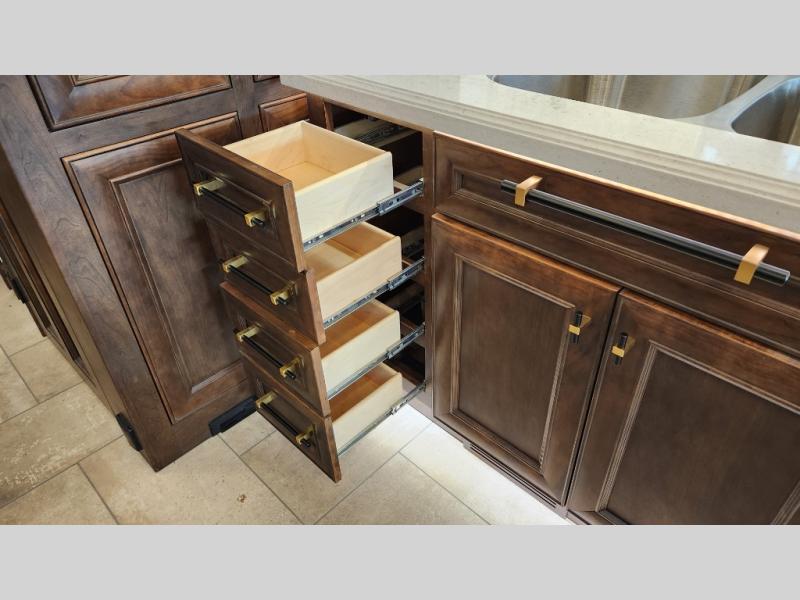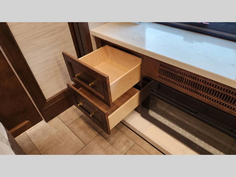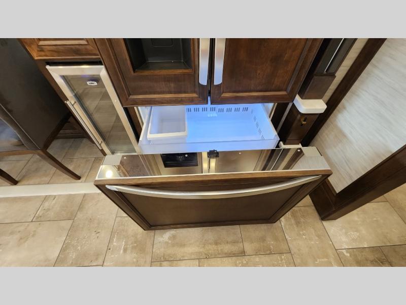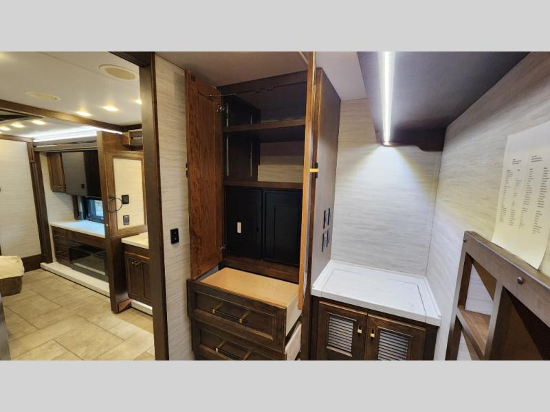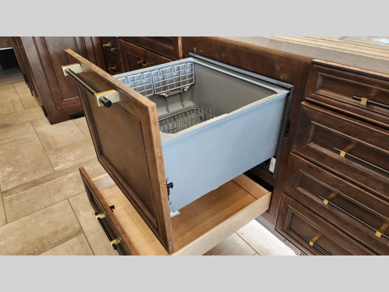 The drive is just as impressive thanks to the FCCC XCS 340HP 252WB chassis with TPM, delivering dependable power, stability, and peace of mind on long hauls. Support systems like electronic stability/traction control, hydraulic jacks, tire pressure sensing, and power driver/passenger seats with footrest keep every journey comfortable and confident. Tech features including WiFi booster, satellite prep, satellite internet prep, in-dash navigation, solar panel prep, and the convenience of a telescoping ladder and exterior TV expand your experience on and off the road. A power drop-down bunk adds flexible sleeping space, and the 8.0 generator with 2000-watt inverter ensures reliable power wherever the adventure takes you.