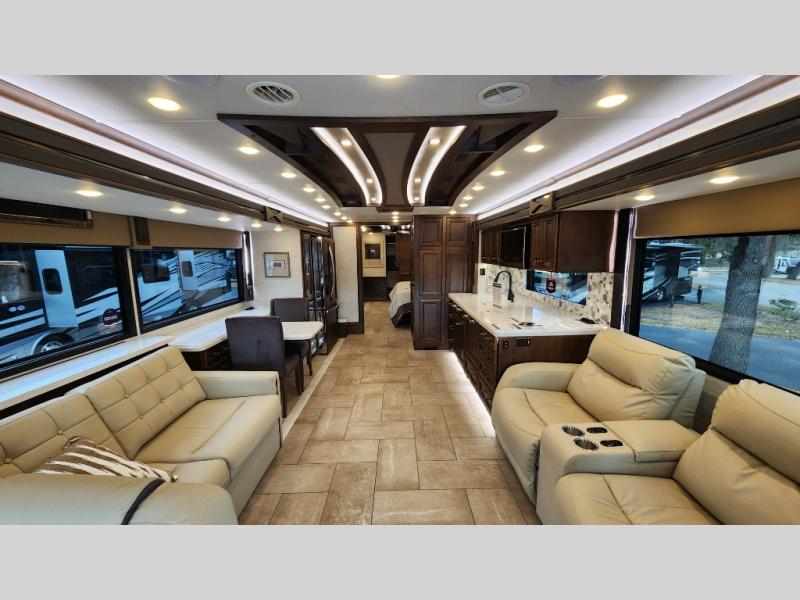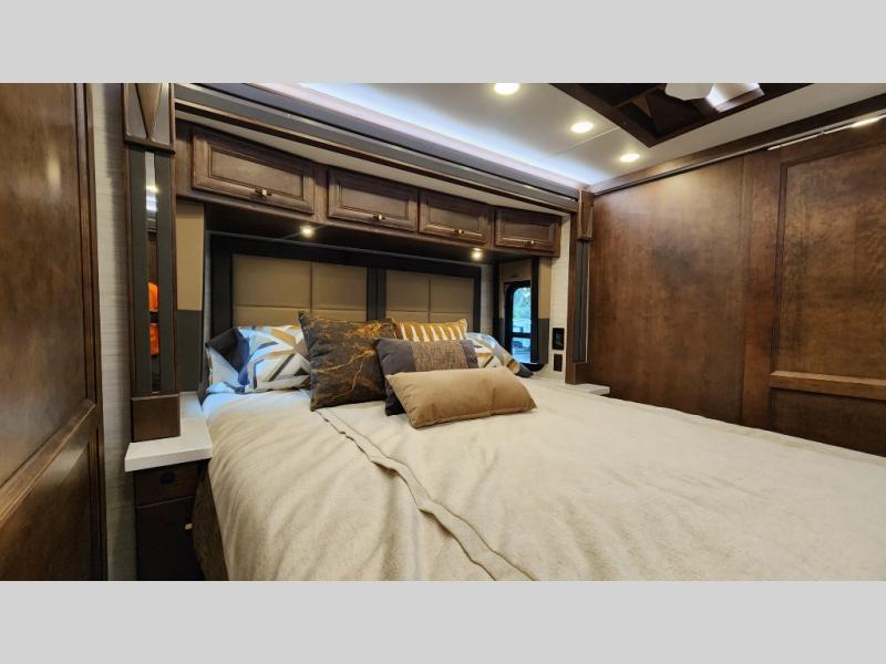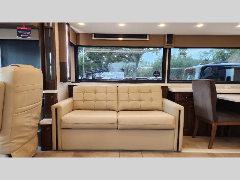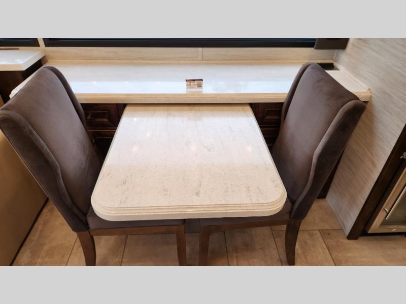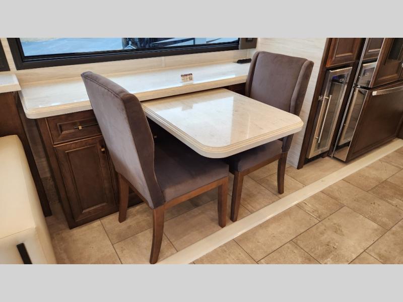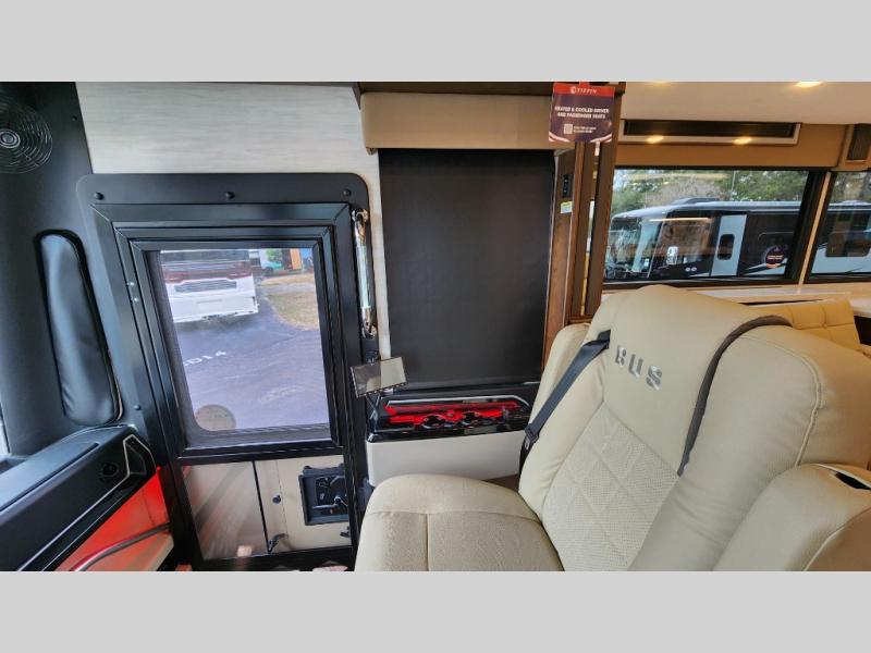 **Frost Granite G2 Full Body Paint • Sandstone Cabinets • Desert Retreat Interior • (2) 15,000 A/C w/Heat Pump • Air Coil Sofa – DS • Black Aluminum Wheels • Cooktop/Convection Microwave • Dinette w/Chairs DS • Power Drop Down Bunk • In-Dash Navigation • Dune Tile Flooring • Residential Refrigerator • Electronic Stability/Traction Control • Fireplace • 8.0 Generator • Hydraulic Jacks • 2000W Inverter • King Bed • Telescoping Ladder • Exterior TV • Power DS/PS Seats w/PS Footrest • Satellite Prep • Satellite Internet Prep • Showermiser • Solar Panel Prep • Stacked Washer/Dryer • Truma Water Heater • Tire Pressure Sensing • Central Vacuum • WiFi Booster • FCCC XCS 340HP 252WB w/TPM
