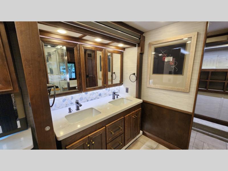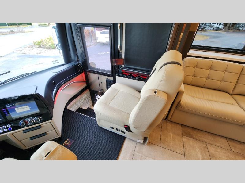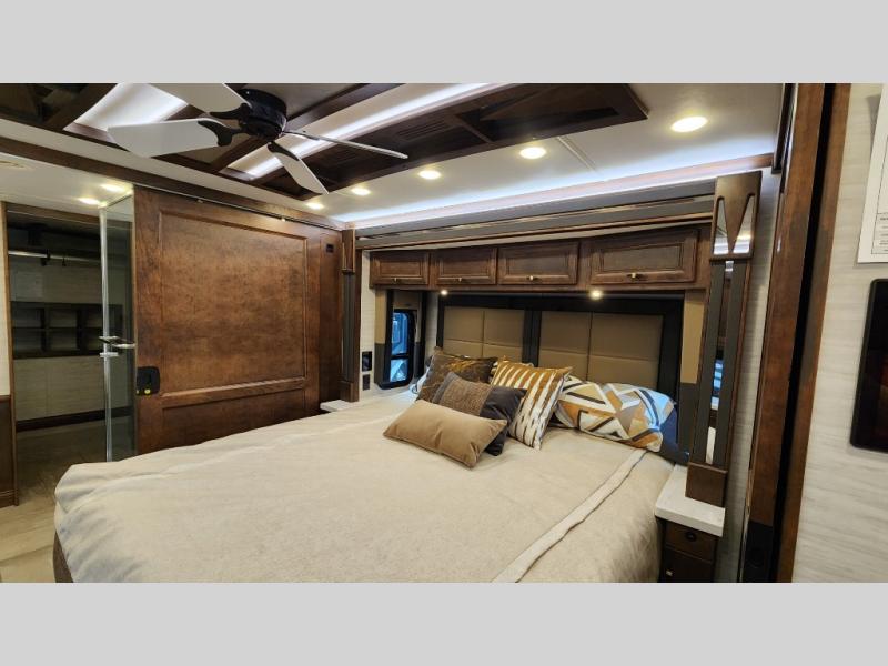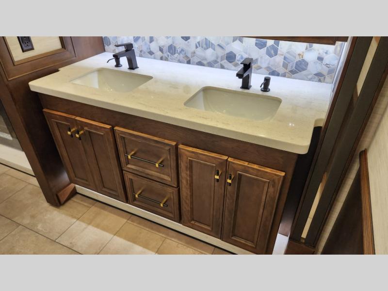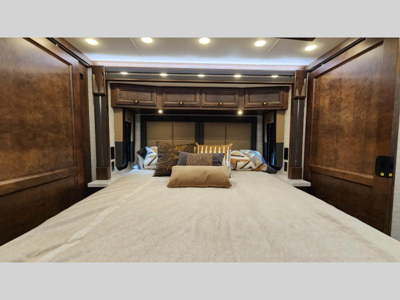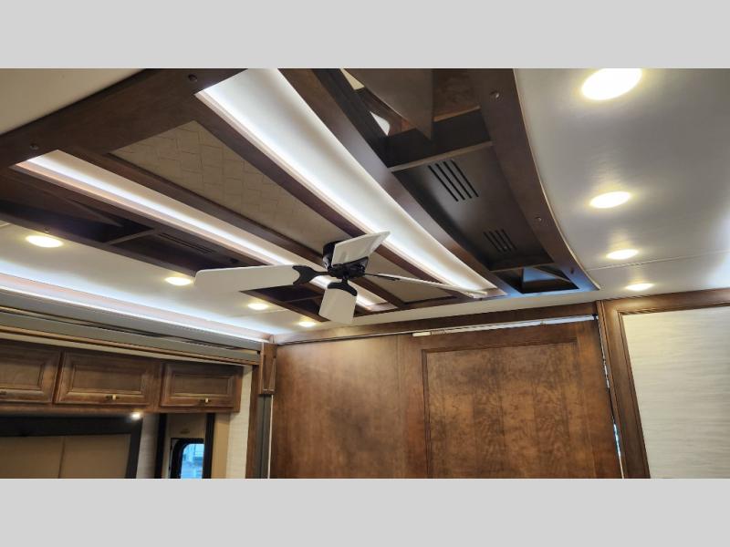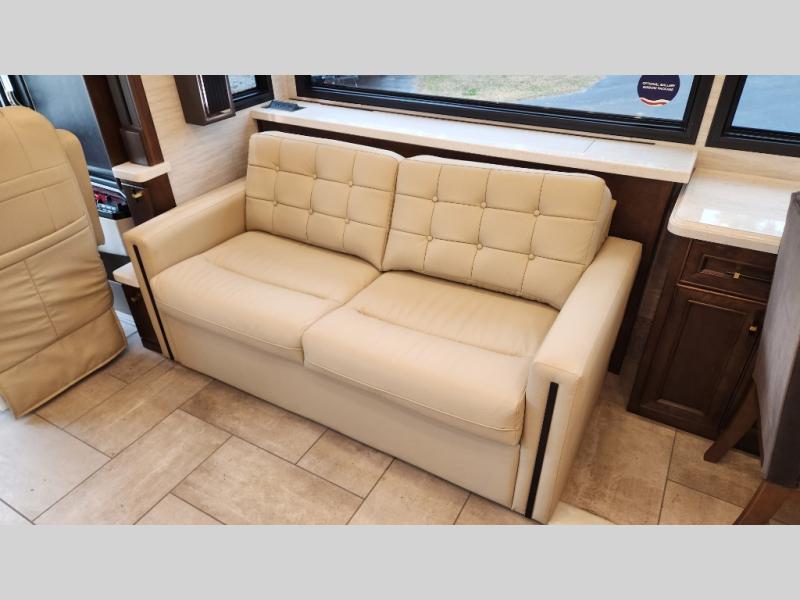 **Frost Granite G2 Full Body Paint • Sandstone Cabinets • Desert Retreat Interior • (2) 15,000 A/C w/Heat Pump • Air Coil Sofa – DS • Black Aluminum Wheels • Cooktop/Convection Microwave • Dinette w/Chairs DS • Power Drop Down Bunk • In-Dash Navigation • Dune Tile Flooring • Residential Refrigerator • Electronic Stability/Traction Control • Fireplace • 8.0 Generator • Hydraulic Jacks • 2000W Inverter • King Bed • Telescoping Ladder • Exterior TV • Power DS/PS Seats w/PS Footrest • Satellite Prep • Satellite Internet Prep • Showermiser • Solar Panel Prep • Stacked Washer/Dryer • Truma Water Heater • Tire Pressure Sensing • Central Vacuum • WiFi Booster • FCCC XCS 340HP 252WB w/TPM