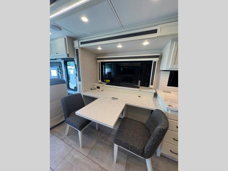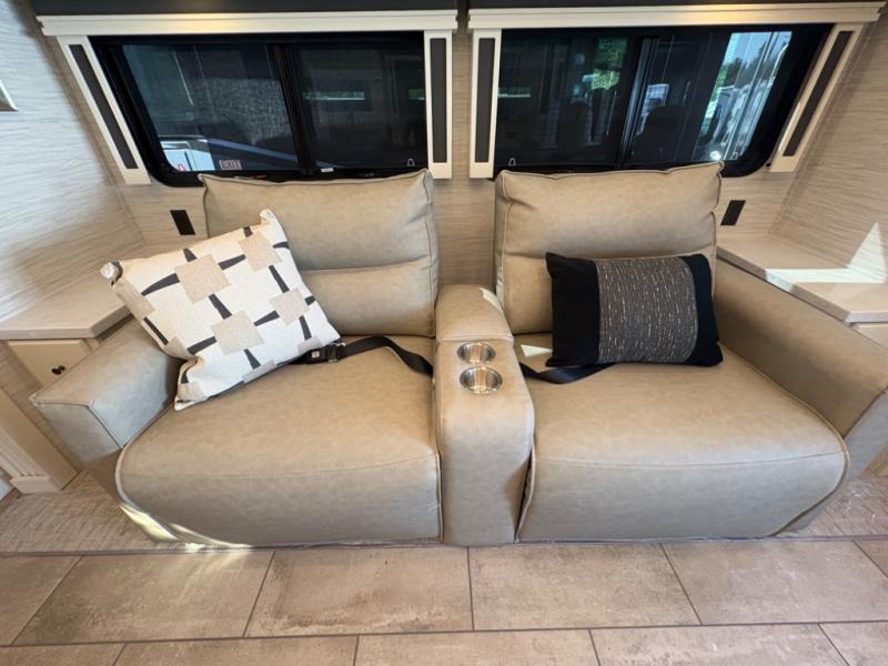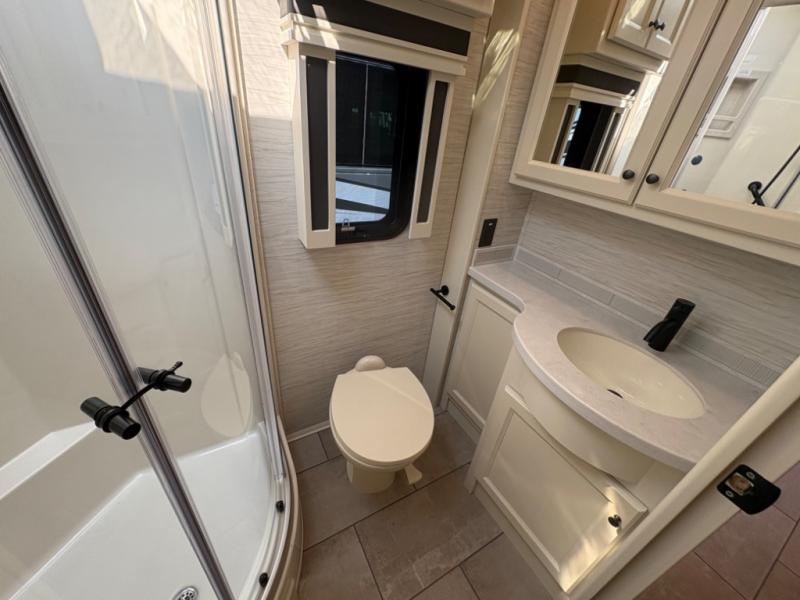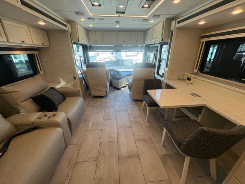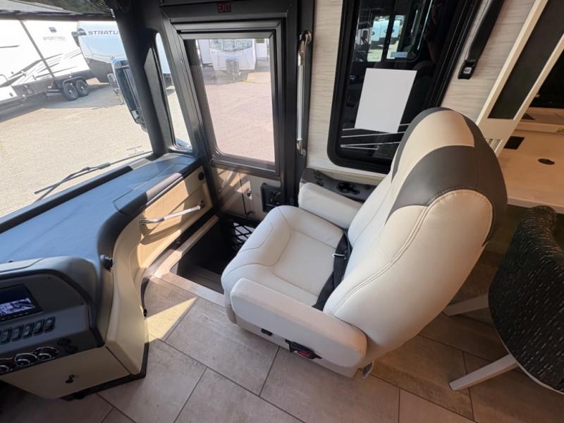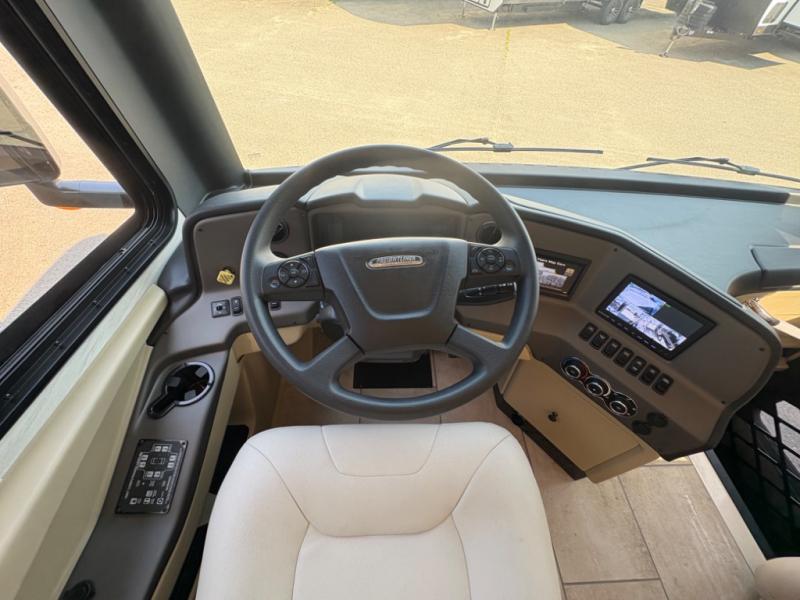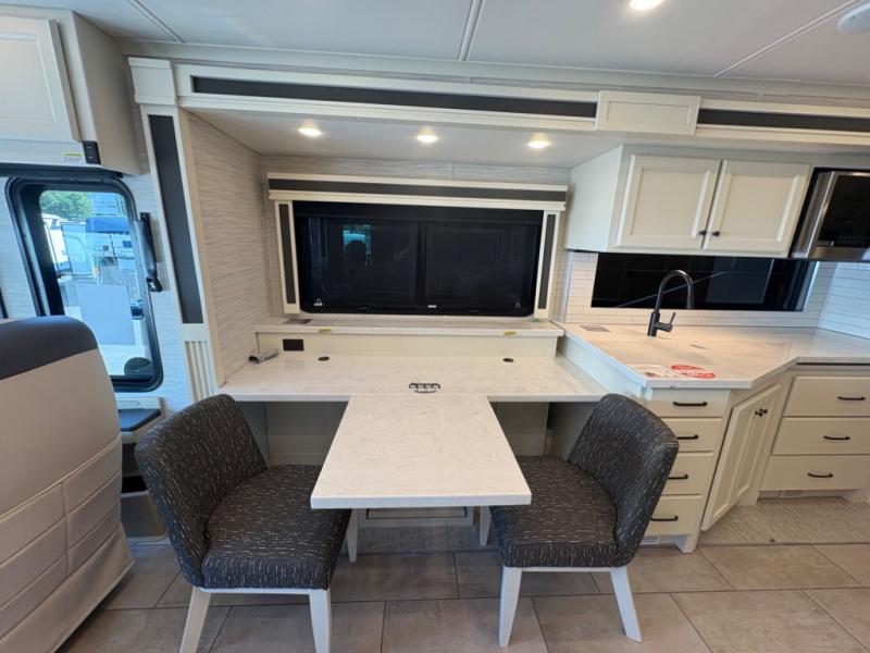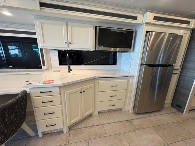 There are many, many reasons you'll instantly fall in love with this Allegro RED Class A diesel motorhome! You have three TVs including an exterior one to keep everyone entertained, and the kitchen is filled with tons of tools to create delicious meals, like a 1.7 cu. ft. smart convection microwave with air fry, 20 cu. ft. stainless steel residential refrigerator with top freezer, pantry, double-bowl sink, and panoramic galley window. You'll also be quite impressed with the full bathroom that has a one-piece fiberglass shower, roof vent fan, solid-surface vanity top, and a skylight and LED light in the shower. If you need more sleeping space in addition to the 72" x 80" king bed, air coil sofa bed, a booth dinette sleeper, you could switch out for three different seating choices, including an optional super sofa or U-shaped dinette!