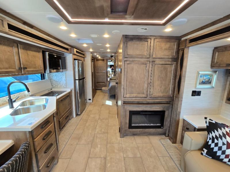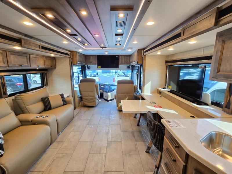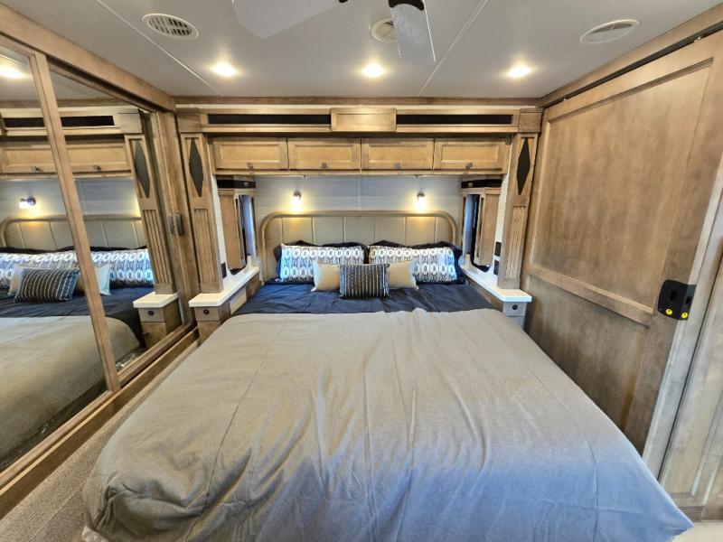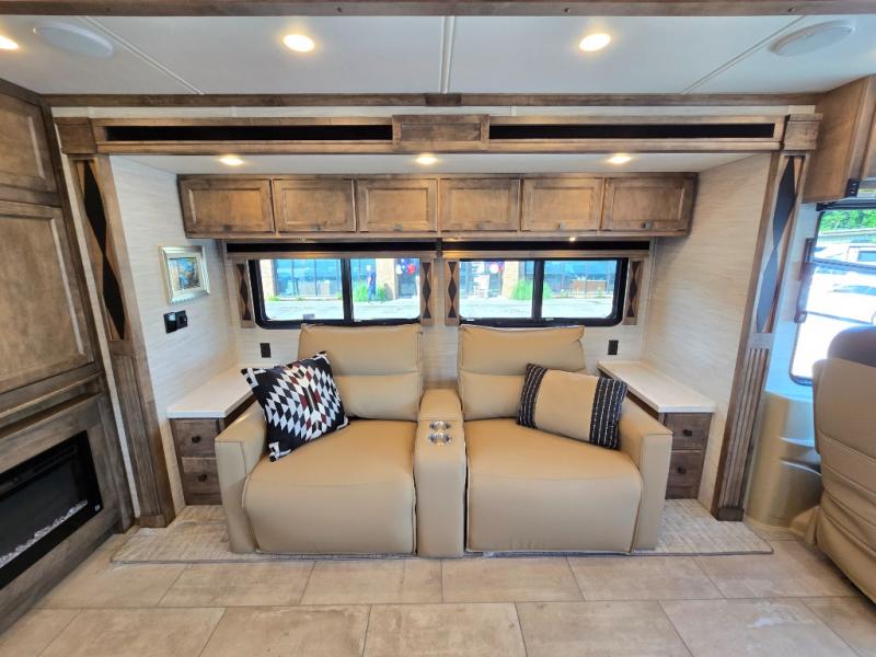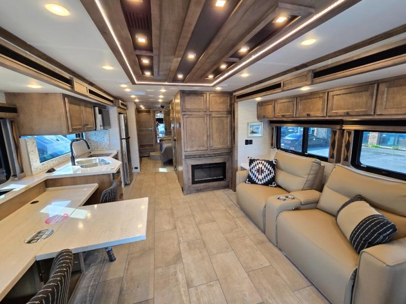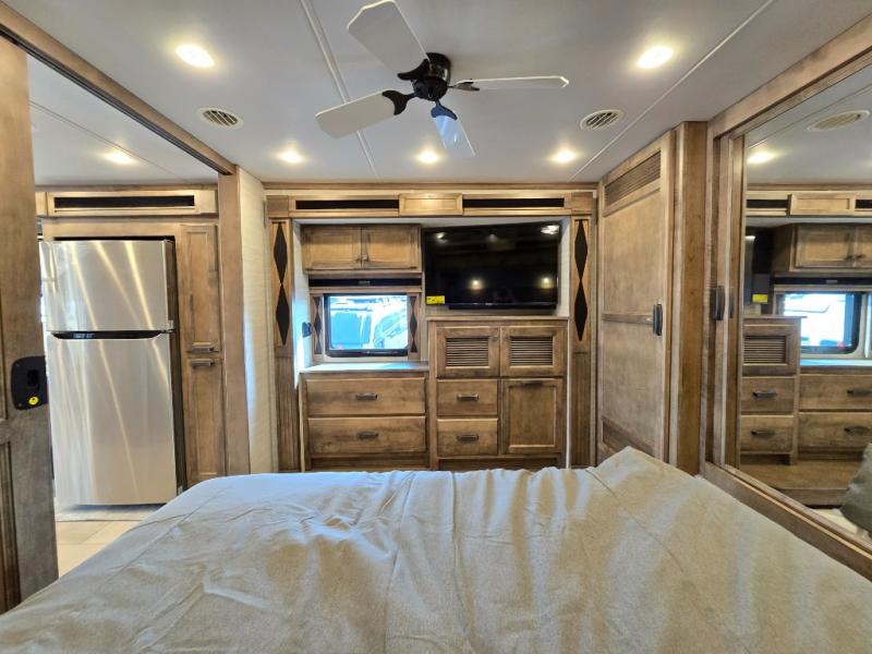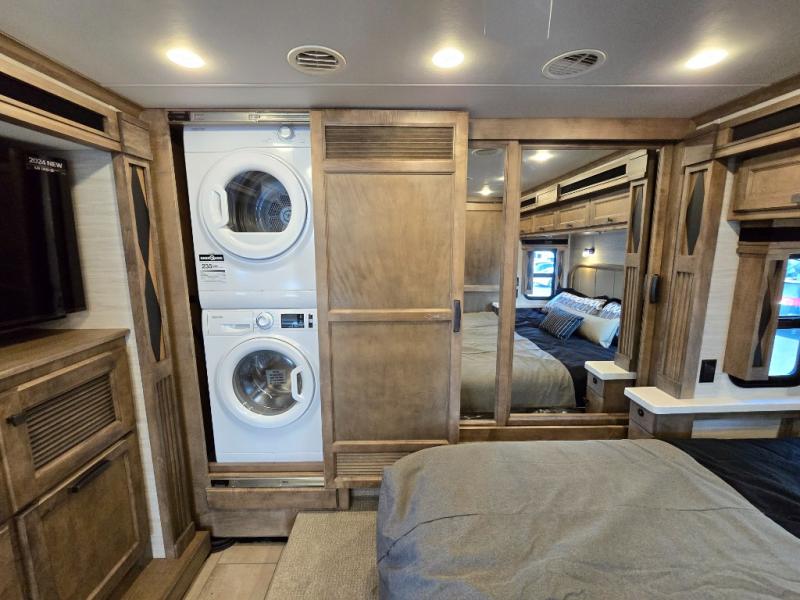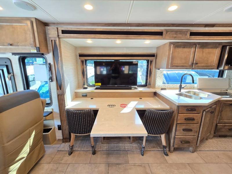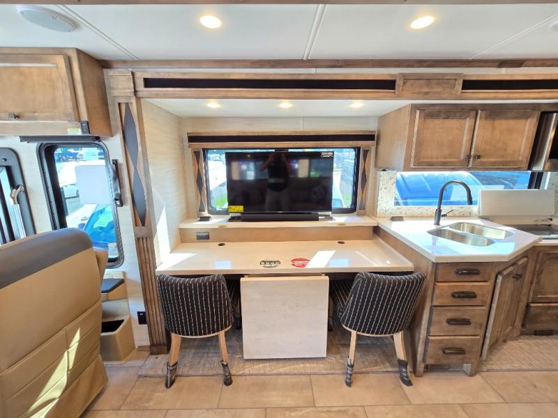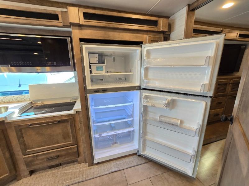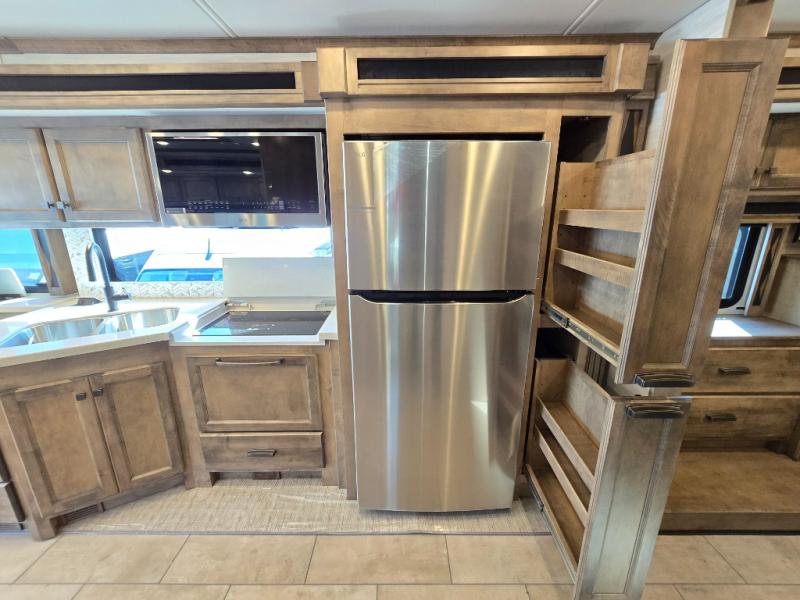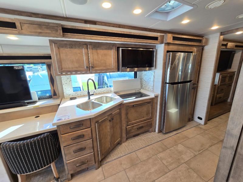 There are many, many reasons you'll instantly fall in love with this Allegro RED Class A diesel motorhome! You have three TVs including an exterior one to keep everyone entertained, and the kitchen is filled with tons of tools to create delicious meals, like a 1.7 cu. ft. smart convection microwave with air fry, 20 cu. ft. stainless steel residential refrigerator with top freezer, pantry, double-bowl sink, and panoramic galley window. You'll also be quite impressed with the full bathroom that has a one-piece fiberglass shower, roof vent fan, solid-surface vanity top, and a skylight and LED light in the shower. If you need more sleeping space in addition to the 72" x 80" king bed, air coil sofa bed, a booth dinette sleeper, you could switch out for three different seating choices, including an optional super sofa or U-shaped dinette!