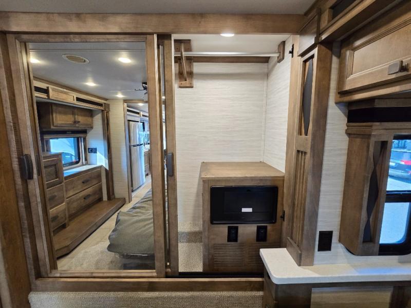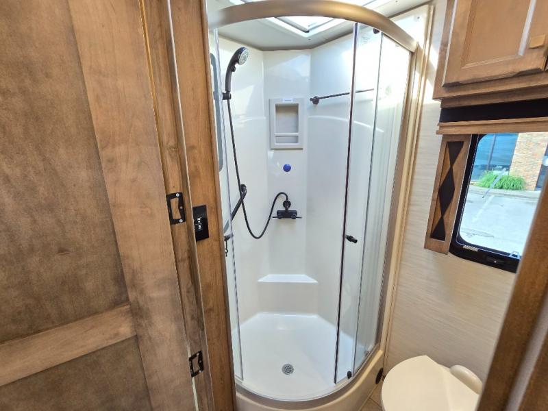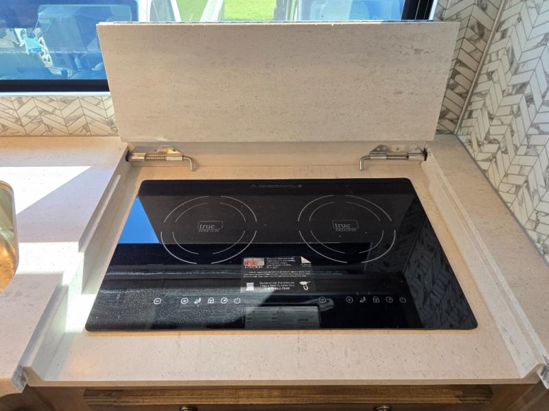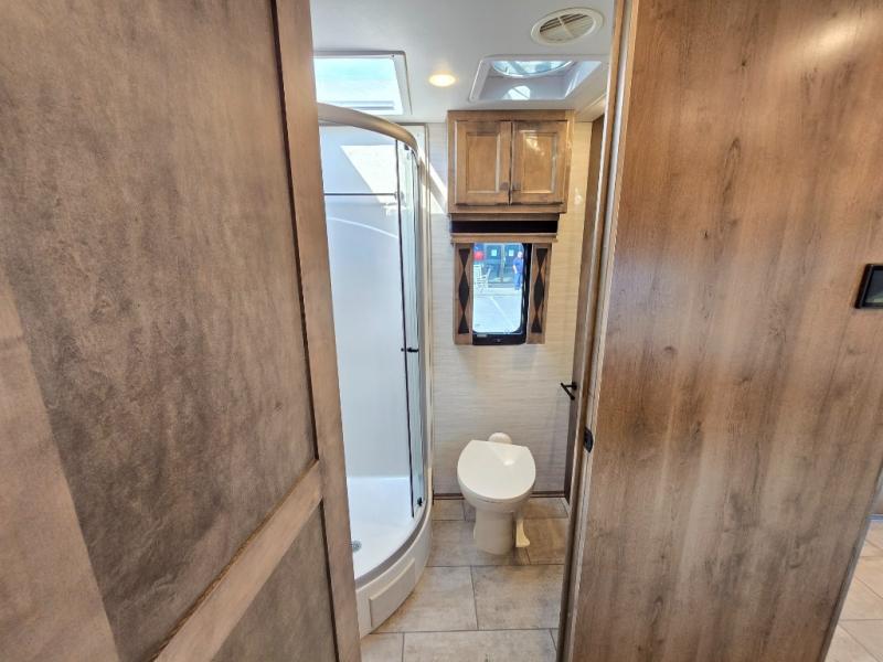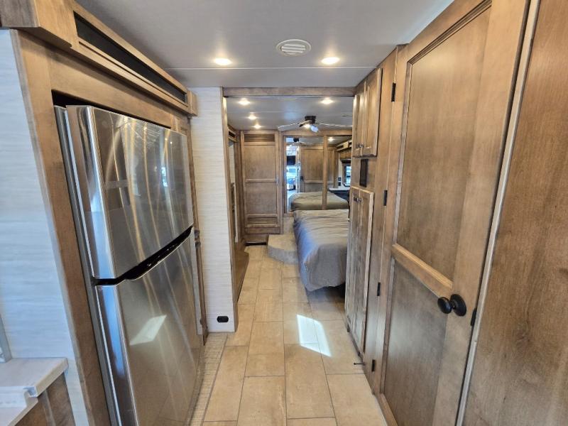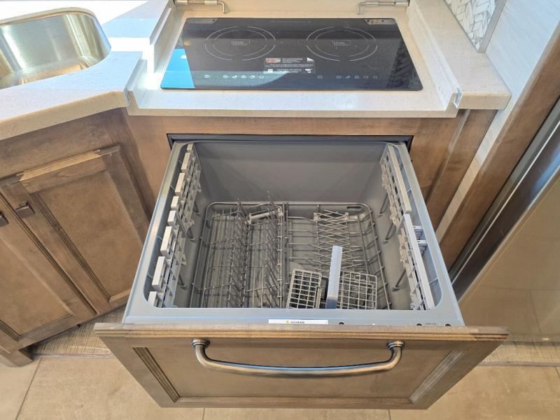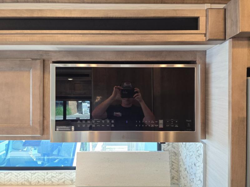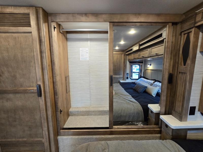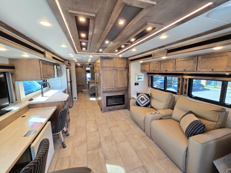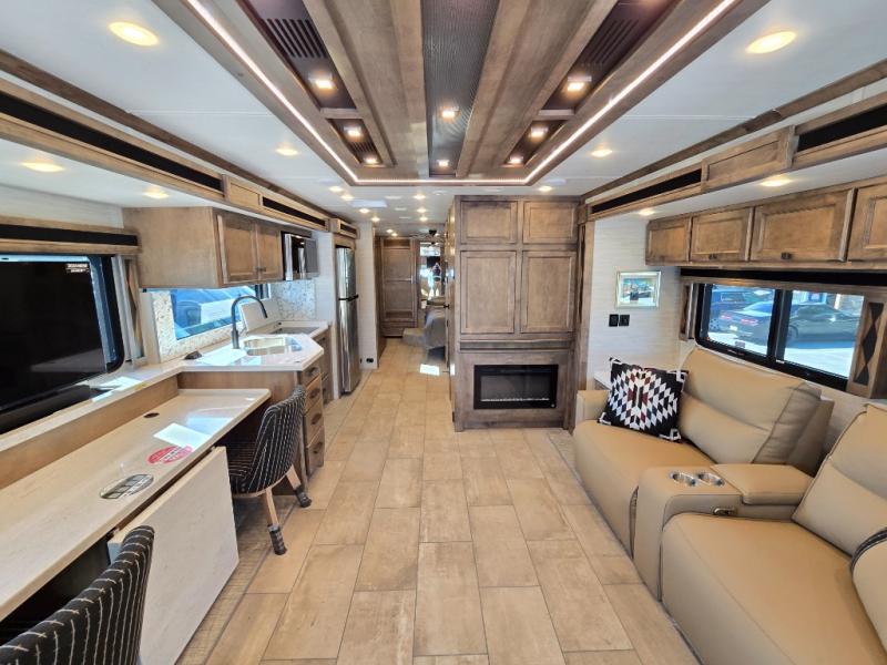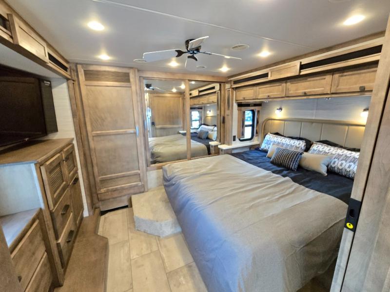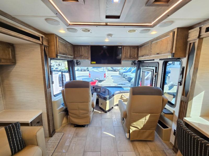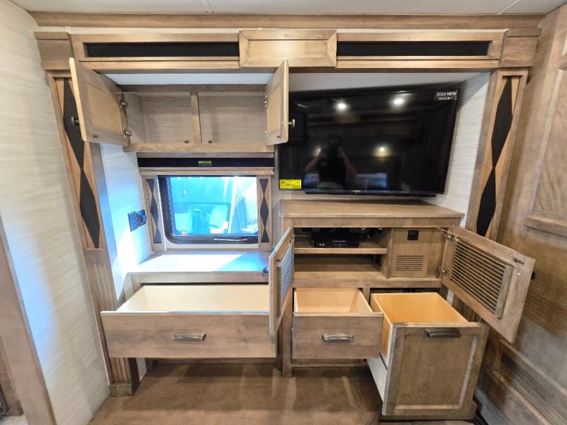 There are many, many reasons you'll instantly fall in love with this Allegro RED Class A diesel motorhome! You have three TVs including an exterior one to keep everyone entertained, and the kitchen is filled with tons of tools to create delicious meals, like a 1.7 cu. ft. smart convection microwave with air fry, 20 cu. ft. stainless steel residential refrigerator with top freezer, pantry, double-bowl sink, and panoramic galley window. You'll also be quite impressed with the full bathroom that has a one-piece fiberglass shower, roof vent fan, solid-surface vanity top, and a skylight and LED light in the shower. If you need more sleeping space in addition to the 72" x 80" king bed, air coil sofa bed, a booth dinette sleeper, you could switch out for three different seating choices, including an optional super sofa or U-shaped dinette!