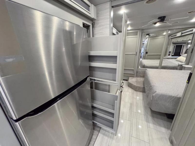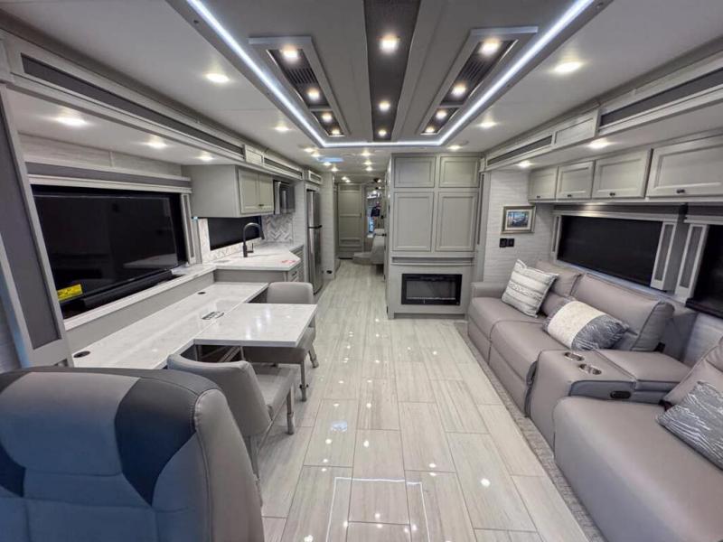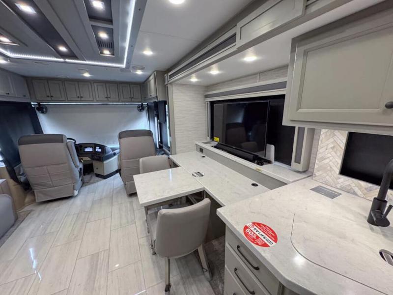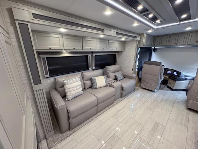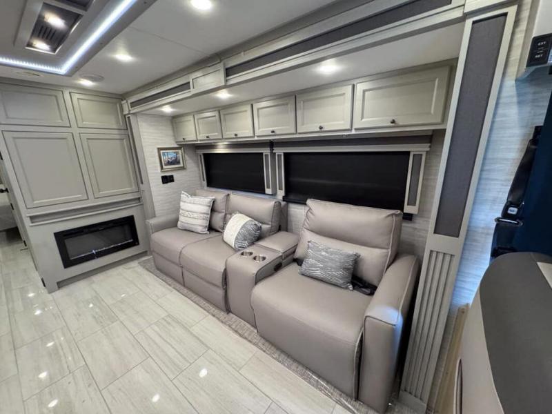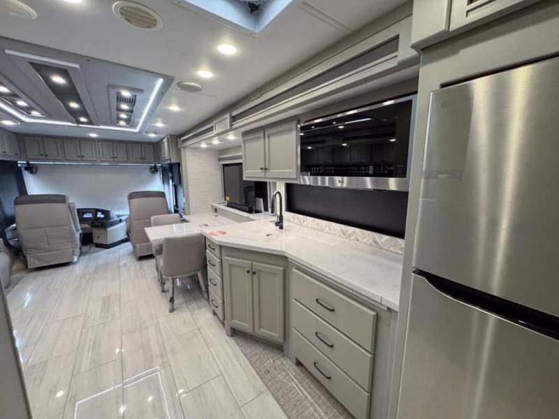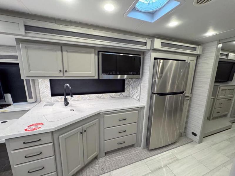 There are many, many reasons you'll instantly fall in love with this Allegro RED Class A diesel motorhome! You have three TVs including an exterior one to keep everyone entertained, and the kitchen is filled with tons of tools to create delicious meals, like a 1.7 cu. ft. smart convection microwave with air fry, 20 cu. ft. stainless steel residential refrigerator with top freezer, pantry, double-bowl sink, and panoramic galley window. You'll also be quite impressed with the full bathroom that has a one-piece fiberglass shower, roof vent fan, solid-surface vanity top, and a skylight and LED light in the shower. If you need more sleeping space in addition to the 72" x 80" king bed, air coil sofa bed, a booth dinette sleeper, you could switch out for three different seating choices, including an optional super sofa or U-shaped dinette!