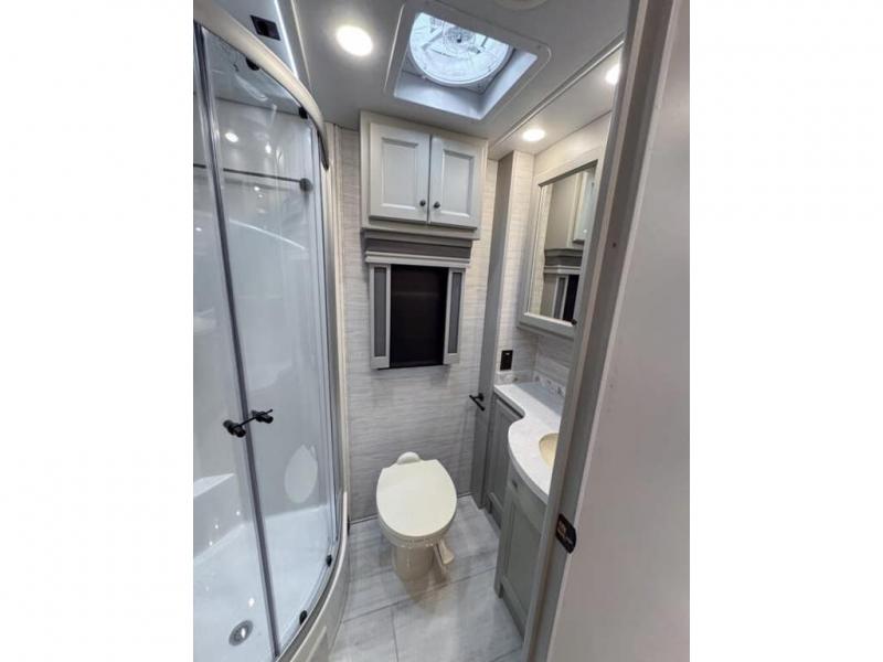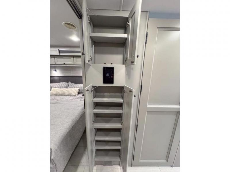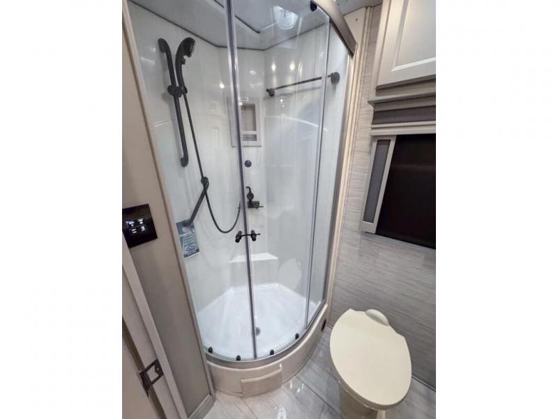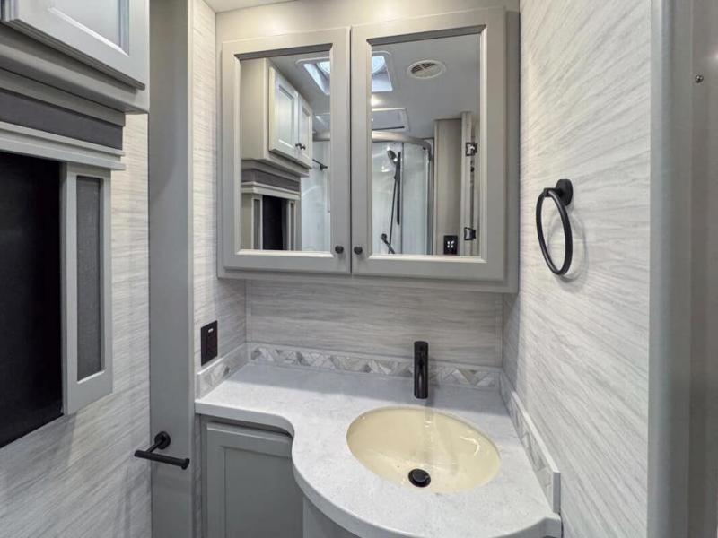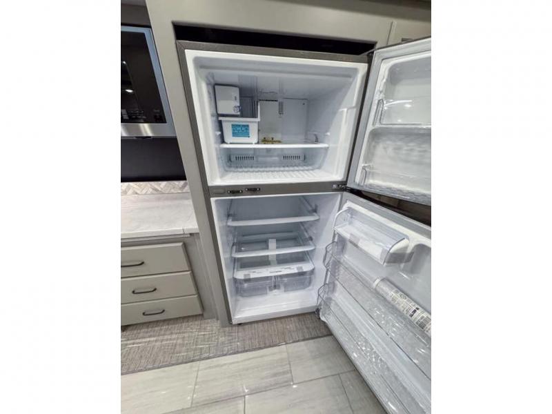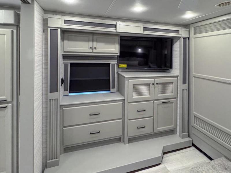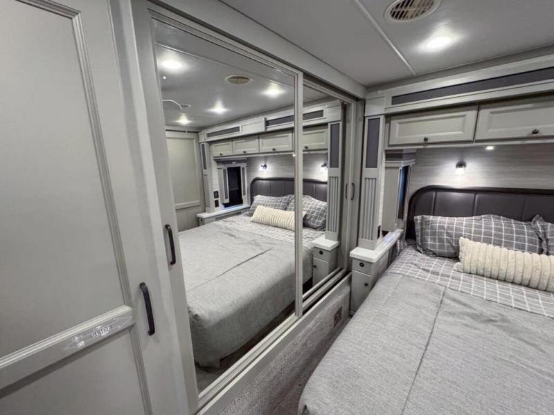 There are many, many reasons you'll instantly fall in love with this Allegro RED Class A diesel motorhome! You have three TVs including an exterior one to keep everyone entertained, and the kitchen is filled with tons of tools to create delicious meals, like a 1.7 cu. ft. smart convection microwave with air fry, 20 cu. ft. stainless steel residential refrigerator with top freezer, pantry, double-bowl sink, and panoramic galley window. You'll also be quite impressed with the full bathroom that has a one-piece fiberglass shower, roof vent fan, solid-surface vanity top, and a skylight and LED light in the shower. If you need more sleeping space in addition to the 72" x 80" king bed, air coil sofa bed, a booth dinette sleeper, you could switch out for three different seating choices, including an optional super sofa or U-shaped dinette!