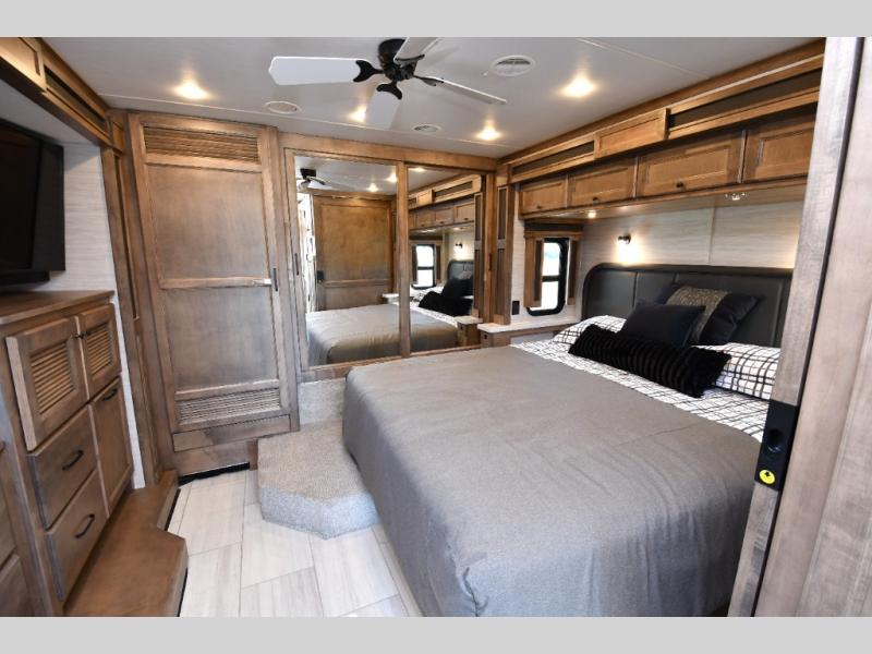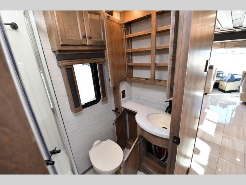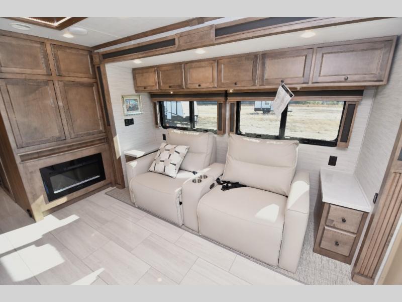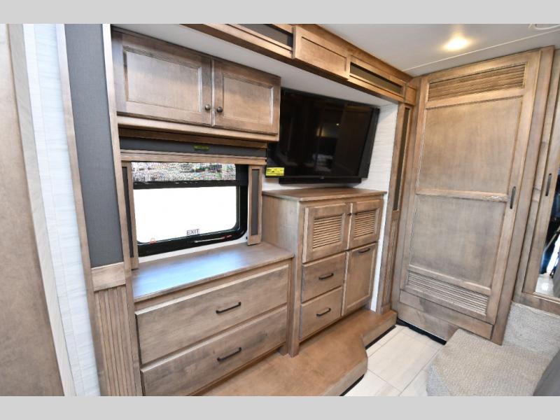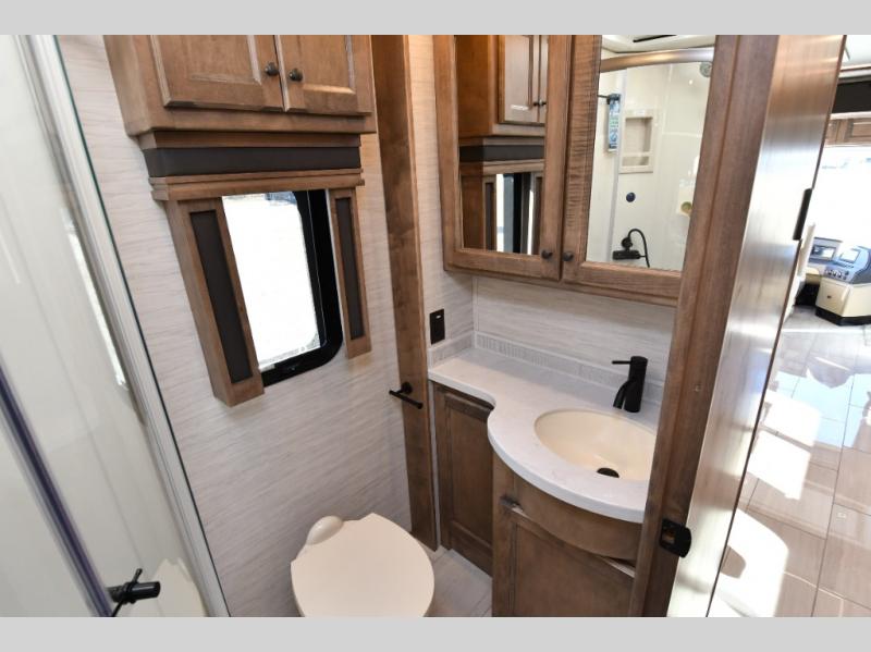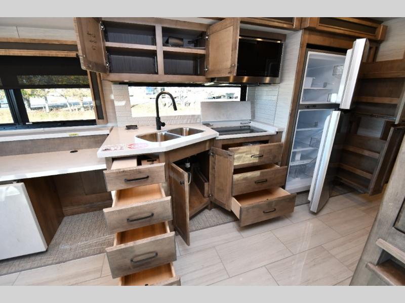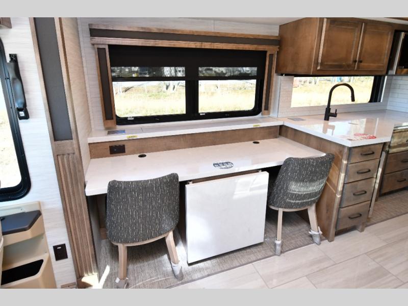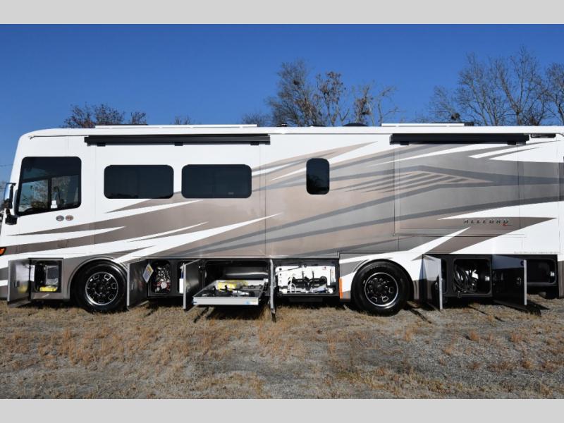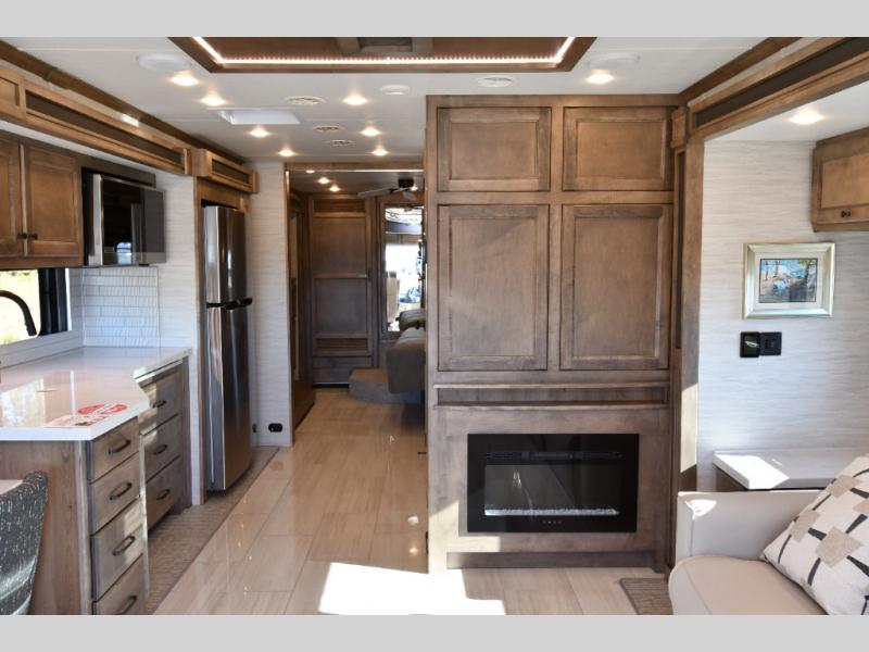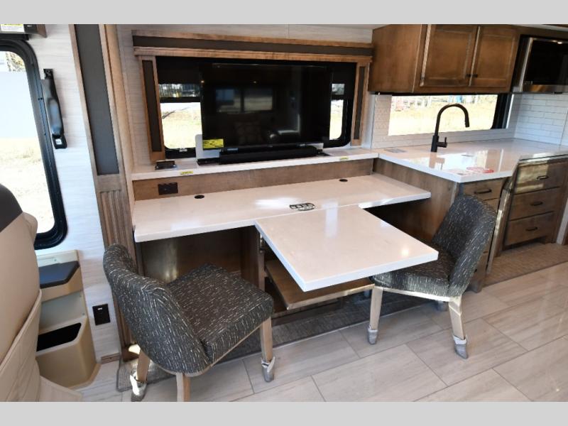 Smart living meets convenience with a stacked washer/dryer, hydronic heating with electric appliances, power drop-down bunk, dinette bar, central vacuum system, and extended cycle batteries. Technology keeps you connected with in-dash navigation, Wi-Fi booster, tire pressure sensing, and prep for satellite internet. With dual 15K LP A/C units with heat pump, Freightliner chassis with RoadWatch, and electronic stability/traction control, every drive is smooth, safe, and confident.