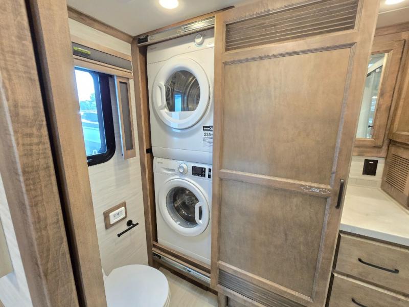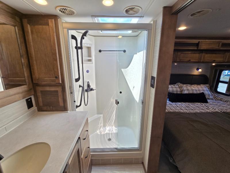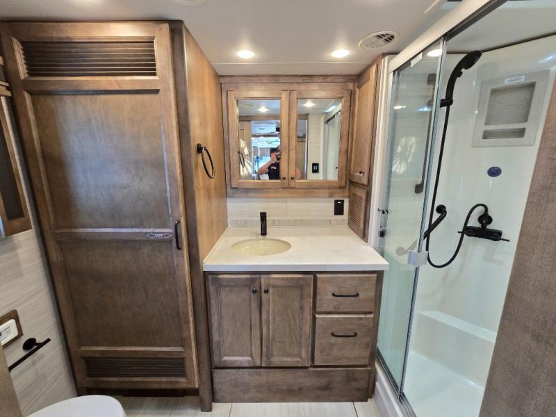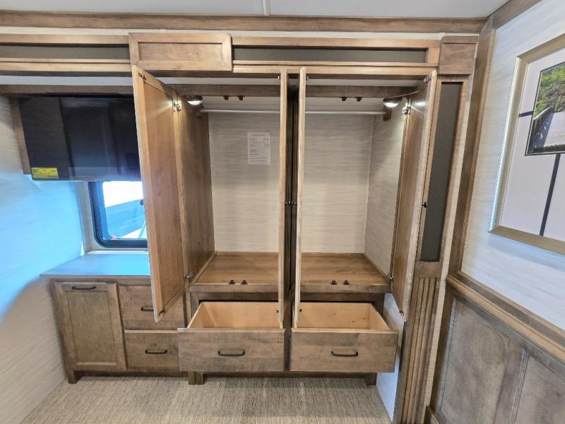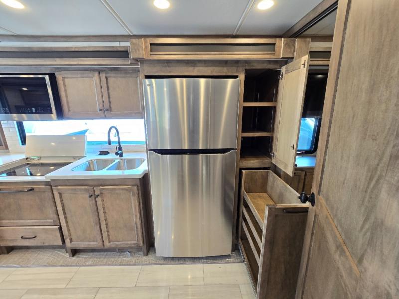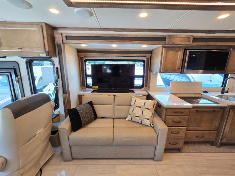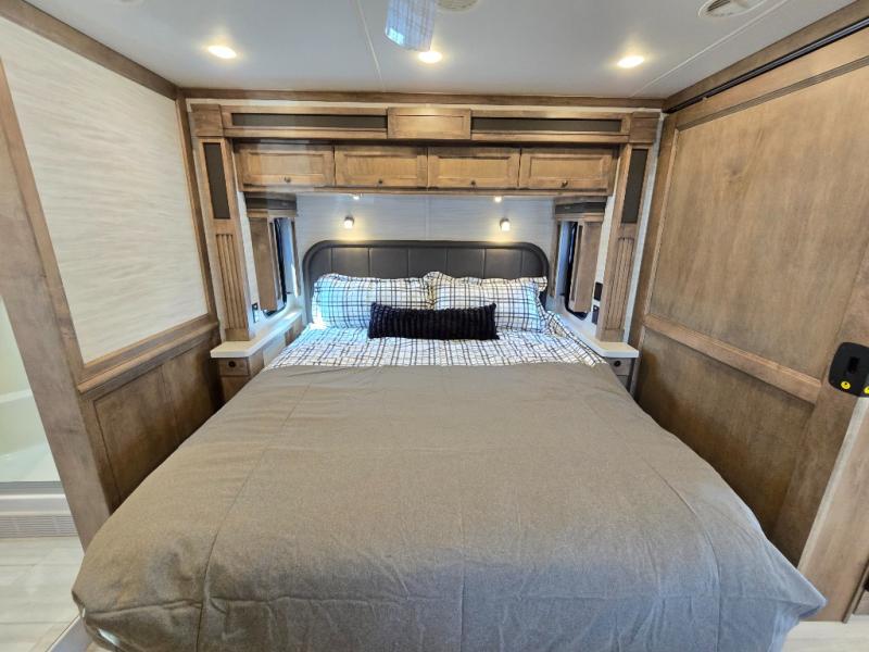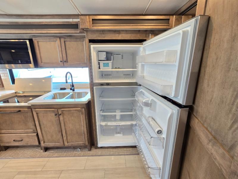 If luxury is what you want, luxury is what you'll get with this Allegro RED Class A diesel motorhome! Glamorous furnishings and high-class style are included all throughout this coach. One of the best features is going to be the master suite. This space has a private bedroom connected to its own private bathroom. The king bed slide sits across from the full-wall slide, so there is plenty of space to change your clothes and just relax. There is a TV next to the wardrobe and across from the bed for easy viewing at night, and the bathroom has a place for the optional washer/dryer to be added. Out in the main living area, the rest of your traveling companions can use the half bathroom to clean up, and there is plenty of seating for everyone to lounge on with the booth dinette sleeper and two sofas. If you would like to have more sleeping space, you can add the optional drop-down bunk above the cab.