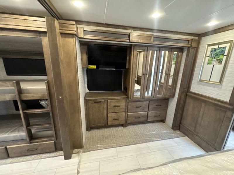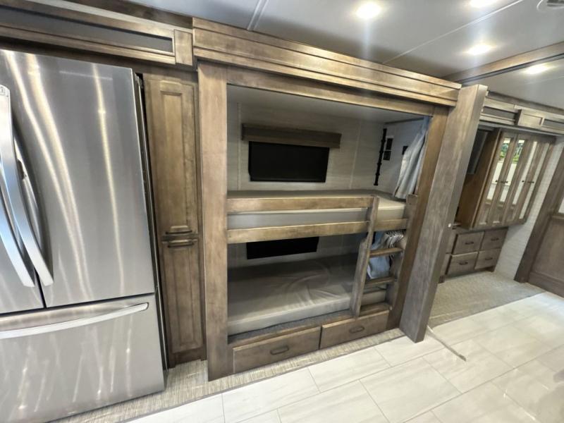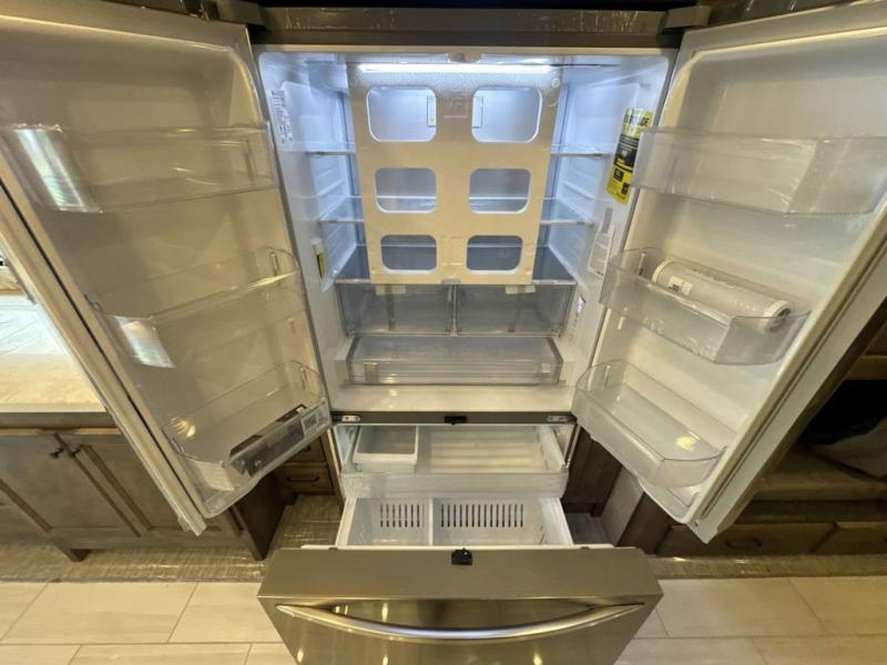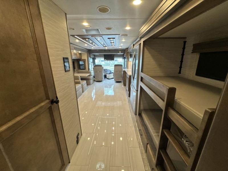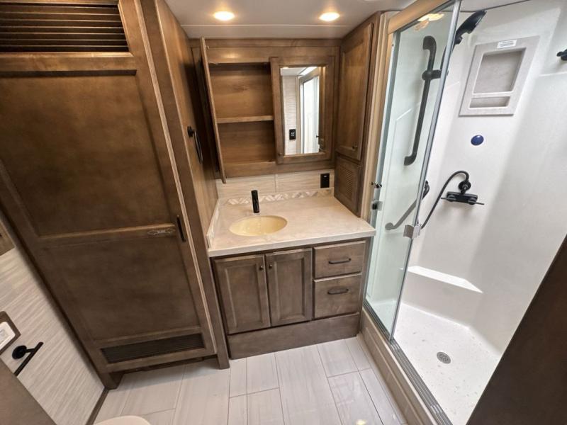 Don't be surprised if you never want to leave this Allegro RED Class A diesel motorhome! You have an excellent amount of sleeping space with the king bed slide, air coil sofa, booth dinette sleeper, and 28" x 70" bunk beds, but if you would like to have even more sleeping space, you can also add the optional drop-down bunk above the cab. The other thing you have quite a lot of is entertainment. There are three TVs, a centralized entertainment center with Blu-Ray player, and a sound bar sound system with the living area TV. The kitchen has all of the tools needed to prepare delicious meals while you're out and about, and you will be able to store all of those meal ingredients in the pantry and 23 cu. ft. stainless steel residential refrigerator with French doors and bottom freezer. Another feature that makes this coach comfortable is the full and half bathroom. The half bath is located out in the main living area for all, and the full bathroom rests inside the master suite in the back.