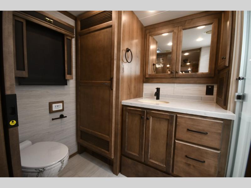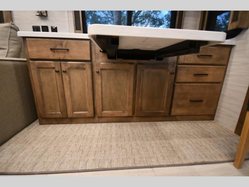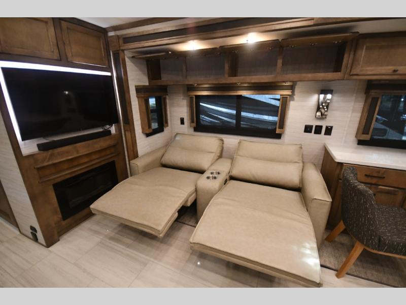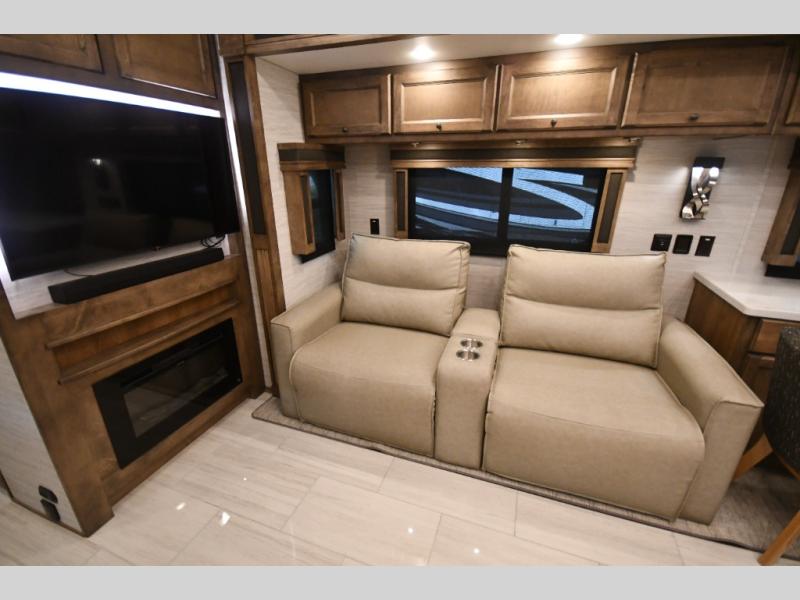 The 38 KA floorplan maximizes interior space with multiple slide-outs, creating an open-concept living area perfect for entertaining or relaxing after a day on the road.