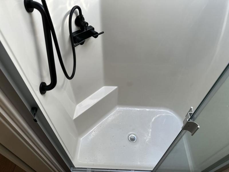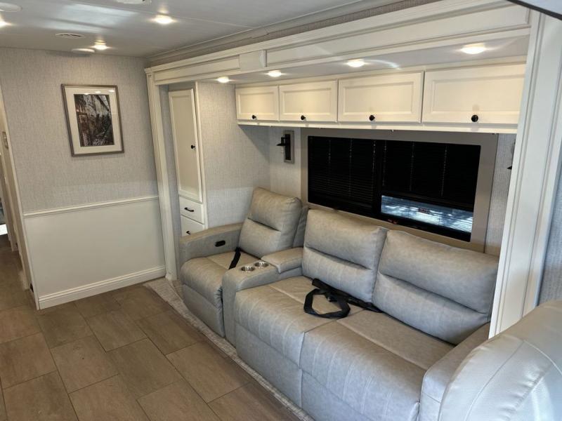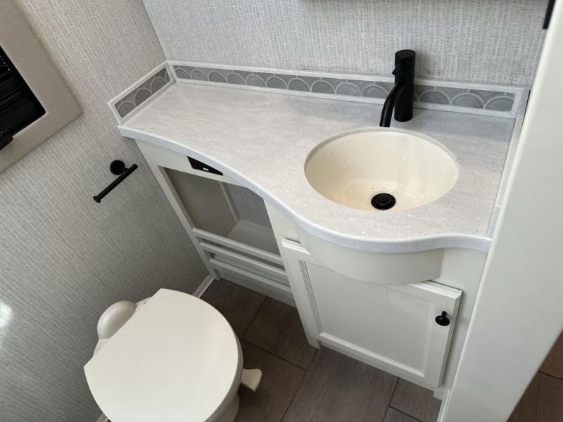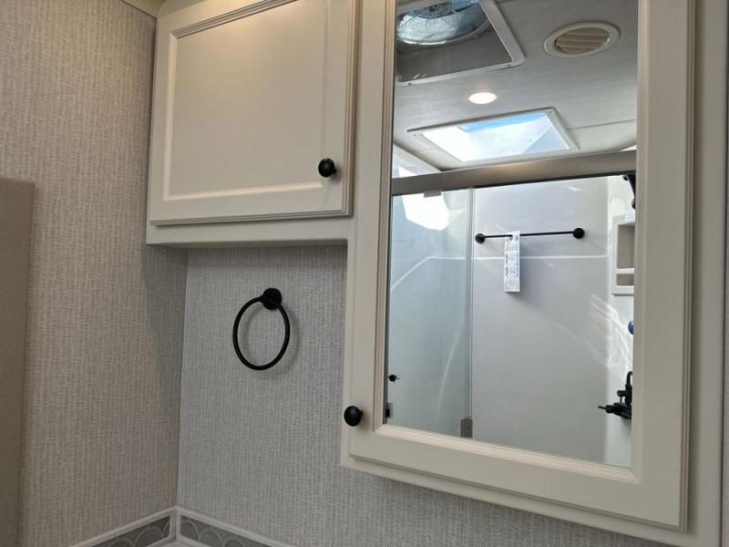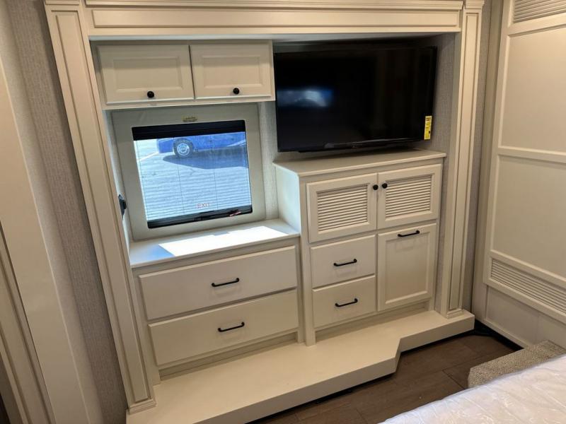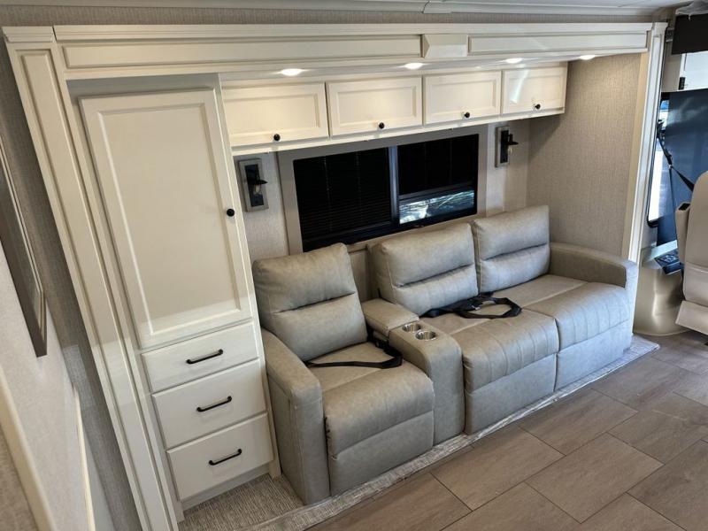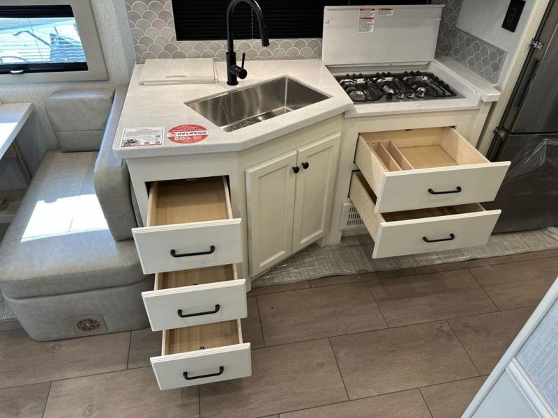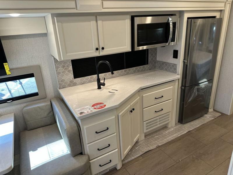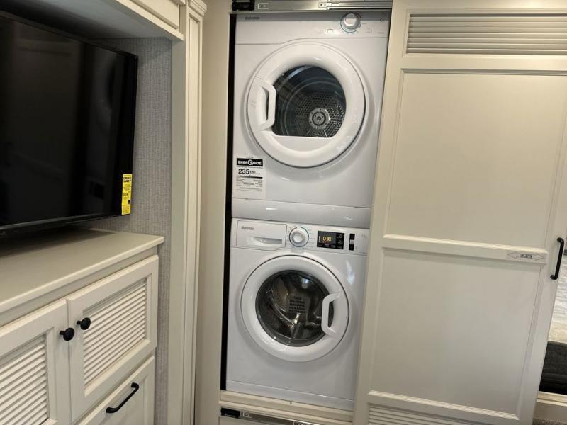 If you've been in the market for a coach with added interior space and at-home comforts, look no further than this Byway! The super sofa and booth dinette sleeper will provide cozy seating space plus additional sleeping spaces for your guests. If you need even more, just choose the optional drop-down front bunk! The kitchen includes everything you need to prepare meals each day, including a 1.5 cu. ft. Smart convection microwave, task lighting, and a 18 cu. ft. residential refrigerator with a bottom freezer. The mid coach full bath lets you stay clean throughout each trip, and the rear private bedroom will be your own oasis at night. Here, you'll find a king bed slide out with nightstands on either side, a mounted TV, a spacious wardrobe, plus stacked washer/dryer prep if you want the option for easy wash days!