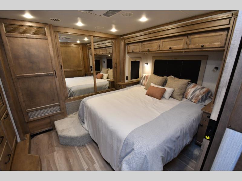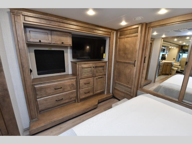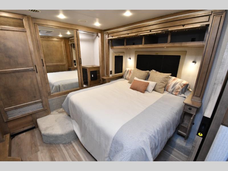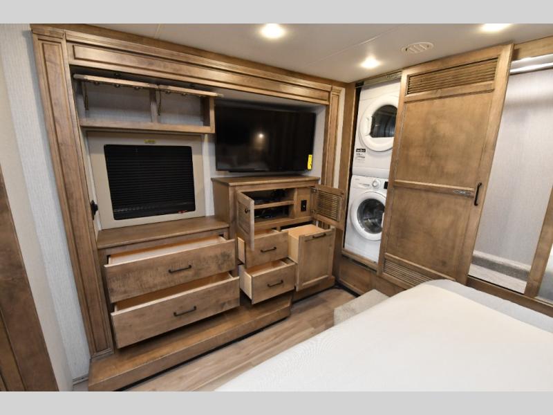 At the rear, the private bedroom provides a king bed slide, nightstands, a mounted TV, and a wardrobe with stacked washer/dryer prep for added convenience. The mid-coach full bath features a dual-sink vanity and Showermiser water-saving technology, while outdoor entertainment comes alive with the exterior TV, Girard power awning, and prep for satellite and WiFi boosters. High-end systems like dual 15,000 BTU A/C with heat pump, Truma water heater, hydraulic jacks, 8.0 kW Onan generator, and 2,000-watt inverter ensure year-round comfort and peace of mind on every journey.