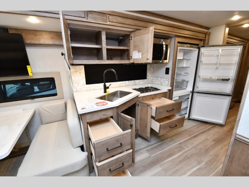 Step inside the 2026 Tiffin Byway 33 FL and experience a Class A diesel motorhome designed for comfort, convenience, and adventure. With four expansive slide-outs, a thoughtfully designed interior, and high-end finishes like Sandstone cabinets and Desert Retreat décor, this coach delivers generous living space and flexible sleeping arrangements. The kitchen features a smart convection microwave, 18 cu. ft. residential refrigerator, and task lighting, while the booth dinette and super sofa provide space to relax, dine, or accommodate extra guests. Every detail, from Dune tile flooring to the Halo leather power driver and passenger seats, enhances your travel experience.