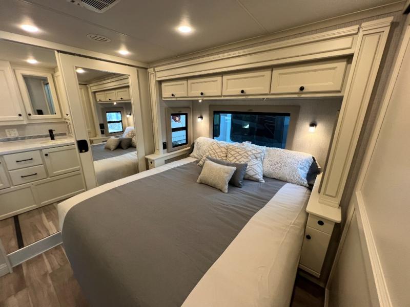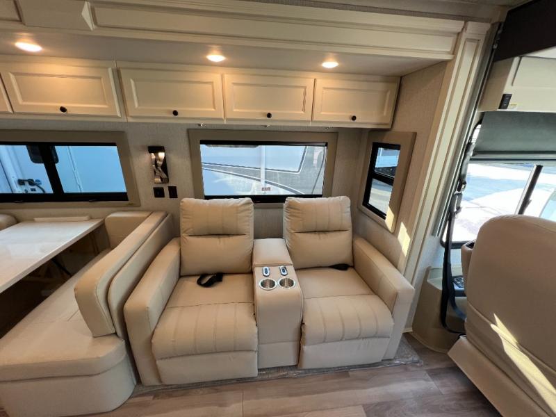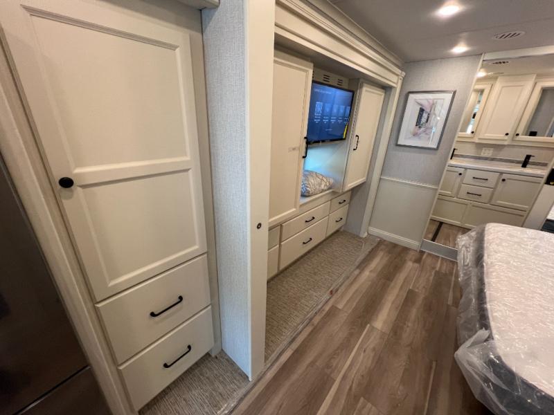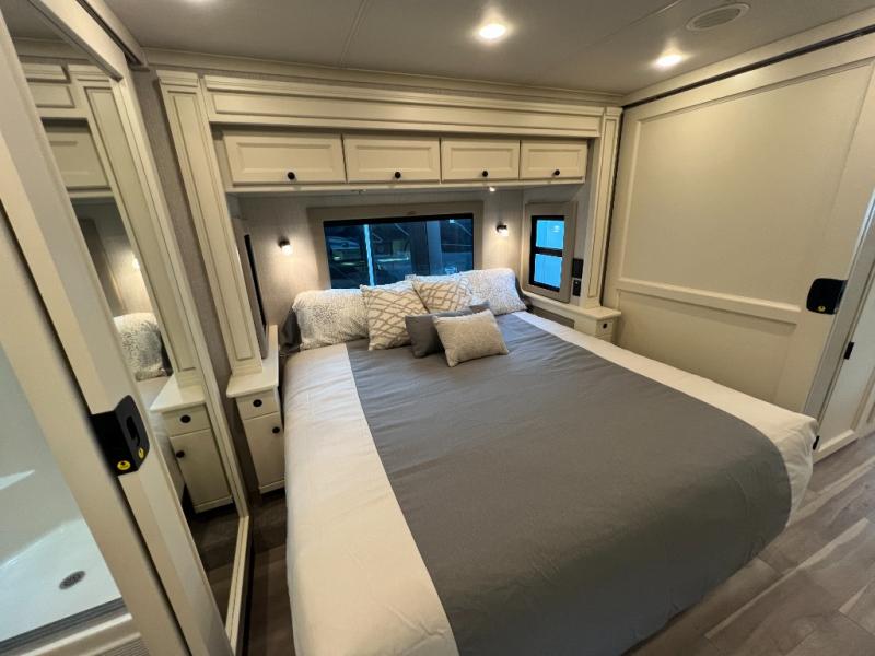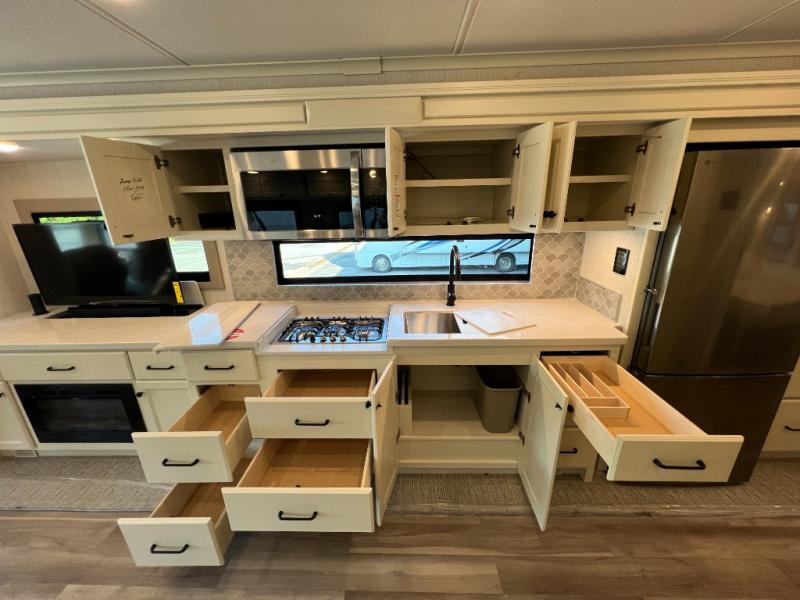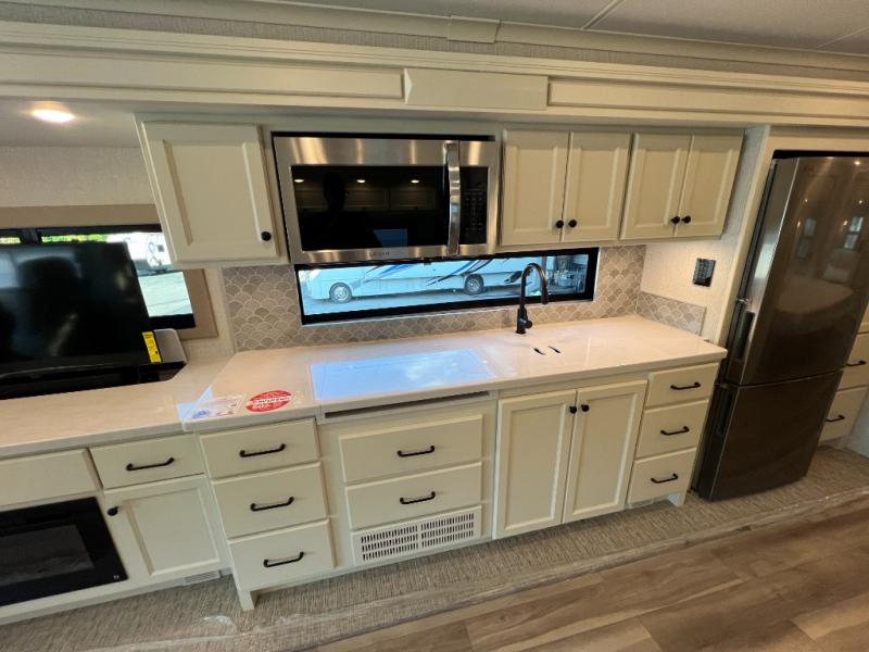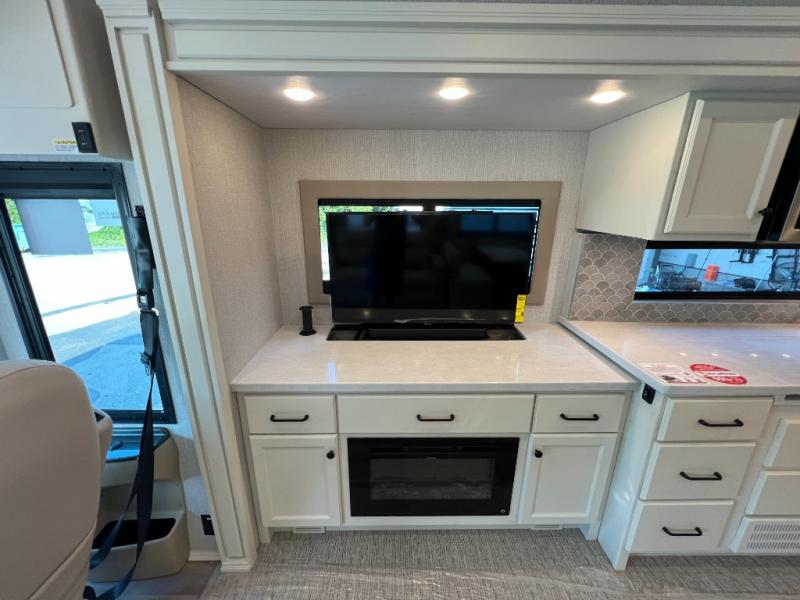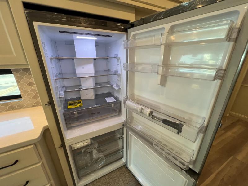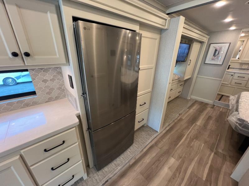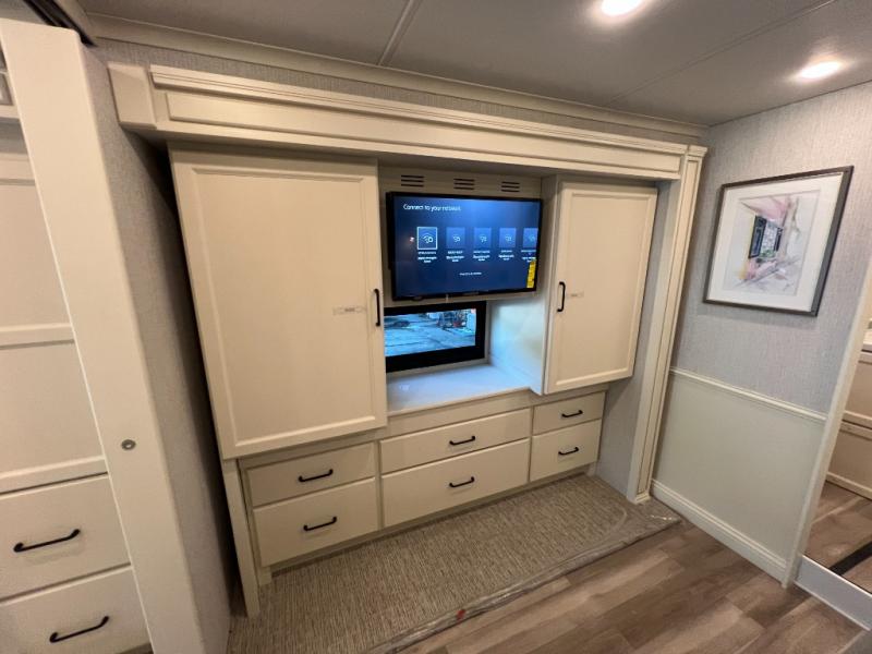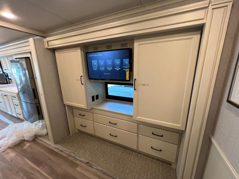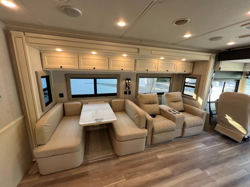 One step inside this spacious coach and you'll be sold! There is a bath and a half to make traveling with friends and family easier than ever. The full-wall slide will make your space feel more open, plus there is a king bed slide out and a third slide out so everyone is comfortable. This model includes theater seats, a lift TV within the entertainment center, along with drawer storage to keep movies organized, and an optional fireplace. You'll be pleasantly surprised by the full kitchen with its three burner cooktop, 1.5 cu. ft. Smart convection microwave, plus a pantry and 18 cu. ft. residential refrigerator with a bottom freezer to keep ice cream stocked up! When you're ready for some shut-eye, the master bedroom will be waiting for you, while your guests sleep on the booth dinette sleeper, or you can choose the optional drop-down front bunk for more sleeping space!