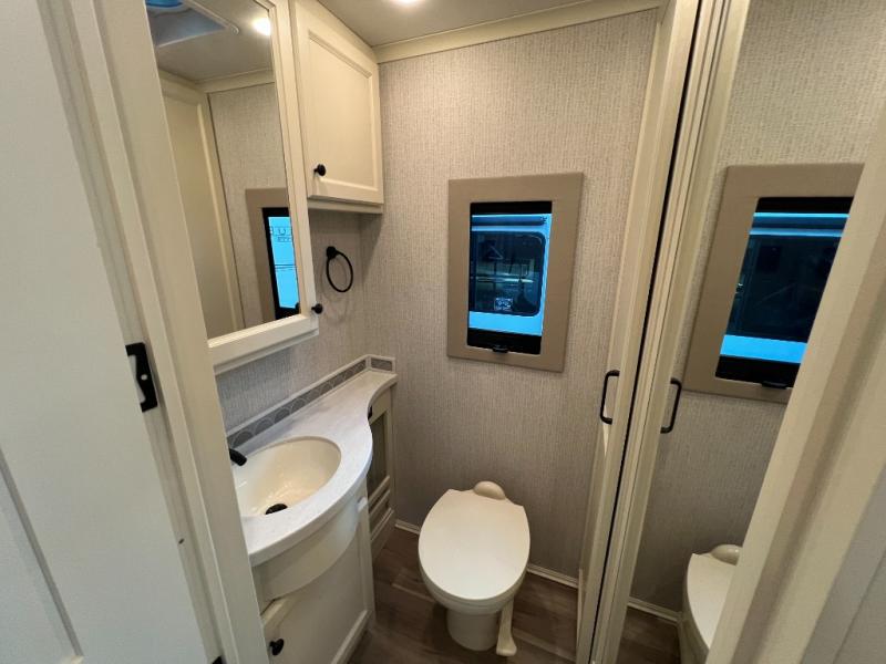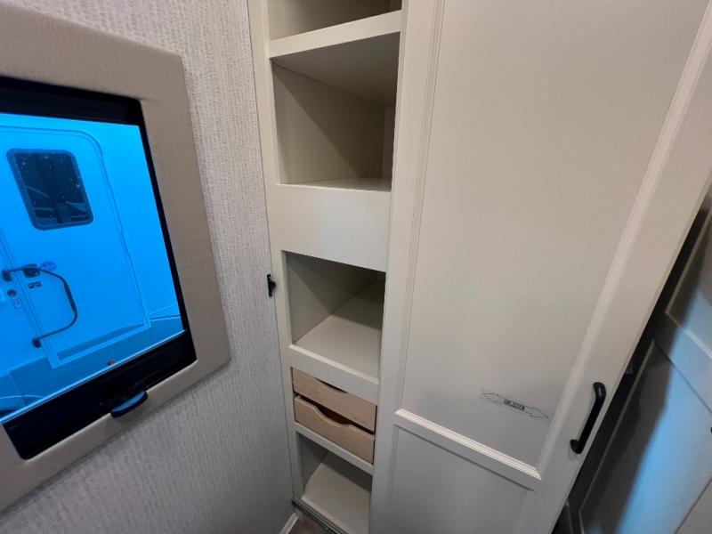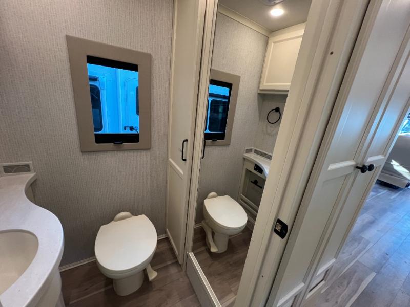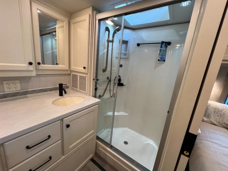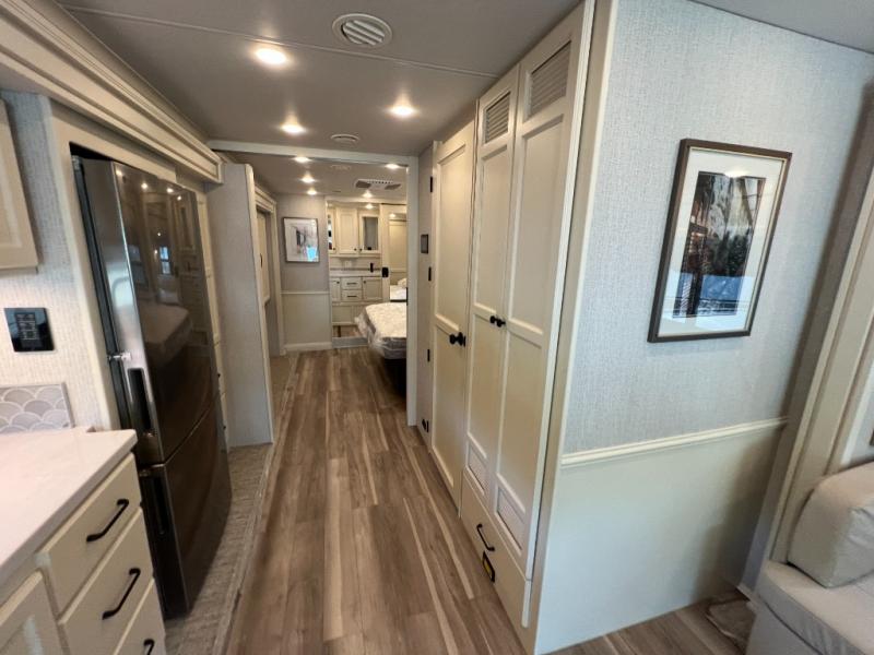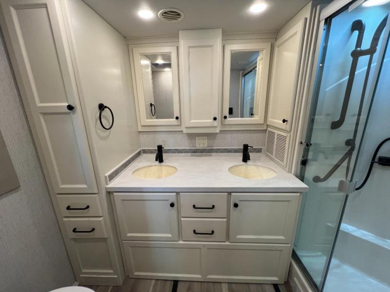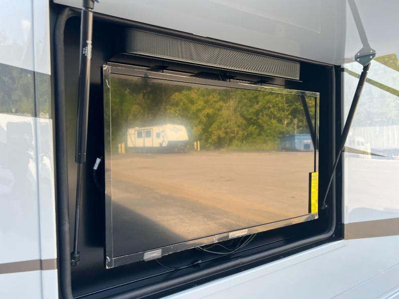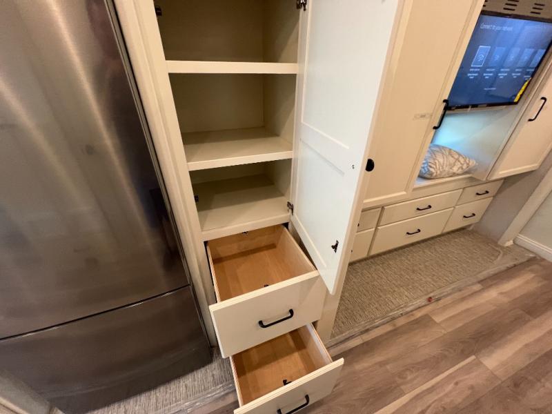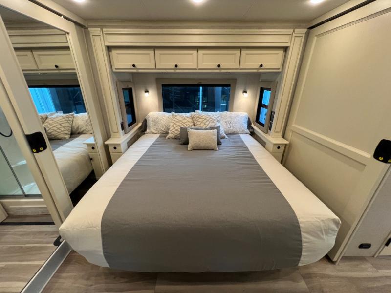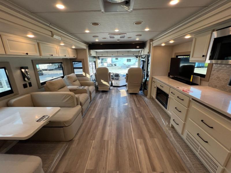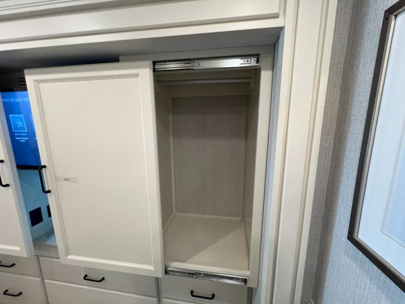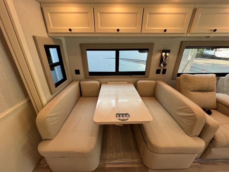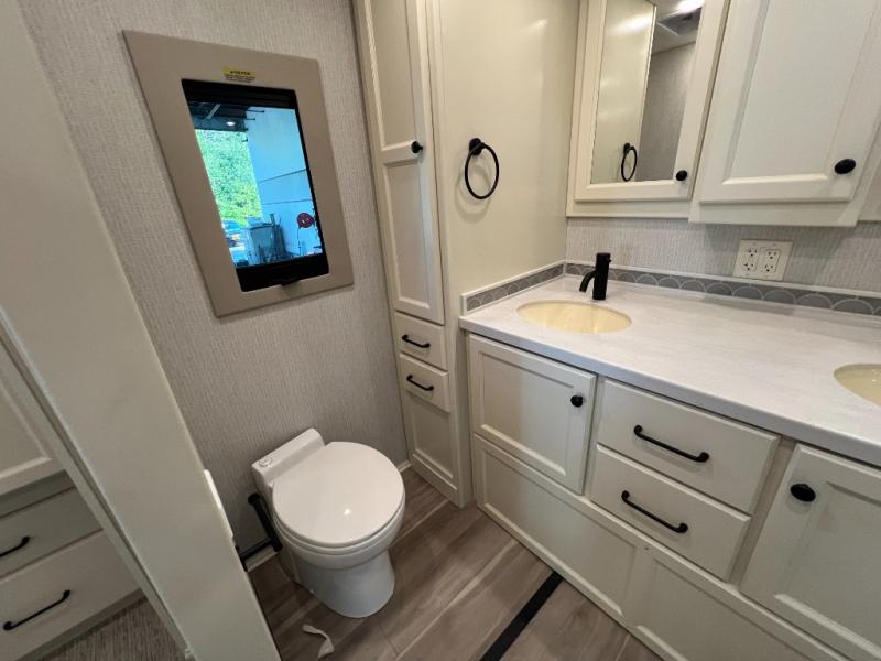 One step inside this spacious coach and you'll be sold! There is a bath and a half to make traveling with friends and family easier than ever. The full-wall slide will make your space feel more open, plus there is a king bed slide out and a third slide out so everyone is comfortable. This model includes theater seats, a lift TV within the entertainment center, along with drawer storage to keep movies organized, and an optional fireplace. You'll be pleasantly surprised by the full kitchen with its three burner cooktop, 1.5 cu. ft. Smart convection microwave, plus a pantry and 18 cu. ft. residential refrigerator with a bottom freezer to keep ice cream stocked up! When you're ready for some shut-eye, the master bedroom will be waiting for you, while your guests sleep on the booth dinette sleeper, or you can choose the optional drop-down front bunk for more sleeping space!