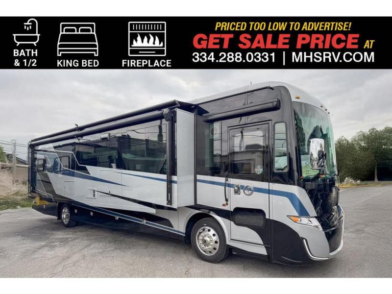One step inside this spacious coach and you'll be sold! There is a bath and a half to make traveling with friends and family easier than ever. The full-wall slide will make your space feel more open, plus there is a king bed slide out and a third slide out so everyone is comfortable. This model includes theater seats, a lift TV within the entertainment center, along with drawer storage to keep movies organized, and an optional fireplace. You'll be pleasantly surprised by the full kitchen with its three burner cooktop, 1.5 cu. ft. Smart convection microwave, plus a pantry and 18 cu. ft. residential refrigerator with a bottom freezer to keep ice cream stocked up! When you're ready for some shut-eye, the master bedroom will be waiting for you, while your guests sleep on the booth dinette sleeper, or you can choose the optional drop-down front bunk for more sleeping space!