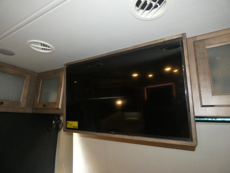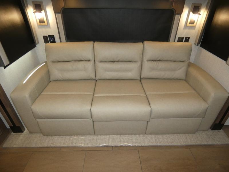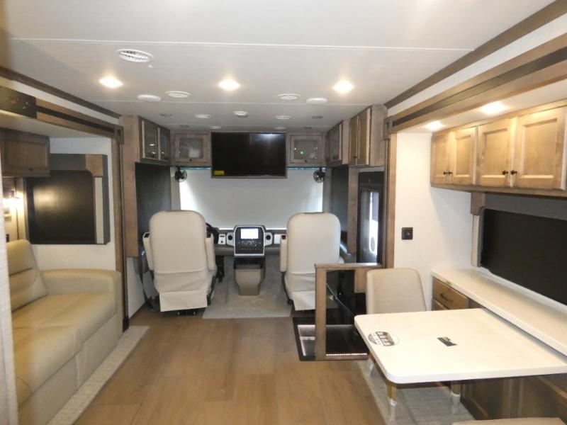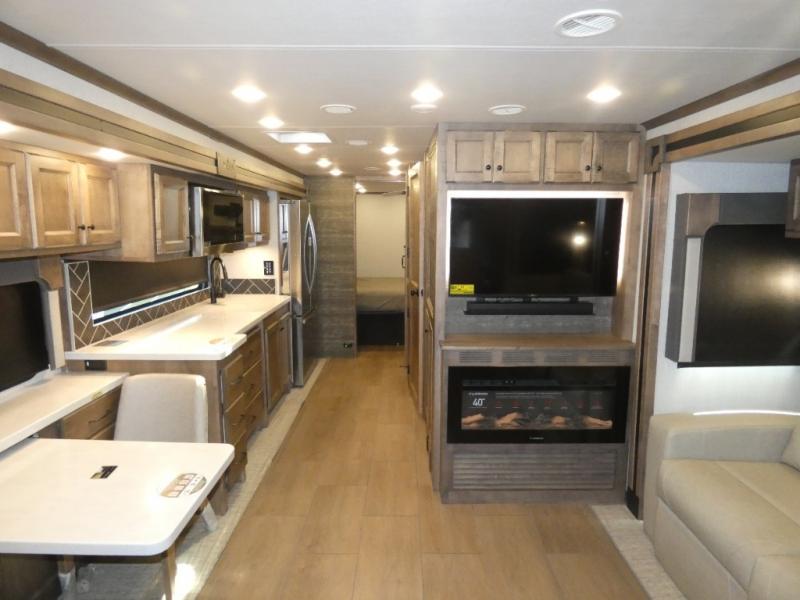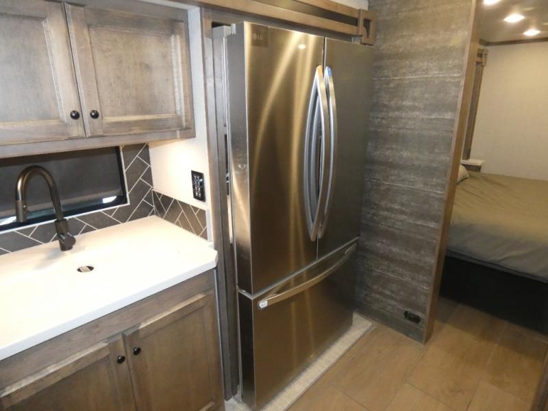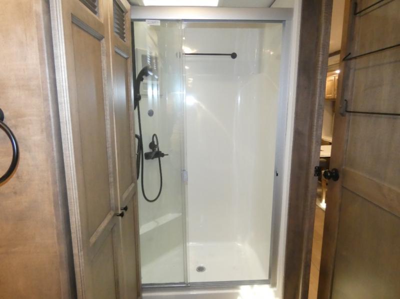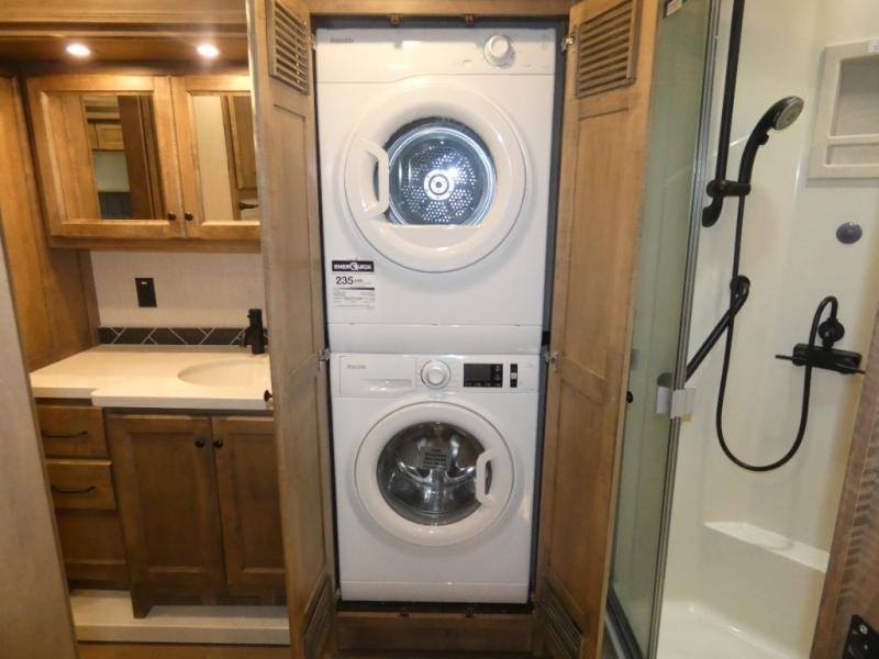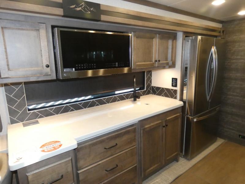 There are many standard luxurious features you will love about this motorhome! The queen bed slide in the rear private bedroom offers a comfortable place to sleep, as well as the flip and fold sofa bed in the living area. You will love the dinette bar with a lift TV, a flip-up countertop, and two chairs that will make this the perfect place to get some work done while you're on the road. The kitchen includes everything you need to prepare meals each day, including a 1.7 cu. ft. smart convection microwave with an air fryer, a three burner liquid propane cooktop, and a 23 cu. ft. stainless steel residential refrigerator with French doors and a bottom freezer. Head to the rear master bedroom with a queen bed slide out, a large wardrobe, a cabinet with a TV and drawers below, plus a private entrance into the dual entry bath!