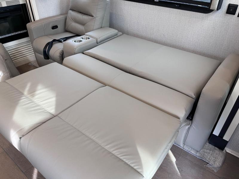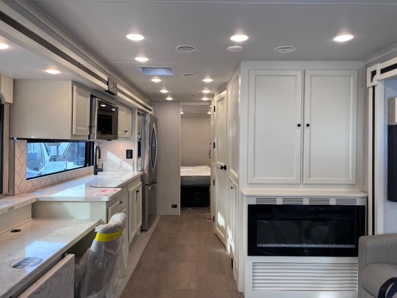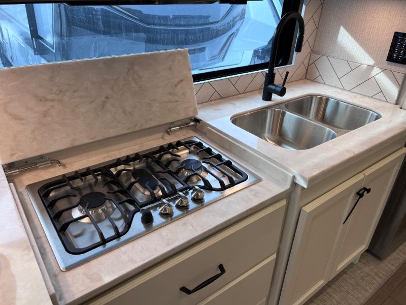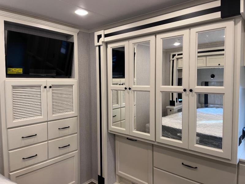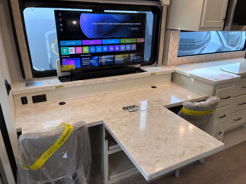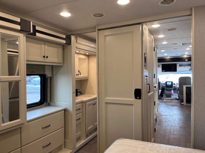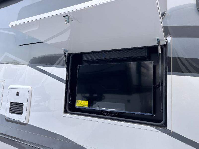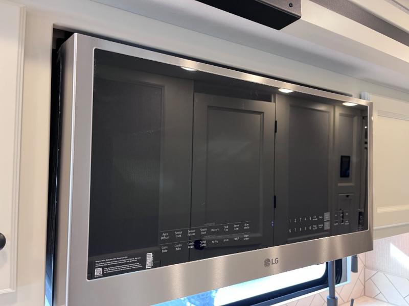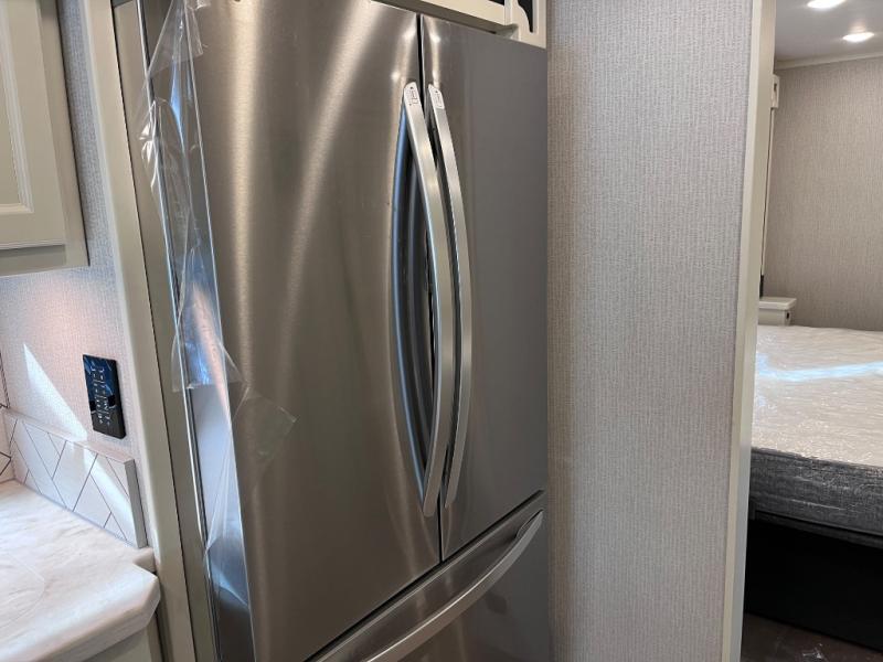 There are many standard luxurious features you will love about this motorhome! It also has many optional features you can add like the optional drop-down front bunk, the optional super sofa and the optional theater seating. The queen bed slide in the rear private bedroom offers a comfortable place to sleep, as well as the flip and fold sofa bed in the living area. You will love the dinette bar with a lift TV, a flip-up countertop, and two chairs that will make this the perfect place to get some work done while you're on the road. The kitchen includes everything you need to prepare meals each day, including a 1.7 cu. ft. smart convection microwave with an air fryer, a three burner liquid propane cooktop, and a 23 cu. ft. stainless steel residential refrigerator with French doors and a bottom freezer. Head to the rear master bedroom with a queen bed slide out, a large wardrobe, a cabinet with a TV and drawers below, plus a private entrance into the dual entry bath!
