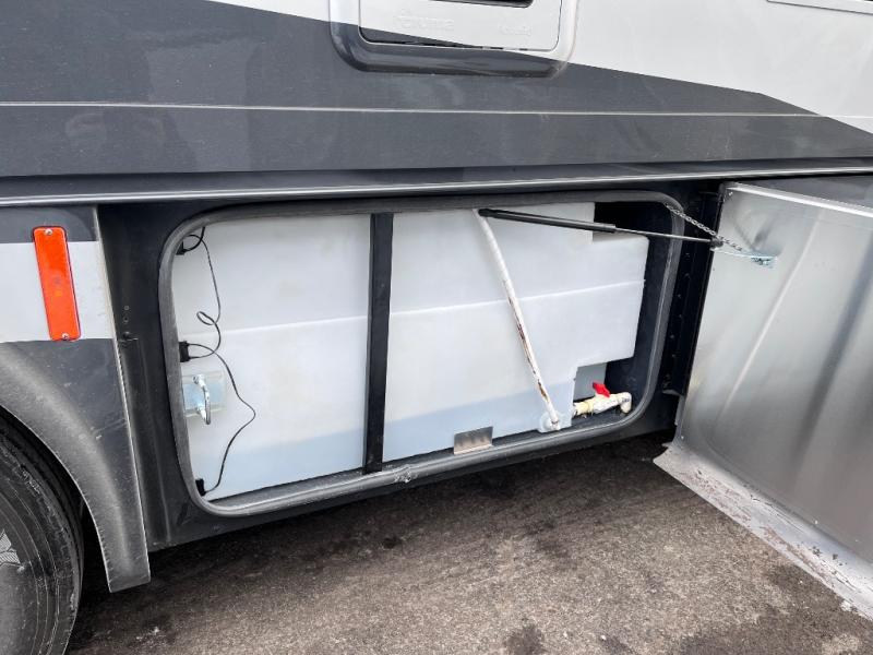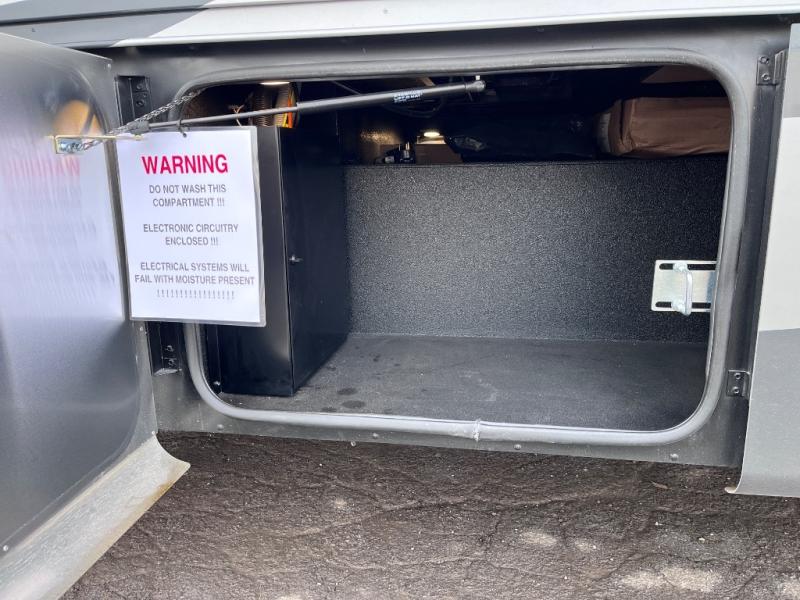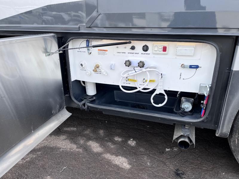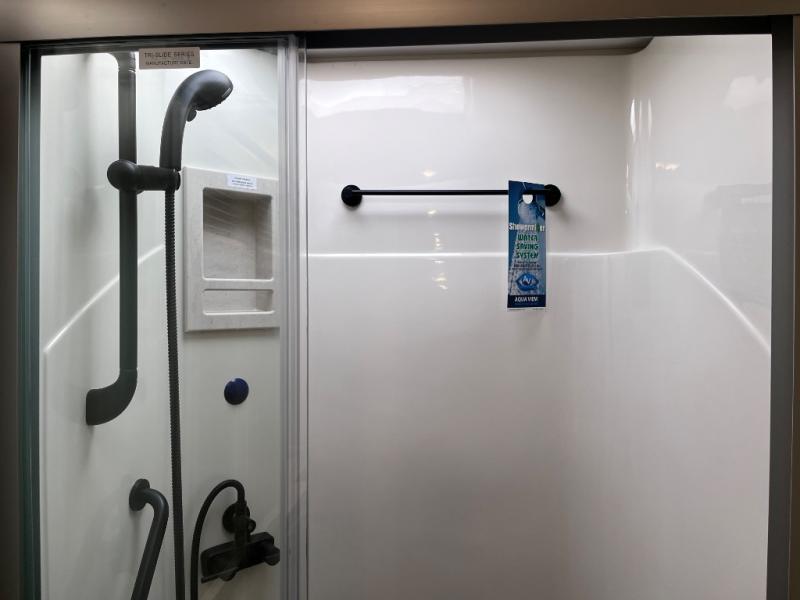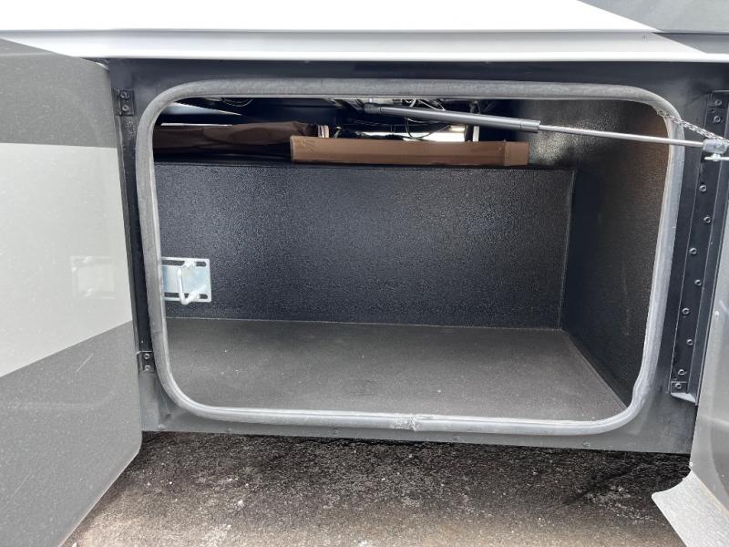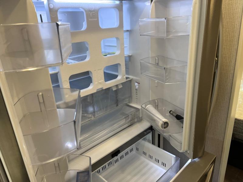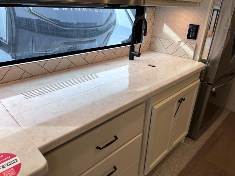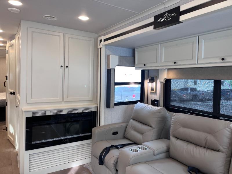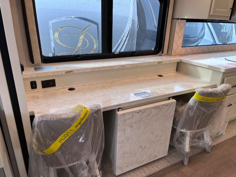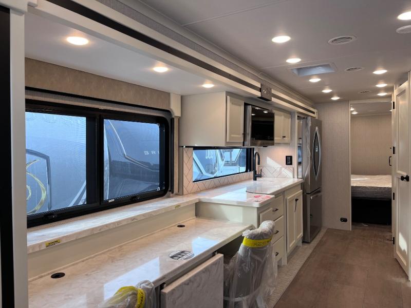 There are many standard luxurious features you will love about this motorhome! It also has many optional features you can add like the optional drop-down front bunk, the optional super sofa and the optional theater seating. The queen bed slide in the rear private bedroom offers a comfortable place to sleep, as well as the flip and fold sofa bed in the living area. You will love the dinette bar with a lift TV, a flip-up countertop, and two chairs that will make this the perfect place to get some work done while you're on the road. The kitchen includes everything you need to prepare meals each day, including a 1.7 cu. ft. smart convection microwave with an air fryer, a three burner liquid propane cooktop, and a 23 cu. ft. stainless steel residential refrigerator with French doors and a bottom freezer. Head to the rear master bedroom with a queen bed slide out, a large wardrobe, a cabinet with a TV and drawers below, plus a private entrance into the dual entry bath!